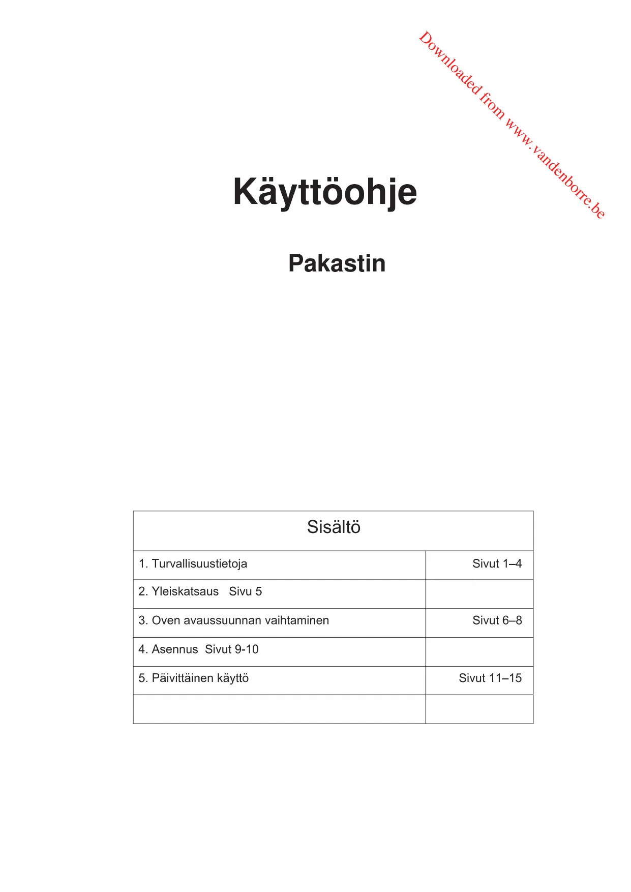 VAROITUS!Pidä laitteen kotelossa olevat tai sisäänrakennetut ilmanvaihtoaukot aina vapaina. VAROITUS!Älä käytä mekaanisia laitteita tai muita kuin valmistajan suosittelemia apuvälineitä sulatuksen nopeuttamiseen. VAROITUS!Älä vahingoita kylmäainepiiriä. Downloaded from www.vandenborre.beTurvallisuustietoja