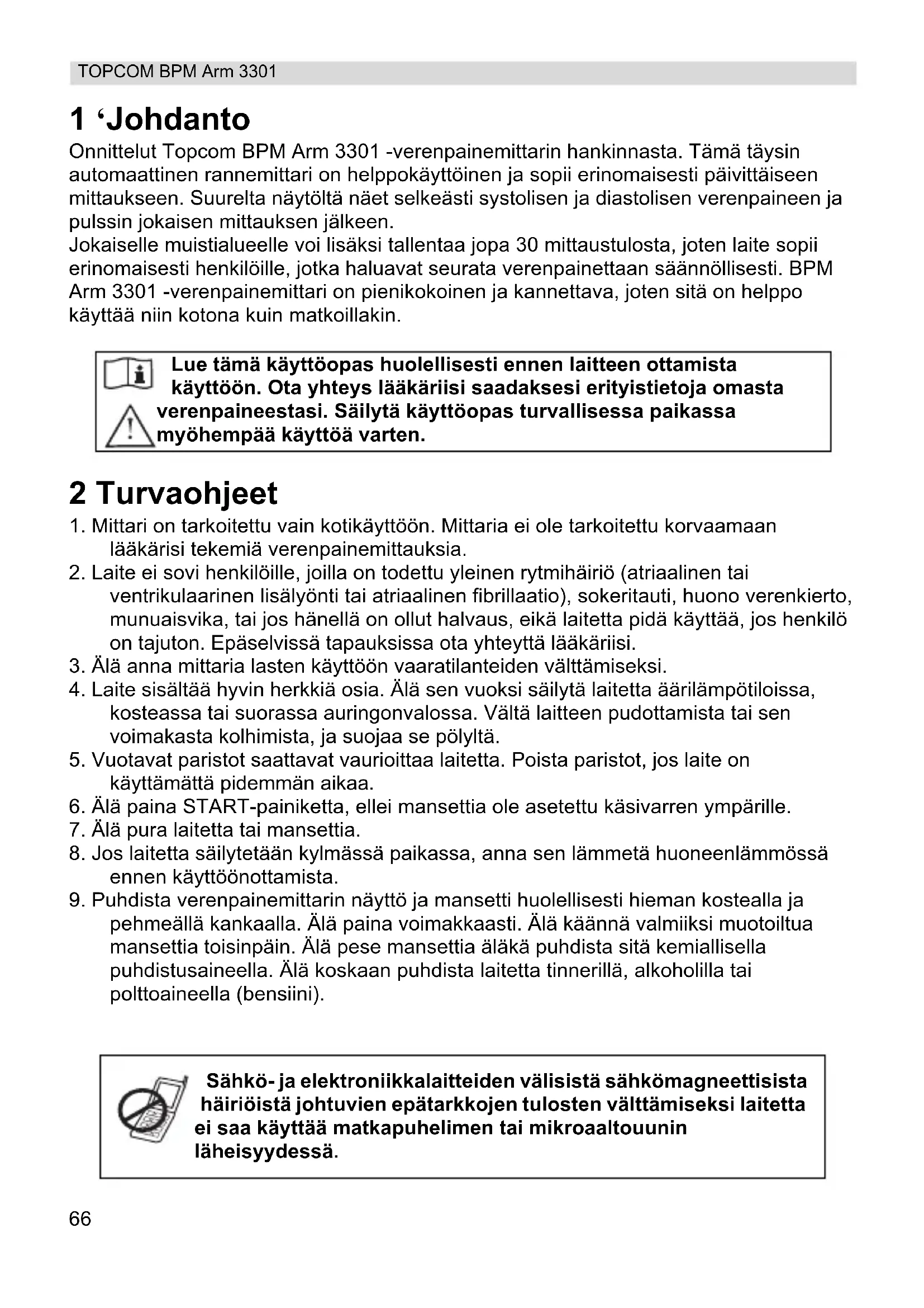 pehmeällä kankaalla. Älä paina voimakkaasti. Älä käännä valmiiksi muotoiltua mansettia toisinpäin. Älä pese mansettia äläkä puhdista sitä kemiallisella puhdistusaineella. Älä koskaan puhdista laitetta tinnerillä, alkoholilla tai polttoaineella (bensiini). Lue tämä käyttöopas huolellisesti ennen laitteen ottamista käyttöön. Ota yhteys lääkäriisi saadaksesi erityistietoja omasta verenpaineestasi. Säilytä käyttöopas turvallisessa paikassa myöhempää käyttöä varten. Sähkö- ja elektroniikkalaitteiden välisistä sähkömagneettisista häiriöistä johtuvien epätarkkojen tulosten välttämiseksi laitetta ei saa käyttää matkapuhelimen tai mikroaaltouunin läheisyydessä.67 SUOMI TOPCOM BPM Arm 3301 3 Hyödyllisiä vinkkejä Tässä muutamia hyödyllisiä vinkkejä, joiden avulla saat tarkempia mittaustuloksia: