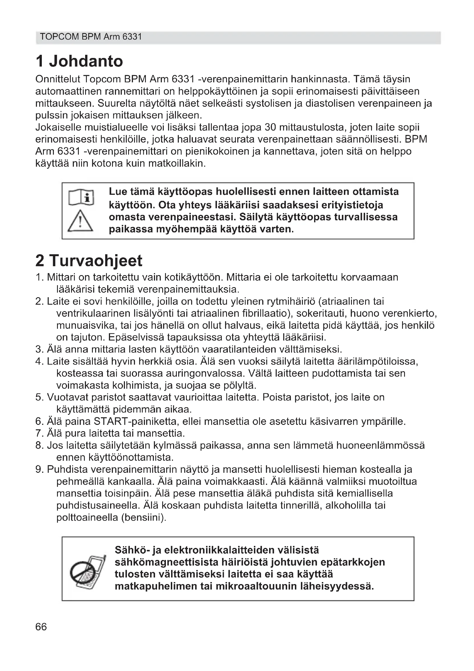 TOPCOM BPM Arm 6331 1 Johdanto Onnittelut Topcom BPM Arm 6331 -verenpainemittarin hankinnasta. Tämä täysin automaattinen rannemittari on helppokäyttöinen ja sopii erinomaisesti päivittäiseen mittaukseen. Suurelta näytöltä näet selkeästi systolisen ja diastolisen verenpaineen ja pulssin jokaisen mittauksen jälkeen. Jokaiselle muistialueelle voi lisäksi tallentaa jopa 30 mittaustulosta, joten laite sopii erinomaisesti henkilöille, jotka haluavat seurata verenpainettaan säännöllisesti. BPM Arm 6331 -verenpainemittari on pienikokoinen ja kannettava, joten sitä on helppo käyttää niin kotona kuin matkoillakin. 2 Turvaohjeet