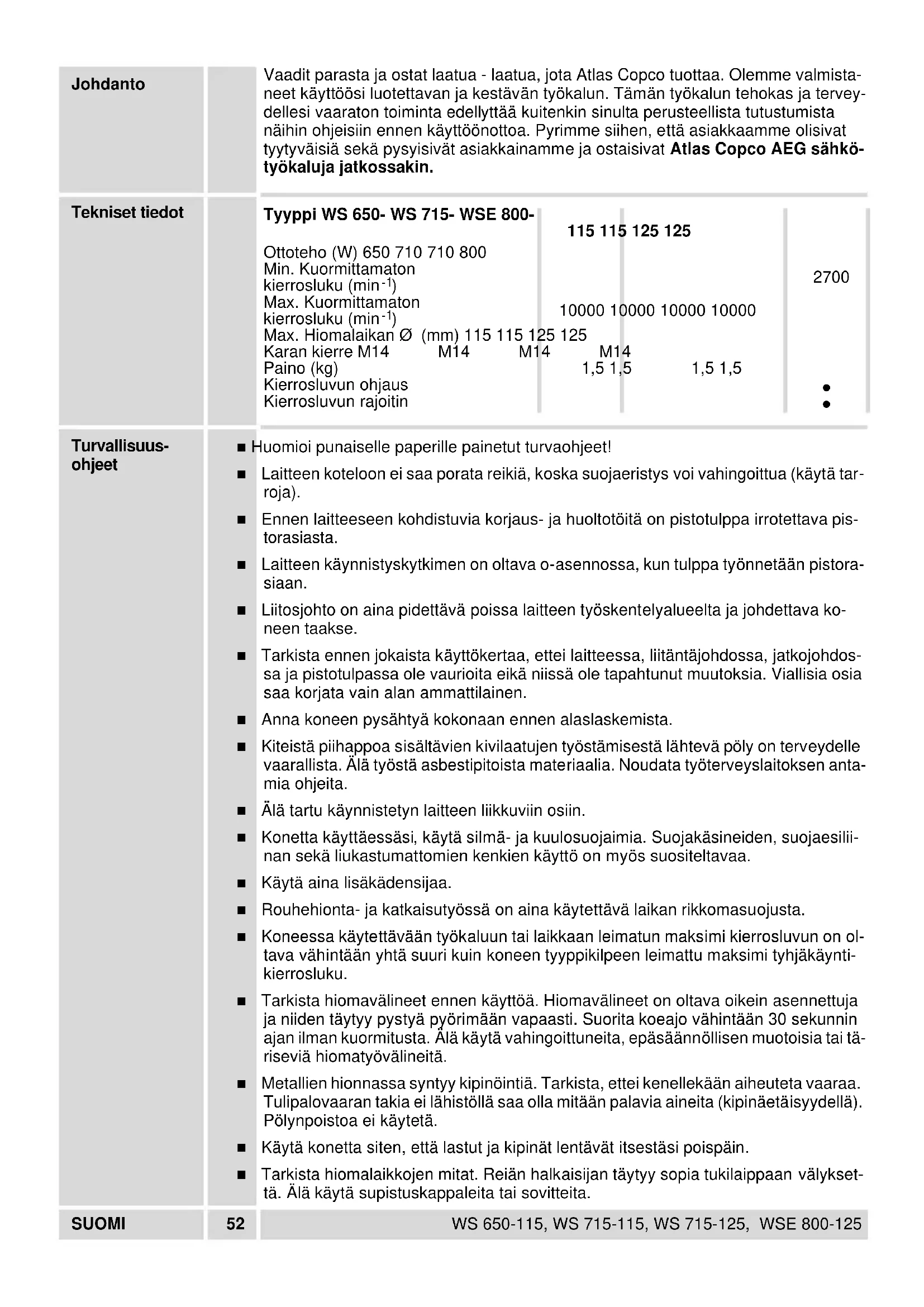 Ge akt på att greppöglan på FIXTEC-snabbspännmuttern endast höjs då den dras åt och lossas. Flänsmutter Flänsmuttern öppnas respektive åtdrages med en flänsnyckel.SVENSKA 51 WS 650-115, WS 715-115, WS 715-125, WSE 800-125 Arbets- anvisningar Vid slipning skall man inte pressa mot arbetsstycket, utan låta slipskivan röra sig jämnt över arbetsstycket. Grovslipning Den bästa verkningsgraden vid grovslipning uppnås när slipskivan ställes i en vinkel av minst 30° mot slipytan. Alltför stark belastning under slipningen skadar vinkelslipen och höjer slipskivför- brukningen, samt slipresultatet blir sämre. Använd aldrig kapskivor för grovslipning. Tryckbelasta inte kapskivorna från sidan. Kapning Vid kaparbeten får inte vinkelslipen förskjutas i förhållande till slipytan. Kapskivan måste uppvisa en ren snittkant. För kapning av sten måste styrsläde användas. Ytslipning För ytslipning användes plastsliptallrikar med slippapper. För avlägsnande av rost eller gammal färg passar ståltrådsborste. Service Håll alltid maskinen och ventilationsöppningarna rena. Använd endast AEG tillbehör och reservdelar. Byggdelar vars utbyte ej beskrives ut- växlas bäst av AEG auktoriserad serviceverkstad (beakta broschyrer Garanti/Kund- tjänstadresser). Vid behov av sprängskiss, kan en sådan, genom att uppge maskinens art. nr. (som finns på typskylten) erhållas från: Atlas Copco Electric Tools GmbH, Postfach 320, D-71361 Winnenden. Tillbehör Ett urval av tillbehör på sidorna 2-3. Ytterligare tillbehör finns med beställningsnum- mer i vår katalog.SUOMI 52 WS 650-115, WS 715-115, WS 715-125, WSE 800-125 Johdanto Vaadit parasta ja ostat laatua - laatua, jota Atlas Copco tuottaa. Olemme valmista- neet käyttöösi luotettavan ja kestävän työkalun. Tämän työkalun tehokas ja tervey- dellesi vaaraton toiminta edellyttää kuitenkin sinulta perusteellista tutustumista näihin ohjeisiin ennen käyttöönottoa. Pyrimme siihen, että asiakkaamme olisivat tyytyväisiä sekä pysyisivät asiakkainamme ja ostaisivat Atlas Copco AEG sähkö- työkaluja jatkossakin. Tekniset tiedot Turvallisuus- ohjeet ■ Huomioi punaiselle paperille painetut turvaohjeet! ■ Laitteen koteloon ei saa porata reikiä, koska suojaeristys voi vahingoittua (käytä tar- roja). ■ Ennen laitteeseen kohdistuvia korjaus- ja huoltotöitä on pistotulppa irrotettava pis- torasiasta. ■ Laitteen käynnistyskytkimen on oltava o-asennossa, kun tulppa työnnetään pistora- siaan. ■ Liitosjohto on aina pidettävä poissa laitteen työskentelyalueelta ja johdettava ko- neen taakse. ■ Tarkista ennen jokaista käyttökertaa, ettei laitteessa, liitäntäjohdossa, jatkojohdos- sa ja pistotulpassa ole vaurioita eikä niissä ole tapahtunut muutoksia. Viallisia osia saa korjata vain alan ammattilainen. ■ Anna koneen pysähtyä kokonaan ennen alaslaskemista. ■ Kiteistä piihappoa sisältävien kivilaatujen työstämisestä lähtevä pöly on terveydelle vaarallista. Älä työstä asbestipitoista materiaalia. Noudata työterveyslaitoksen anta- mia ohjeita. ■ Älä tartu käynnistetyn laitteen liikkuviin osiin. ■ Konetta käyttäessäsi, käytä silmä- ja kuulosuojaimia. Suojakäsineiden, suojaesilii- nan sekä liukastumattomien kenkien käyttö on myös suositeltavaa. ■ Käytä aina lisäkädensijaa. ■ Rouhehionta- ja katkaisutyössä on aina käytettävä laikan rikkomasuojusta. ■ Koneessa käytettävään työkaluun tai laikkaan leimatun maksimi kierrosluvun on ol- tava vähintään yhtä suuri kuin koneen tyyppikilpeen leimattu maksimi tyhjäkäynti- kierrosluku. ■ Tarkista hiomavälineet ennen käyttöä. Hiomavälineet on oltava oikein asennettuja ja niiden täytyy pystyä pyörimään vapaasti. Suorita koeajo vähintään 30 sekunnin ajan ilman kuormitusta. Älä käytä vahingoittuneita, epäsäännöllisen muotoisia tai tä- riseviä hiomatyövälineitä. ■ Metallien hionnassa syntyy kipinöintiä. Tarkista, ettei kenellekään aiheuteta vaaraa. Tulipalovaaran takia ei lähistöllä saa olla mitään palavia aineita (kipinäetäisyydellä). Pölynpoistoa ei käytetä. ■ Käytä konetta siten, että lastut ja kipinät lentävät itsestäsi poispäin. ■ Tarkista hiomalaikkojen mitat. Reiän halkaisijan täytyy sopia tukilaippaan välykset- tä. Älä käytä supistuskappaleita tai sovitteita. Tyyppi WS 650- WS 715- WSE 800-