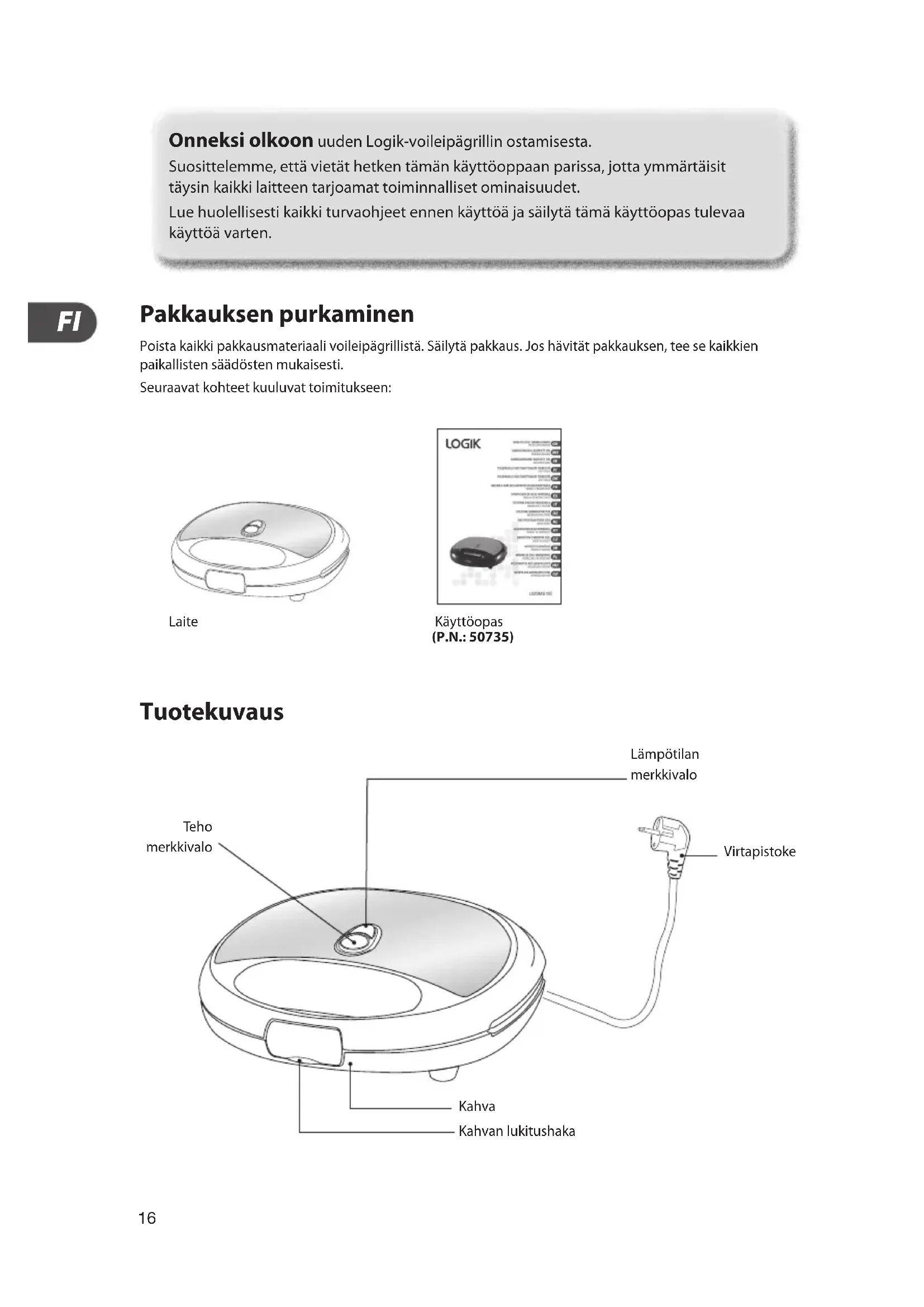 Pakkauksen purkaminen Poista kaikki pakkausmateriaali voileipägrillistä. Säilytä pakkaus. Jos hävität pakkauksen, tee se kaikkien paikallisten säädösten mukaisesti. Seuraavat kohteet kuuluvat toimitukseen: Käyttöopas (P.N.: 50735) Laite Tuotekuvaus Virtapistoke Teho merkkivalo Kahva Kahvan lukitushaka Lämpötilan merkkivalo Onneksi olkoon uuden Logik-voileipägrillin ostamisesta. Suosittelemme, että vietät hetken tämän käyttöoppaan parissa, jotta ymmärtäisit täysin kaikki laitteen tarjoamat toiminnalliset ominaisuudet. Lue huolellisesti kaikki turvaohjeet ennen käyttöä ja säilytä tämä käyttöopas tulevaa käyttöä varten.17