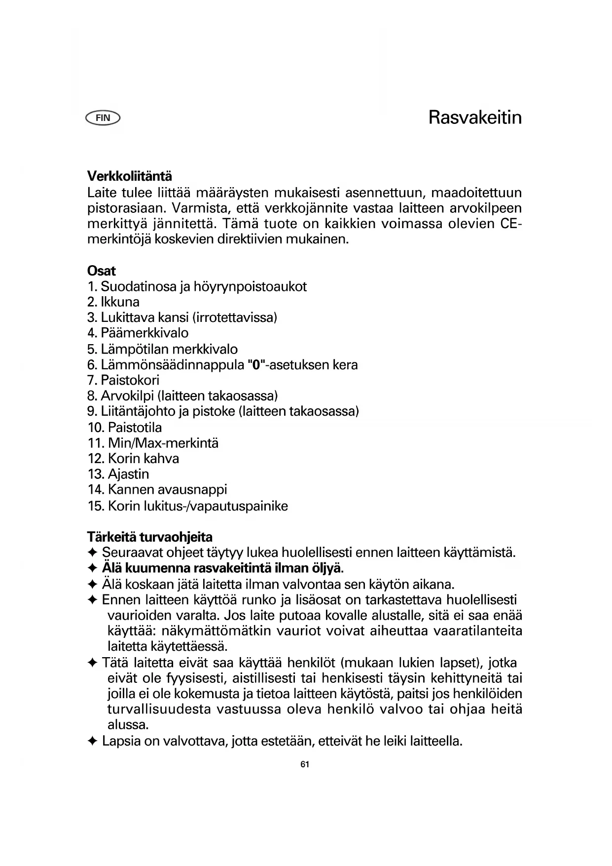 Rasvakeitin FIN✦ Pidä laitetta lämmön, roiskeiden ja tahran kestävällä työalustalla. Älä aseta laitetta seinäkaapin tai muun riippuvan esineen alle, eikä myöskään aivan seinän viereen tai nurkkaan. ✦ Liian useaan kertaan käytetty öljy saattaa syttyä tuleen, jos se kuumenee liikaa. Jos niin käy, irrota pistoke pistorasiasta ja laita kansi paistotilan päälle, jotta tuli sammuu. Älä koskaan kaada vettä kuumaan tai palavaan öljyyn/rasvaan. ✦ Älä koskaan kanna rasvakeitintä sen ollessa kuuma, esim. käytön aikana tai liian pian käytön jälkeen (kompastumisvaaran vuoksi). Äärimmäinen varovaisuus on tarpeen: Kuuma öljy voi aiheuttaa vakavia palovammoja. ✦ Turvaohjeita: Jotkut laitteen osista saattavat kuumeta käytön aikana ja kannen alta saattaa tulla vaarallisen kuumaa höyryä. ✦ Älä koske kuumaan öljyyn. ✦ Älä upota kuumaan öljyyn muovisia keittiövälineitä äläkä kaada kuumaa öljyä muoviastiaan. ✦ Älä upota laitetta veteen tai muuhun nesteeseen. ✦ Älä jätä liitäntäjohtoa roikkumaan äläkä anna sen koskettaa laitteen kuumia osia. ✦ Poista pistoke pistorasiasta aina käytön jälkeen ja myös - vian sattuessa - laitetta puhdistettaessa. ✦ Kun irrotat pistokkeen pistorasiasta, älä koskaan irrota sitä liitäntäjohdosta vetämällä, vaan tartu aina pistokkeesta. Älä anna liitäntäjohdon roikkua laitteesta. ✦ Tätä laitetta ei ole tarkoitettu käytettäväksi erillisen ajastimen tai kaukosäätimen kanssa. ✦ Jos laite vahingoittuu väärinkäytön seurauksena tai siksi, että annettuja ohjeita ei ole noudatettu, valmistaja ei vastaa aiheutuneista vahingoista. ✦ Laite on tarkoitettu ainoastaan kotitalouskäyttöön eikä sitä tule käyttää kaupallisiin tarkoituksiin. ✦ Turvallisuusmääräykset edellyttävät, että sähkölaitteen saa korjata ja liitäntäjohdon uusia ainoastaan sähköalan ammattilainen. Näin vältytään vaarallisilta tilanteilta. Jos laite vaatii huoltoa tai korjausta, ota yhteys valmistajan huoltopalveluun. Osoite löytyy tämän oppaan lopusta. 62Laitteen toiminta Kansi Avaa kansi painamalla avauspainiketta. Kannessa on jousitoiminto ja se nousee automaattisesti ylös painiketta painettaessa. Sulje kansi painamalla sitä alaspäin, kunnes se lukkiutuu paikoilleen. Kun avonainen kansi on pystysuorassa asennossa, sen voi irrottaa puhdistusta varten ylöspäin vetämällä. Ikkuna Uppopaistoprosessia voidaan valvoa ikkunan kautta. Höyryn muodostuminen sen pintaan estetään lisäämällä hieman öljyä ikkunan sisäpuolelle. Paistotila ✦ Täyttömäärä: Esikuumennusvaiheen aikana öljyn pinnan tason täytyy olla maksimi- ja minimimerkkien välissä. Ne löytyvät paistotilan sisältä sen takaosasta. Paistotilan enimmäistäyttömäärä (“Max”) on noin 2,5 litraa. ✦ Käytettävät öljy/rasvatyypit: Tässä rasvakeittimessä saa käyttää ainoastaan puhdasta kasviöljyä/kiinteää rasvaa. Ne voidaan kuumentaa 220