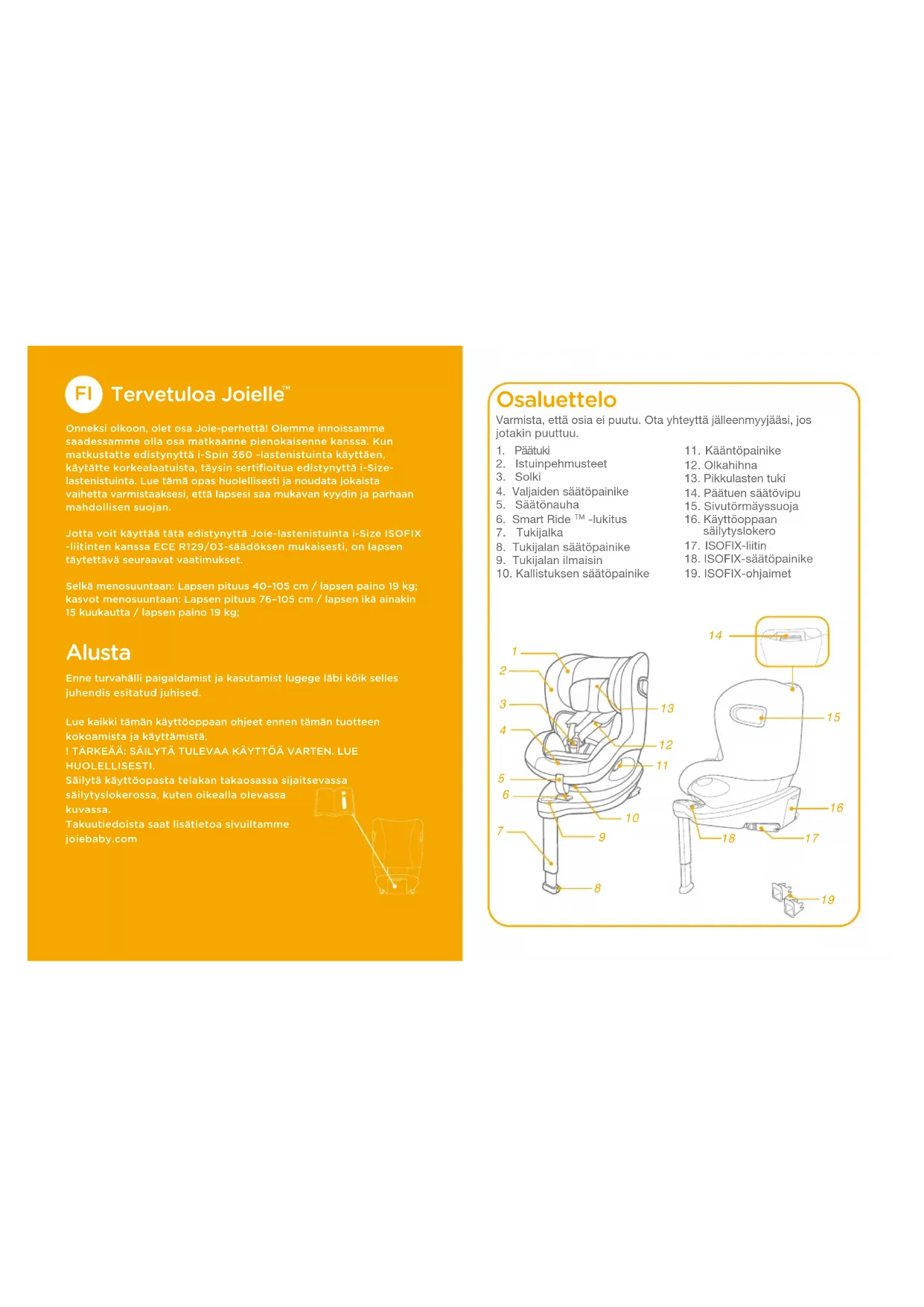 Onneksi olkoon, olet osa Joie-perhettä! Olemme innoissamme saadessamme olla osa matkaanne pienokaisenne kanssa. Kun matkustatte edistynyttä i-Spin 360 -lastenistuinta käyttäen, käytätte korkealaatuista, täysin sertifioitua edistynyttä i-Size-lastenistuinta. Lue tämä opas huolellisesti ja noudata jokaista vaihetta varmistaaksesi, että lapsesi saa mukavan kyydin ja parhaan mahdollisen suojan.Jotta voit käyttää tätä edistynyttä Joie-lastenistuinta i-Size ISOFIX -liitinten kanssa ECE R129/03-säädöksen mukaisesti, on lapsen täytettävä seuraavat vaatimukset.Selkä menosuuntaan: Lapsen pituus 40–105 cm / lapsen paino 19 kg; kasvot menosuuntaan: Lapsen pituus 76–105 cm / lapsen ikä ainakin 15 kuukautta / lapsen paino 19 kg; Alusta Enne turvahälli paigaldamist ja kasutamist lugege läbi kõik selles juhendis esitatud juhised.Lue kaikki tämän käyttöoppaan ohjeet ennen tämän tuotteen kokoamista ja käyttämistä.! TÄRKEÄÄ: SÄILYTÄ TULEVAA KÄYTTÖÄ VARTEN. LUE HUOLELLISESTI.Säilytä käyttöopasta telakan takaosassa sijaitsevassa säilytyslokerossa, kuten oikealla olevassa kuvassa.Takuutiedoista saat lisätietoa sivuiltamme joiebaby.com Osaluettelo