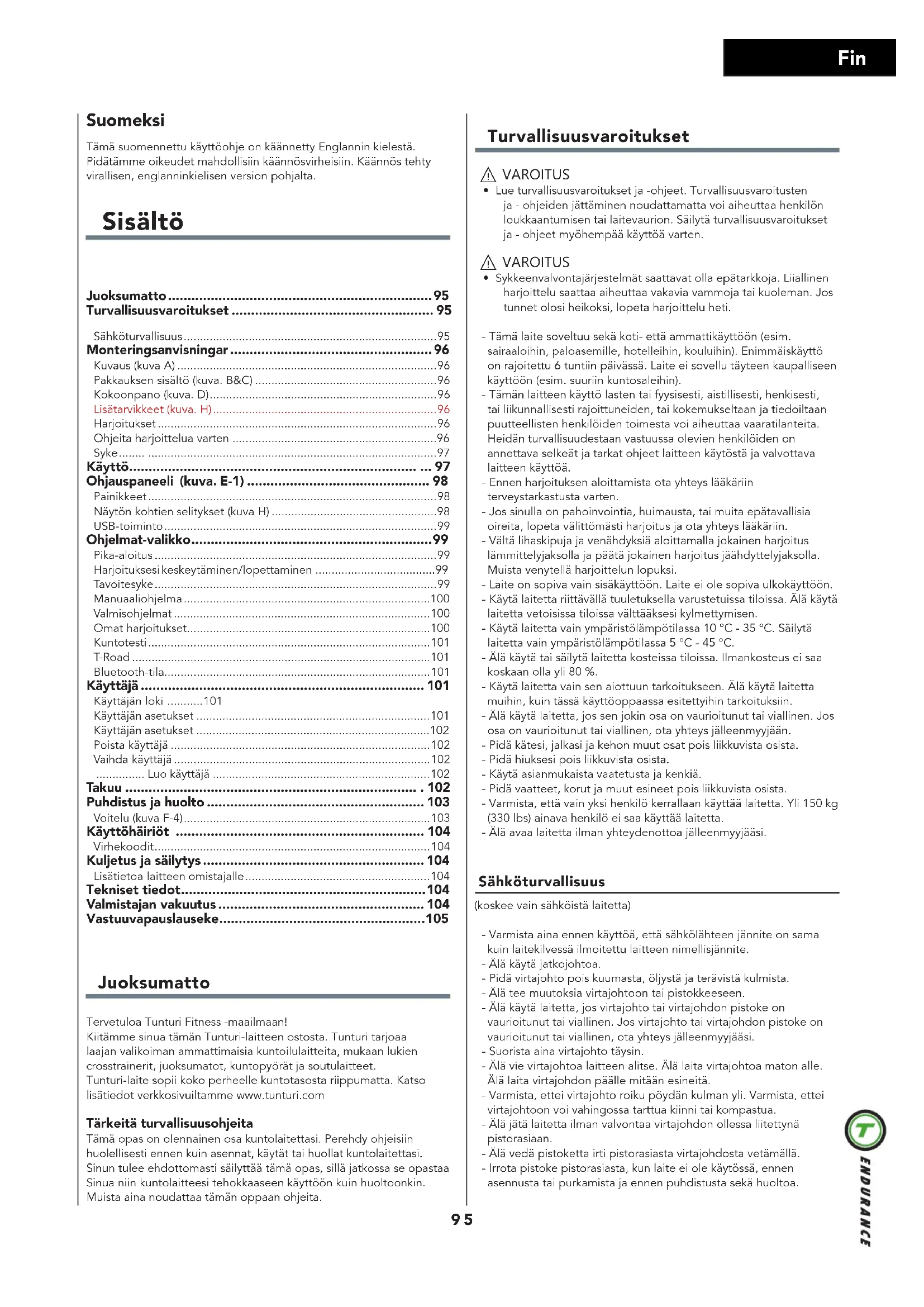- Asetettua maksiminopeutta käytetään juoksumaton maksiminopeutena sekä manuaalisen että ohjelmaprofiilin tiloissa. Takuu Takuuehdot Kuluttajalla on sovellettavan kulutustavaroiden kauppaa koskevan kansallisen lainsäädännön mukaiset lailliset oikeudet, eikä takuulla rajoiteta näitä oikeuksia. Omistajan Takuu on voimassa vain, mikäli laitetta käytetään Tunturi New Fitness BV:n kyseiselle laitteelle sallimassa käyttöympäristössä. Kunkin laitteen sallittu käyttöympäristö mainitaan laitteen käyttöohjeessa. Takuuehdot Takuuehdot tulevat voimaan tuotteen ostopäivästä lukien. Takuuehdot voivat olla erilaiset eri maissa, joten pyydä takuuehdot paikalliselta jälleenmyyjältä.103 Fin Takuun kattavuus Missään olosuhteissa Tunturi New Fitness BV tai Tunturi-jälleenmyyjä ei vastaa ostajalle mahdollisesti aiheutuvista välillisistä vahingoista, kuten käyttöhyödyn tai tulojen menetyksestä taikka muista taloudellisista seurausvahingoista. Takuun tajoitukset Takuu kattaa työstä ja materiaalista johtuvat virheet kuntolaitteessa, joka on alkuperäisessä kokoonpanossaan. Takuu koskee vain virheitä, jotka ilmenevät normaalissa ja laitteen mukana tulleen ohjekirjan mukaisessa käytössä edellyttäen, että Tunturin asennus-, huolto- ja käyttöohjeita on noudatettu. Tunturi New Fitness BV:n ja Tunturin jälleenmyyjät eivät vastaa virheistä, jotka aiheutuvat heidän vaikutusmahdollisuuksiensa ulkopuolella olevista seikoista. Takuu on voimassa vain niissä maissa, joissa Tunturi New Fitness BV:llä on valtuutettu maahantuoja. Takuu ei koske sellaisia kuntolaitteita tai osia, joita on muutettu ilman Tunturi New Fitness BV:n suostumusta. Takuu ei koske virheitä, jotka johtuvat luonnollisesta kulumisesta, virheellisestä käytöstä, käytöstä olosuhteissa, joihin kuntolaitetta ei ole tarkoitettu, korroosiosta tai lastaus- tai kuljetusvahingoista.Takuu ei koske käyttöääniä, jotka eivät olennaisesti haittaa laitteen käyttöä eivätkä johdu laitteessa olevasta virheestä.Takuu ei myöskään sisällä kunnossapitotoimenpiteitä, kuten puhdistusta, voitelua tai sen osien normaalia tarkistamista, eikä sellaisia asennustoimenpiteitä, jotka asiakas voi suorittaa itse ja jotka eivät edellytä erityistä kuntolaitteen purkamista / kokeamista. Tällaisia toimenpiteitä ovat esim. mittareiden, polkimien tai muiden vastaavien yksinkertaisten osien vaihdot. Muun kuin valtuutetun Tunturi-edustajan suorittamia takuukorjauksia ei korvata. Laitteen käyttöohjeen noudattamatta jättäminen aiheuttaa takuun raukeamisen. Puhdistus ja huolto ⚠ VAROITUS