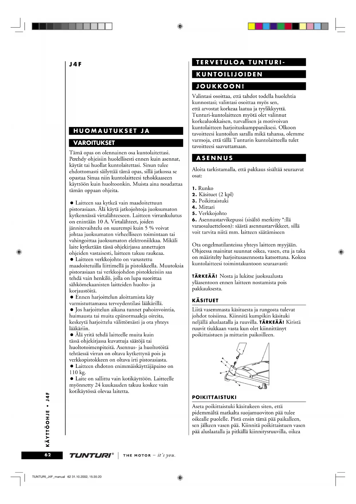 - -10 % Moottori ,75 hv (jatkuva teho) Tunturi-laitteet täyttävät sähkömagneettista yhteensopivuutta koskevan EU:n EMC-direktiivin (89/336/EEC) sekä pienjännitedirektiivin (73/ 23/EEC) vaatimukset. Tuotteet on varustettu sen mukaisesti CE-merkinnällä. Jatkuvan tuotekehityksen vuoksi oikeudet muutoksiin pidätetään. TÄRKEÄÄ! Tässä ohjekirjassa annettuja tietoja kuntolaitteen asennuksesta, käytöstä ja huollosta tulee noudattaa erittäin huolellisesti. Takuu ei korvaa vahinkoja, jotka ovat aiheutuneet tässä ohjekirjassa mainittujen asennus-, säätö- tai huoltotoimenpiteiden laiminlyönneistä. Mikäli asennus-, säätö- tai huoltotoimenpiteitä tehdään toisin kuin ohjekirjassa mainitaan tai laitteelle tehdään toimenpiteitä, joita Tunturi Oy Ltd ei nimenomaisesti ole hyväksynyt, laitetta ei tule käyttää! Toivotamme Sinulle miellyttäviä harjoitushetkiä Tunturi-harjoituskumppanisi kanssa! TUNTURI_J4F_manual 69 31.10.2002, 15:35:27OWNER'S MANUAL • J4F p. 1
