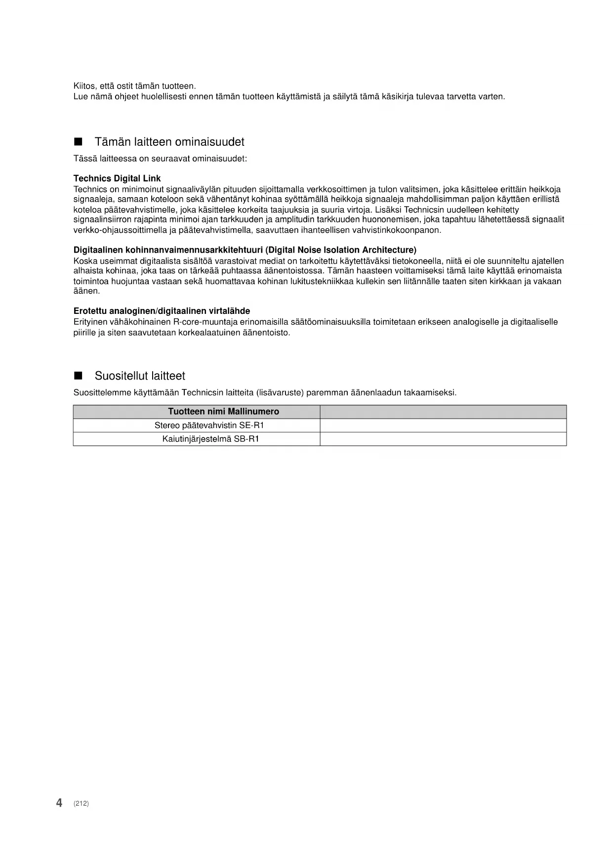 DAMAGES (INCLUDING, BUT NOT LIMITED TO, PROCUREMENT OF SUBSTITUTE GOODS OR SERVICES; LOSS OF USE, DATA, OR PROFITS; OR BUSINESS INTERRUPTION) HOWEVER CAUSED AND ON ANY THEORY OF LIABILITY, WHETHER IN CONTRACT, STRICT LIABILITY, OR TORT (INCLUDING NEGLIGENCE OR OTHERWISE) ARISING IN ANY WAY OUT OF THE USE OF THIS SOFTWARE, EVEN IF ADVISED OF THE POSSIBILITY OF SUCH DAMAGE. (211) SU-R1E-SQT0463_swe.book 29 ページ 2015年6月18日 木曜日 午前10時57分4 Kiitos, että ostit tämän tuotteen. Lue nämä ohjeet huolellisesti ennen tämän tuotteen käyttämistä ja säilytä tämä käsikirja tulevaa tarvetta varten. ∫ Tämän laitteen ominaisuudet Tässä laitteessa on seuraavat ominaisuudet: Technics Digital Link Technics on minimoinut signaaliväylän pituuden sijoittamalla verkkosoittimen ja tulon valitsimen, joka käsittelee erittäin heikkoja signaaleja, samaan koteloon sekä vähentänyt kohinaa syöttämällä heikkoja signaaleja mahdollisimman paljon käyttäen erillistä koteloa päätevahvistimelle, joka käsittelee korkeita taajuuksia ja suuria virtoja. Lisäksi Technicsin uudelleen kehitetty signaalinsiirron rajapinta minimoi ajan tarkkuuden ja amplitudin tarkkuuden huononemisen, joka tapahtuu lähetettäessä signaalit verkko-ohjaussoittimella ja päätevahvistimella, saavuttaen ihanteellisen vahvistinkokoonpanon. Digitaalinen kohinnanvaimennusarkkitehtuuri (Digital Noise Isolation Architecture) Koska useimmat digitaalista sisältöä varastoivat mediat on tarkoitettu käytettäväksi tietokoneella, niitä ei ole suunniteltu ajatellen alhaista kohinaa, joka taas on tärkeää puhtaassa äänentoistossa. Tämän haasteen voittamiseksi tämä laite käyttää erinomaista toimintoa huojuntaa vastaan sekä huomattavaa kohinan lukitustekniikkaa kullekin sen liitännälle taaten siten kirkkaan ja vakaan äänen. Erotettu analoginen/digitaalinen virtalähde Erityinen vähäkohinainen R-core-muuntaja erinomaisilla säätöominaisuuksilla toimitetaan erikseen analogiselle ja digitaaliselle piirille ja siten saavutetaan korkealaatuinen äänentoisto. ∫ Suositellut laitteet Suosittelemme käyttämään Technicsin laitteita (lisävaruste) paremman äänenlaadun takaamiseksi. Tuotteen nimi Mallinumero Stereo päätevahvistin SE-R1 Kaiutinjärjestelmä SB-R1 (212) SU-R1E-SQT0463_fin.book 4 ページ 2015年6月18日 木曜日 午前11時49分5 Suomi Varotoimet turvallisuuden takaamiseksi Laite ≥ Tulipalo-, sähköisku- tai vahinkovaaran välttämiseksi,– Älä anna tämän laitteen altistua sateelle, kosteudelle, pisaroille tai roiskeille.– Älä laita laitteen päälle mitään nesteitä sisältäviä esineitä kuten maljakot.– Käytä ainoastaan suositeltuja varusteita.– Älä poista suojuksia.– Älä korjaa tätä laitetta itse. Anna huoltopalvelut tehtäväksi pätevälle henkilöstölle.– Älä anna metalliesineiden pudota laitteen sisälle.– Älä laita painavia esineitä laitteen päälle. Verkkokaapeli ≥ Tulipalo-, sähköisku- tai vahinkovaaran välttämiseksi,– Varmista, että virtalähteen jännite vastaa laitteeseen merkittyä jännitettä.– Työnnä verkkovirtapistoke kunnollisesti pistorasiaan.– Älä vedä tai taivuta kaapelia tai aseta sen päälle painavia esineitä.– Älä käsittele pistoketta märillä käsillä.– Pidä kiinni verkkovirtapistokkeen rungosta, kun irrotat pistokkeen.– Älä käytä vahingoittunutta verkkovirtapistoketta tai pistorasiaa.≥ Pistoketta käytetään virrankatkaisulaitteena.Asenna yksikkö siten, että pistoke voidaan irrottaa nopeasti pistorasiasta. Laite ≥ Älä laita avotulisia esineitä kuten kynttilöitä laitteen päälle.≥ Laite saattaa kärsiä radiotaajuisista häiriöistä, jotka aiheutuvat matkapuhelimista käytön aikana. Jos kyseisiä häiriöitä tapahtuu, lisää matkapuhelimen ja tuotteen välistä etäisyyttä.≥ Tämä laite on tarkoitettu käytettäväksi trooppisissa ilmastoissa. Sijoitus ≥ Sijoita laite tasaiselle pinnalle.≥ Tulipalo-, sähköisku- tai vahinkovaaran välttämiseksi,– Älä asenna tai sijoita tätä laitetta kirjahyllyyn, suljettuun kaappiin tai muuhun rajalliseen tilaan. Varmista laitteen riittävä tuuletus.– Älä tuki laitteen tuuletusaukkoja lehdillä, pöytäliinalla, verhoilla tai vastaavilla esineillä.– Älä anna tämän laitteen altistua suoralle auringonvalolle, korkeille lämpötiloille, runsaalle kosteudelle tai liialliselle tärinälle.≥ Älä nosta tai kanna tätä laitetta pitämällä kiinni sen nupeista. Niin tekemällä voidaan aiheuttaa tämän laitteen kaatuminen sekä henkilövahinkoja tai tämän laitteen toimintahäiriö. Paristo ≥ On olemassa räjähdysvaara, jos akkua ei vaihdeta oikein. Käytä ainoastaan valmistajan suosittelemaa tyyppiä.≥ Paristojen väärä käsittely voi aiheuttaa elektrolyyttivuodon sekä tulipalon.– Poista paristo, jos et aio käyttää kaukosäädintä pitkään aikaa. Varastoi viileään, pimeään paikkaan.– Älä altista sitä kuumalle tai liekeille.– Älä jätä paristoa(paristoja) autoon suoraan auringonvaloon pitkäksi aikaa, kun auton ovet ja ikkunat ovat kiinni.– Älä pura osiin tai aiheuta oikosulkua.– Älä lataa uudelleen alkali- tai mangaaniparistoja.– Älä käytä paristoja, joiden suojakuori on rikkoutunut.– Älä sekoita keskenään vanhoja ja uusia paristoja/akkuja tai käytä erityyppisiä paristoja/akkuja samanaikaisesti.≥ Kun hävität paristot, ota yhteyttä paikallisiin viranomaisiin tai jälleenmyyjään oikean hävitysmenetelmän selvittämiseksi. VAROITUS VAARA Vanhojen laitteiden ja akkujen hävittäminen Ainoastaan Euroopan yhteisölle ja maille kierrätysjärjestelmien kanssa Nämä tuotteessa, pakkauksessa ja/tai sen mukana toimitettavissa asiakirjoissa olevat tunnukset tarkoittavat sitä, että käytettyjä sähkö- ja elektroniikkalaitteita sekä akkuja/paristoja ei saa laittaa tavallisen kotitalousjätteen sekaan.Vanhojen tuotteiden ja akkujen/par