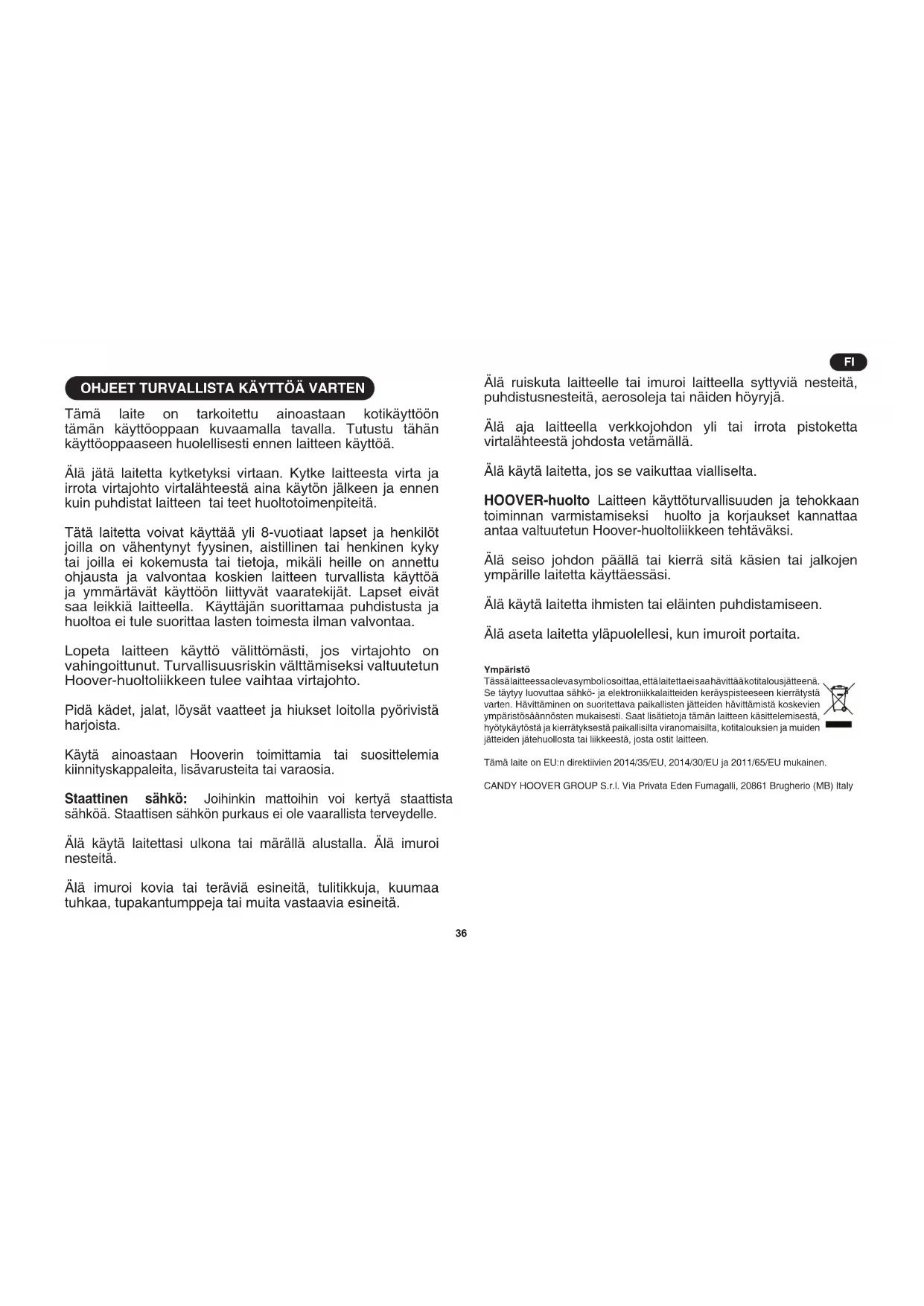 Tämä laite on tarkoitettu ainoastaan kotikäyttöön tämän käyttöoppaan kuvaamalla tavalla. Tutustu tähän käyttöoppaaseen huolellisesti ennen laitteen käyttöä. Älä jätä laitetta kytketyksi virtaan. Kytke laitteesta virta ja irrota virtajohto virtalähteestä aina käytön jälkeen ja ennen kuin puhdistat laitteen tai teet huoltotoimenpiteitä. Tätä laitetta voivat käyttää yli 8-vuotiaat lapset ja henkilöt joilla on vähentynyt fyysinen, aistillinen tai henkinen kyky tai joilla ei kokemusta tai tietoja, mikäli heille on annettu ohjausta ja valvontaa koskien laitteen turvallista käyttöä ja ymmärtävät käyttöön liittyvät vaaratekijät. Lapset eivät saa leikkiä laitteella. Käyttäjän suorittamaa puhdistusta ja huoltoa ei tule suorittaa lasten toimesta ilman valvontaa. Lopeta laitteen käyttö välittömästi, jos virtajohto on vahingoittunut. Turvallisuusriskin välttämiseksi valtuutetun Hoover-huoltoliikkeen tulee vaihtaa virtajohto. Pidä kädet, jalat, löysät vaatteet ja hiukset loitolla pyörivistä harjoista. Käytä ainoastaan Hooverin toimittamia tai suosittelemia kiinnityskappaleita, lisävarusteita tai varaosia. Staattinen sähkö: Joihinkin mattoihin voi kertyä staattista sähköä. Staattisen sähkön purkaus ei ole vaarallista terveydelle. Älä käytä laitettasi ulkona tai märällä alustalla. Älä imuroi nesteitä. Älä imuroi kovia tai teräviä esineitä, tulitikkuja, kuumaa tuhkaa, tupakantumppeja tai muita vastaavia esineitä. Älä ruiskuta laitteelle tai imuroi laitteella syttyviä nesteitä, puhdistusnesteitä, aerosoleja tai näiden höyryjä. Älä aja laitteella verkkojohdon yli tai irrota pistoketta virtalähteestä johdosta vetämällä. Älä käytä laitetta, jos se vaikuttaa vialliselta. HOOVER-huolto Laitteen käyttöturvallisuuden ja tehokkaan toiminnan varmistamiseksi huolto ja korjaukset kannattaa antaa valtuutetun Hoover-huoltoliikkeen tehtäväksi. Älä seiso johdon päällä tai kierrä sitä käsien tai jalkojen ympärille laitetta käyttäessäsi. Älä käytä laitetta ihmisten tai eläinten puhdistamiseen. Älä aseta laitetta yläpuolellesi, kun imuroit portaita. Ympäristö Tässä laitteessa oleva symboli osoittaa, että laitetta ei saa hävittää kotitalousjätteenä. Se täytyy luovuttaa sähkö- ja elektroniikkalaitteiden keräyspisteeseen kierrätystä varten. Hävittäminen on suoritettava paikallisten jätteiden hävittämistä koskevien ympäristösäännösten mukaisesti. Saat lisätietoja tämän laitteen käsittelemisestä, hyötykäytöstä ja kierrätyksestä paikallisilta viranomaisilta, kotitalouksien ja muiden jätteiden jätehuollosta tai liikkeestä, josta ostit laitteen. Tämä laite on EU:n direktiivien 2014/35/EU, 2014/30/EU ja 2011/65/EU mukainen. CANDY HOOVER GROUP S.r.l. Via Privata Eden Fumagalli, 20861 Brugherio (MB) Italy37