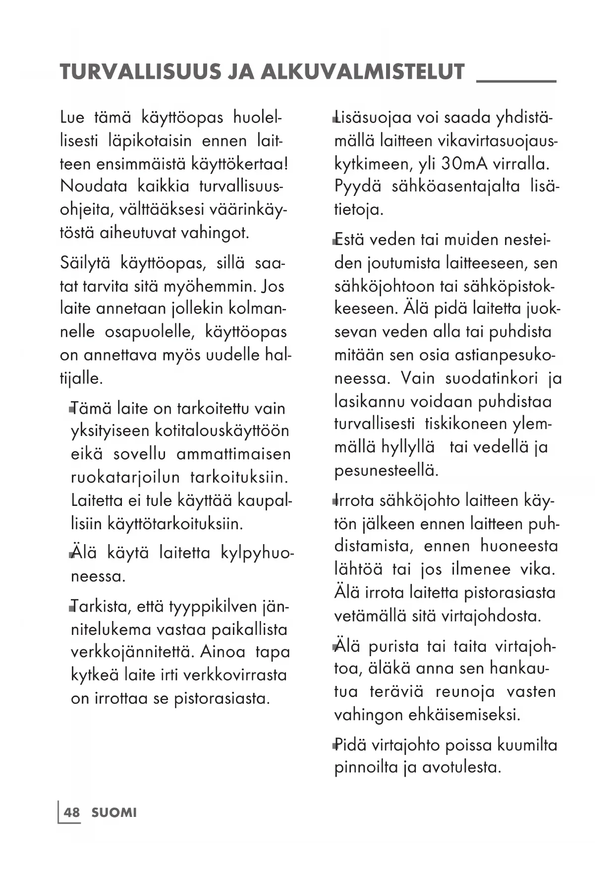 Lisäsuojaa voi saada yhdistä- mällä laitteen vikavirtasuojaus- kytkimeen, yli 30mA virralla. Pyydä sähköasentajalta lisä- tietoja.