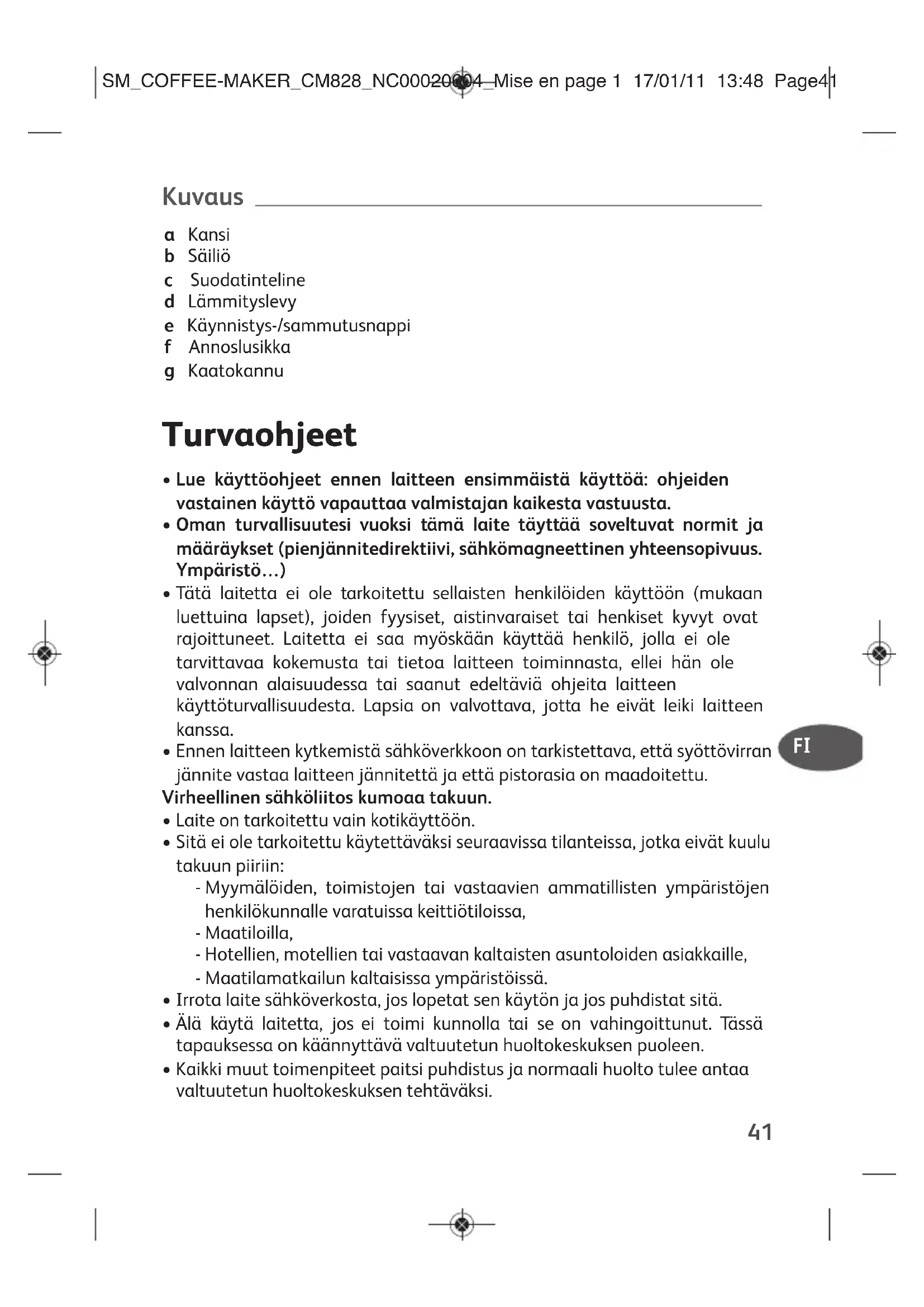 - Kaikki muut toimenpiteet paitsi puhdistus ja normaali huolto tulee antaa valtuutetun huoltokeskuksen tehtäväksi. SM_COFFEE-MAKER_CM828_NC00020604_Mise en page 1 17/01/11 13:48 Page4142