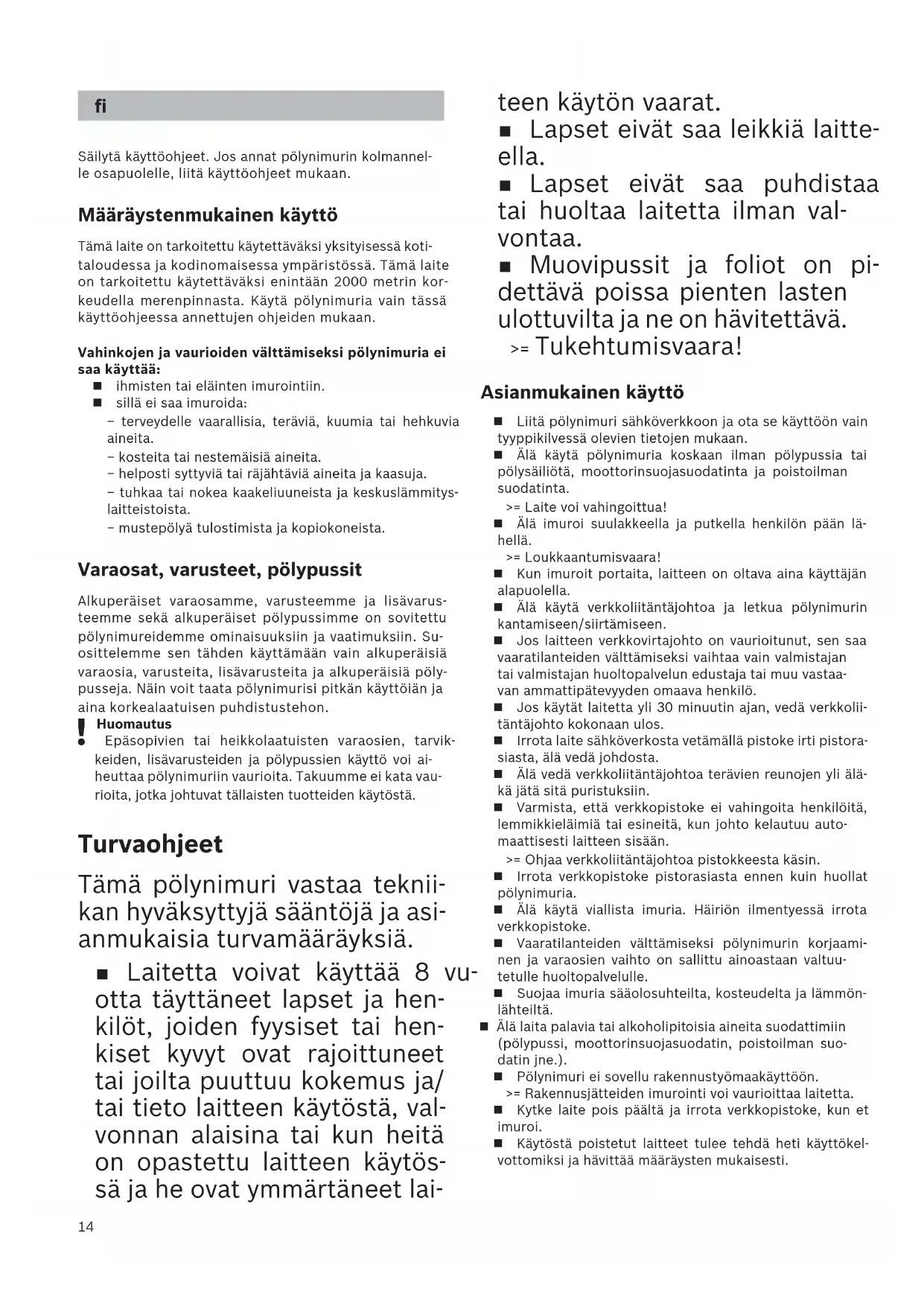 Huomautus Epäsopivien tai heikkolaatuisten varaosien, tarvik- keiden, lisävarusteiden ja pölypussien käyttö voi ai- heuttaa pölynimuriin vaurioita. Takuumme ei kata vau- rioita, jotka johtuvat tällaisten tuotteiden käytöstä. Turvaohjeet Tämä pölynimuri vastaa teknii- kan hyväksyttyjä sääntöjä ja asi- anmukaisia turvamääräyksiä. Laitetta voivat käyttää 8 vu- otta täyttäneet lapset ja hen- kilöt, joiden fyysiset tai hen- kiset kyvyt ovat rajoittuneet tai joilta puuttuu kokemus ja/ tai tieto laitteen käytöstä, val- vonnan alaisina tai kun heitä on opastettu laitteen käytös- sä ja he ovat ymmärtäneet lai-15