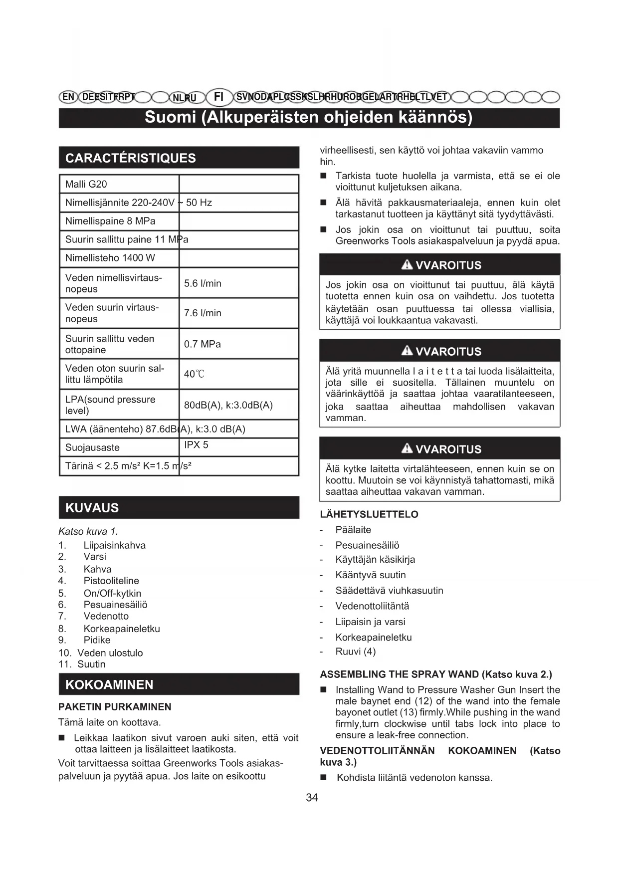 KOKOAMINEN PAKETIN PURKAMINEN Tämä laite on koottava. Leikkaa laatikon sivut varoen auki siten, että voit ottaa laitteen ja lisälaitteet laatikosta. Voit tarvittaessa soittaa Greenworks Tools asiakas- palveluun ja pyytää apua. Jos laite on esikoottu virheellisesti, sen käyttö voi johtaa vakaviin vammo hin. Tarkista tuote huolella ja varmista, että se ei ole vioittunut kuljetuksen aikana. Älä hävitä pakkausmateriaaleja, ennen kuin olet tarkastanut tuotteen ja käyttänyt sitä tyydyttävästi. Jos jokin osa on vioittunut tai puuttuu, soita Greenworks Tools asiakaspalveluun ja pyydä apua. VVAROITUS Jos jokin osa on vioittunut tai puuttuu, älä käytä tuotetta ennen kuin osa on vaihdettu. Jos tuotetta käytetään osan puuttuessa tai ollessa viallisia, käyttäjä voi loukkaantua vakavasti. VVAROITUS Älä yritä muunnella l a i t e t t a tai luoda lisälaitteita, jota sille ei suositella. Tällainen muuntelu on väärinkäyttöä ja saattaa johtaa vaaratilanteeseen, joka saattaa aiheuttaa mahdollisen vakavan vamman. VVAROITUS Älä kytke laitetta virtalähteeseen, ennen kuin se on koottu. Muutoin se voi käynnistyä tahattomasti, mikä saattaa aiheuttaa vakavan vamman. LÄHETYSLUETTELO - Päälaite - Pesuainesäiliö - Käyttäjän käsikirja - Kääntyvä suutin - Säädettävä viuhkasuutin - Vedenottoliitäntä - Liipaisin ja varsi - Korkeapaineletku - Ruuvi (4) ASSEMBLING THE SPRAY WAND (Katso kuva 2.) Installing Wand to Pressure Washer Gun Insert the male baynet end (12) of the wand into the female bayonet outlet (13) firmly.While pushing in the wand firmly,turn clockwise until tabs lock into place to ensure a leak-free connection. VEDENOTTOLIITÄNNÄN KOKOAMINEN (Katso kuva 3.) Kohdista liitäntä vedenoton kanssa.Suomi (Alkuperäisten ohjeiden käännös)