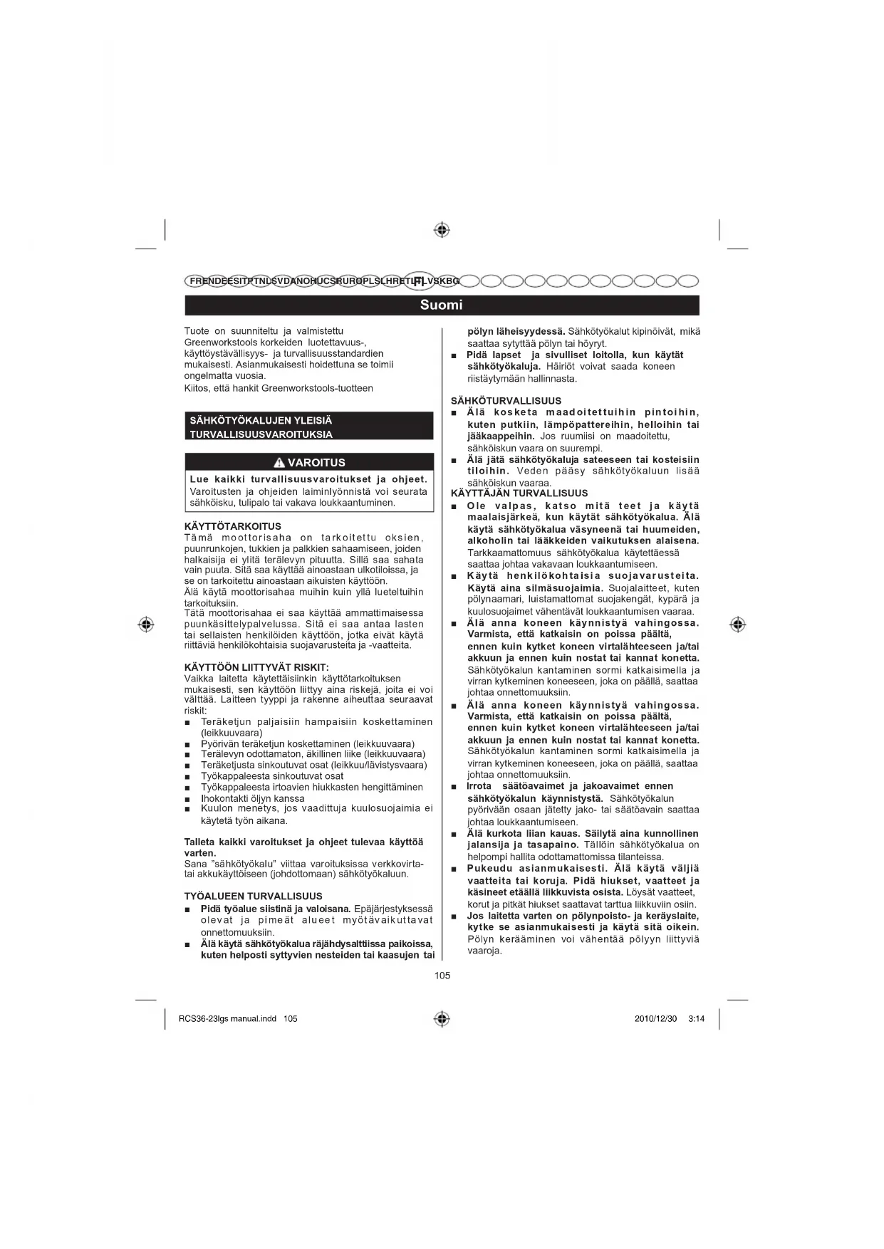 FR EN DE ES IT PT NL SV DA NO HU CS RU RO PL SL HR ET LT LV SK BG SÄHKÖTYÖKALUN KÄYTTÖ JA HUOLTO ■ Käytä työhön sopivaa sähkötyökalua. Asianmukainen sähkötyökalu hoitaa työt paremmin ja turvallisemmin sillä nopeudella/teholla, jota varten se on suunniteltu. ■ Älä käytä sähkötyökalua, jos se ei käynnisty ja sammu katkaisimesta. Jos sähkötyökalua ei voida hallita katkaisimella, se on vaarallinen ja vaatii korjaamista. ■ Irrota pistoke virranlähteestä, ennen kuin teet säätöjä, vaihdat varusteita tai varastoit sähkötyökalun. Tällaiset varotoimet pienentävät sitä vaaraa, että sähkötyökalu käynnistyisi vahingossa. ■ Varastoi sähkötyökalu pois lasten ulottuvilta äläkä anna kenenkään, joka ei tunne konetta tai näitä ohjeita, käyttää sitä. Sähkötyökalut ovat vaarallisia kouluttamattomien käyttäjien käsissä. ■ Huolla sähkötyökalut. Tarkista, että liikkuvat osat on kohdistettu oikein ja että ne liikkuvat kunnolla, että osia ei ole rikkoutunut ja että mikään muu seikka ei haittaa sähkötyökalun toimintaa. Jos sähkötyökalu vioittuu, korjaa se ennen käyttöä. Onnettomuudet johtuvat usein sähkötyökalujen huonosta huollosta. ■ Pidä leikkuutyökalut terävinä ja puhtaina. Asianmukaisesti huolletut leikkuutyökalut, joiden leikkuupinnat ovat teräviä, eivät jumiudu helposti ja niitä on helppo hallita. ■ Käytä sähkötyökalua, lisävarusteita, teriä jne. näiden ohjeiden mukaisesti ja sähkötyökalulle tarkoitetulla tavalla. Huomioi työolosuhteet ja tehtävän työn laatu. Sähkötyökalun käyttö muuhun kuin sille tarkoitettuun työhön voi aiheuttaa vaarallisia tilanteita. AKKUKÄYTTÖISEN TYÖKALUN KÄYTTÖ JA HOITO ■ Varmista, että käynnistyskytkin on ”seis” asennossa ja lukittuna ennen, kuin asetat akun sisään. Akun asentaminen käyntiasennossa olevaan työkaluun voi aiheuttaa onnettomuuksia. ■ Älä lataa työkalun akkua muulla, kuin valmistajan suosittelemalla laturilla. Latauslaite on tarkoitettu ennalta määrätyille akkutyypeille ja se voi aiheuttaa tulipalon, jos sitä käytetään muuntyyppisen akun lataukseen. ■ Johdottoman työkalun kanssa tulee käyttää vain yhtä erityistä akkutyyppiä. Muunlaisten akkujen käyttö voi aiheuttaa tulipalon. ■ Kun akku ei ole käytössä, pidä se kaukana metalliesineistä kuten liittimistä, kolikoista, avaimista, nauloista, ruuveista ja muista esineistä, jotka saattavat aiheuttaa napojen keskinäisen kytkeytymisen, jonka seurauksena voi olla palovammoja tai tulipalo. Akun napojen oikosulkuun saattaminen voi aiheuttaa palovammoja tai tulipalon. ■ Vältä koskemasta akkunesteeseen liian raskaan käytön aiheuttaman vuodon yhteydessä. Mikäli näin tapahtuu, huuhtele välittömästi saastunut alue runsaalla puhtaalla vedellä. Jos nestettä on joutunut silmiin, ota yhteys lääkäriin. Akkuneste voi aiheuttaa ärsytysherkkyyttä tai palovammoja. HUOLTO ■ Huollata sähkötyökalu pätevällä huoltomiehellä, joka käyttää ainoastaan asianmukaisia varaosia. Tämä varmistaa, että sähkötyökalu on turvallinen. Huolto kaipaa suurta huolellisuutta ja hyvää työkalun tuntemusta: se on annettava pätevän teknikon tehtäväksi. Suosittelemme, että viet työkalun korjattavaksi lähimpään valtuutettuun huoltoliikkeeseen. Käytä vaihdossa yksinomaan alkuperäisiä varaosia. MOOTTORISAHAN TURVALLISUUSVAROITUKSIA ■ Pitele sähkötyökalua vain eristetyistä tartuntapinnoista, sillä moottorisahan ketju saattaa koskettaa sen johtoja. Jos sahan ketju koskettaa sähköistettyä johtoa, sen paljaisiin metalliosiin voi johtua sähköä, mikä voi aiheuttaa käyttäjälle sähköiskun. ■ Älä kosketa teräketjua, kun se on toiminnassa. Tarkista ennen moottorisahan käynnistystä, että teräketju ei ole kosketuksissa mihinkään. Tarkkaamattomuus moottorisahaa käytettäessä voi saada vaatteet tai ruumiinosan tarttumaan teräketjuun. ■ Pidä aina oikealla kädellä kiinni takakädensijasta ja vasemmalla kädellä etukädensijasta. Jos sahaa pidetään vastakkaisesti, loukkaantumisriski kasvaa. ■ Käytä suojalaseja ja kuulosuojaimia. Pään, käsien ja jalkojen suojaimia suositellaan. Riittävät suojavaatteet vähentävät loukkaantumisia, jotka aiheutuvat lentävistä kappaleista tai kontaktista teräketjuun. ■ Älä käytä moottorisahaa puusta käsin. Moottorisahan käyttö puussa saattaa johtaa loukkaantumiseen. ■ Ota aina hyvä jalansija ja käytä moottorisahaa vain, kun seisot kiinteällä, turvallisella tasapinnalla. Liukkaat tai epävakaat pinnat, kuten tikkaat, voivat saada käyttäjän menettämään tasapainon tai sahan hallinnan. ■ Muista sahatessasi jännitettyä oksaa, että se potkaisee katketessaan takaisin. Kun puun säikeiden jännitys vapautuu, taipuisa oksa voi iskeä käyttäjää ja/tai saada hänet menettämään moottorisahan hallinnan. ■ Ole erittäin varovainen sahatessasi pensaita ja taimia. Ohut puu voi tarttua teräketjuun ja iskeytyä sinua kohti tai vetää sinut pois tasapainosta. RCS36-23lgs manual.indd 106RCS36-23lgs manual.indd 106 2010/12/30 3:142010/12/30 3:14107 Suomi