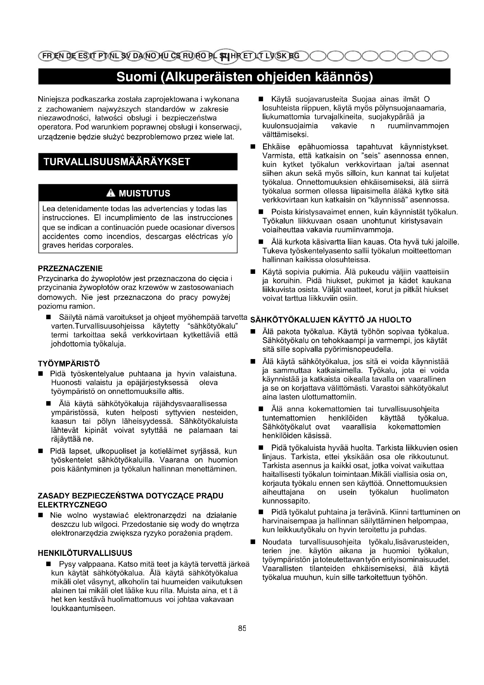 ERIKOISTURVAOHJEET Varmista, että käynnistyskytkin on “seis” asennossa ja lukittuna ennen, kuin asetat akun sisään. Akun asentaminen käyntiasennossa olevaan työkaluun voi aiheuttaa onnettomuuksia. Älä lataa työkalun akkua muulla, kuin valmistajan suosittelemalla laturilla. Laturi on tarkoitettu ennalta määrätyille akkutyypeille ja se voi aiheuttaa tulipalon, jos sitä käytetään muuntyyppisen akun lataukseen. Johdottoman työkalun kanssa tulee käyttää vain yhtä erityistä akkutyyppiä. Muunlaisten akkujen käyttö voi aiheuttaa tulipalon. Kun akku ei ole käytössä, pidä se kaukana metalliesineistä kuten liittimistä, kolikoista,avaimista, nauloista, ruuveista ja muista esineistä, jotka saattavat aiheuttaa napojen keskinäisen kytkeytymisen. Akun napojen oikosulkuun saattaminen voi aiheuttaa palovammoja tai tulipalon. Vältä koskemasta akkunesteeseen liian raskaan käytön aiheuttaman vuodon yhteydessä. Mikäli näin tapahtuu, huuhtele välittömästi saastunut alue puhtaalla vedellä. Jos nestettä on joutunut silmiin, ota yhteys lääkäriin. Akkuneste voi aiheuttaa ärsytysherkkyyttä tai palovammoja. HUOLTO Kaikki korjaustyöt on annettava ammattitaitoisen huoltomiehen tehtäväksi ja vaihdossa on käytettävä yksinomaan alkuperäisiä varaosia. Näin toimien voit käyttää sähkötyökalua täysin turvallisesti. PENSASAITA-TRIMMERI TURVALLISUUSVAROITUKSET Pidä kaikki vartalon osat poissa leikkurinterästä. Älä poista leikattua materiaalia tai pitele leikattavaa materiaalia terien liikkuessa. Tarkista, että kytkin on pois päältä, kun poistat kiinnijuuttunutta materiaalia. Tarkkaamattomuus pensasaita-trimmeriä käytettäessä voi johtaa vakaviin henkilövahinkoihin. Kanna pensasaita-trimmeriä kädensijasta leikkurinterä pysäytettynä. Kiinnitä aina katkaisulaitteensuoja pensasaita - trimmeriä kuljetettaessa javarastoitaessa. Pensasaitatrimmerin oikea käsittely pienentää mahdollista leikkurinterän aiheuttaman henkilövahinkon riskiä. Elektronarzędzie należy trzymać wyłącznie za przewidziane do tego celu izolowane uchwyty, ponieważ istnieje ryzyko przypadkowego zetknięcia się ostrza z niewidocznym przewodem elektrycznym.
