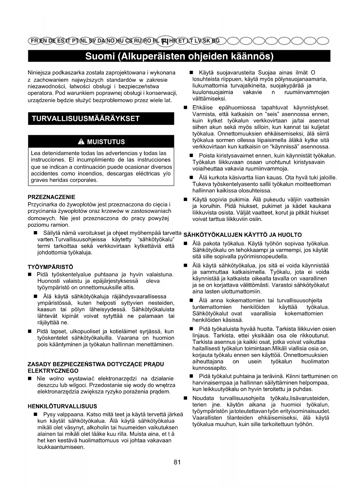 Pidä työskentelyalue puhtaana ja hyvin valaistuna. Huonosti valaistu ja epäjärjestyksessä oleva työympäristö on onnettomuuksille altis. Älä käytä sähkötyökaluja räjähdysvaarallisessa ympäristössä, kuten helposti syttyvien nesteiden, kaasun tai pölyn läheisyydessä. Sähkötyökaluista lähtevät kipinät voivat sytyttää ne palamaan tai räjäyttää ne. Pidä lapset, ulkopuoliset ja kotieläimet syrjässä, kun työskentelet sähkötyökaluilla. Vaarana on huomion pois kääntyminen ja työkalun hallinnan menettäminen. ZASADY BEZPIECZEŃSTWA DOTYCZĄCE PRĄDU ELEKTRYCZNEGO Nie wolno wystawiać elektronarzędzi na działanie deszczu lub wilgoci. Przedostanie się wody do wnętrza elektronarzędzia zwiększa ryzyko porażenia prądem. HENKILÖTURVALLISUUS Pysy valppaana. Katso mitä teet ja käytä tervettä järkeä kun käytät sähkötyökalua. Älä käytä sähkötyökalua mikäli olet väsynyt, alkoholin tai huumeiden vaikutuksen alainen tai mikäli olet lääke kuu rilla. Muista aina, et t ä het ken kestävä huolimattomuus voi johtaa vakavaan loukkaantumiseen. Käytä suojavarusteita Suojaa ainas ilmät O losuhteista riippuen, käytä myös pölynsuojanaamaria, liukumattomia turvajalkineita, suojakypärää ja kuulonsuojaimia vakavie n ruumiinvammojen välttämiseksi. Ehkäise epähuomiossa tapahtuvat käynnistykset. Varmista, että katkaisin on ”seis” asennossa ennen, kuin kytket työkalun verkkovirtaan ja/tai asennat siihen akun sekä myös silloin, kun kannat tai kuljetat työkalua. Onnettomuuksien ehkäisemiseksi, älä siirrä työkalua sormen ollessa liipaisimella äläkä kytke sitä verkkovirtaan kun katkaisin on “käynnissä” asennossa. Poista kiristysavaimet ennen, kuin käynnistät työkalun. Työkalun liikkuvaan osaan unohtunut kiristysavain voiaiheuttaa vakavia ruumiinvammoja. Älä kurkota käsivartta liian kauas. Ota hyvä tuki jaloille. Tukeva työskentelyasento sallii työkalun moitteettoman hallinnan kaikissa olosuhteissa. Käytä sopivia pukimia. Älä pukeudu väljiin vaatteisiin ja koruihin. Pidä hiukset, pukimet ja kädet kaukana liikkuvista osista. Väljät vaatteet, korut ja pitkät hiukset voivat tarttua liikkuviin osiin. SÄHKÖTYÖKALUJEN KÄYTTÖ JA HUOLTO Älä pakota työkalua. Käytä työhön sopivaa työkalua. Sähkötyökalu on tehokkaampi ja varmempi, jos käytät sitä sille sopivalla pyörimisnopeudella. Älä käytä sähkötyökalua, jos sitä ei voida käynnistää ja sammuttaa katkaisimella. Työkalu, jota ei voida käynnistää ja katkaista oikealla tavalla on vaarallinen ja se on korjattava välittömästi. Varastoi sähkötyökalut aina lasten ulottumattomiin. Älä anna kokemattomien tai turvallisuusohjeita tuntemattomien henkilöiden käyttää työkalua. Sähkötyökalut ovat vaarallisia kokemattomien henkilöiden käsissä. Pidä työkaluista hyvää huolta. Tarkista liikkuvien osien linjaus. Tarkista, ettei yksikään osa ole rikkoutunut. Tarkista asennus ja kaikki osat, jotka voivat vaikuttaa haitallisesti työkalun toimintaan.Mikäli viallisia osia on, korjauta työkalu ennen sen käyttöä. Onnettomuuksien aiheuttajana on usein työkalun huolimaton kunnossapito. Pidä työkalut puhtaina ja terävinä. Kiinni tarttuminen on harvinaisempaa ja hallinnan säilyttäminen helpompaa, kun leikkuutyökalu on hyvin teroitettu ja puhdas. Noudata turvallisuusohjeita työkalu,lisävarusteiden, terien jne. käytön aikana ja huomioi työkalun, työympäristön ja toteutettavan työn erityisominaisuudet. Vaarallisten tilanteiden ehkäisemiseksi, älä käytä työkalua muuhun, kuin sille tarkoitettuun työhön. 81Suomi (Alkuperäisten ohjeiden käännös)