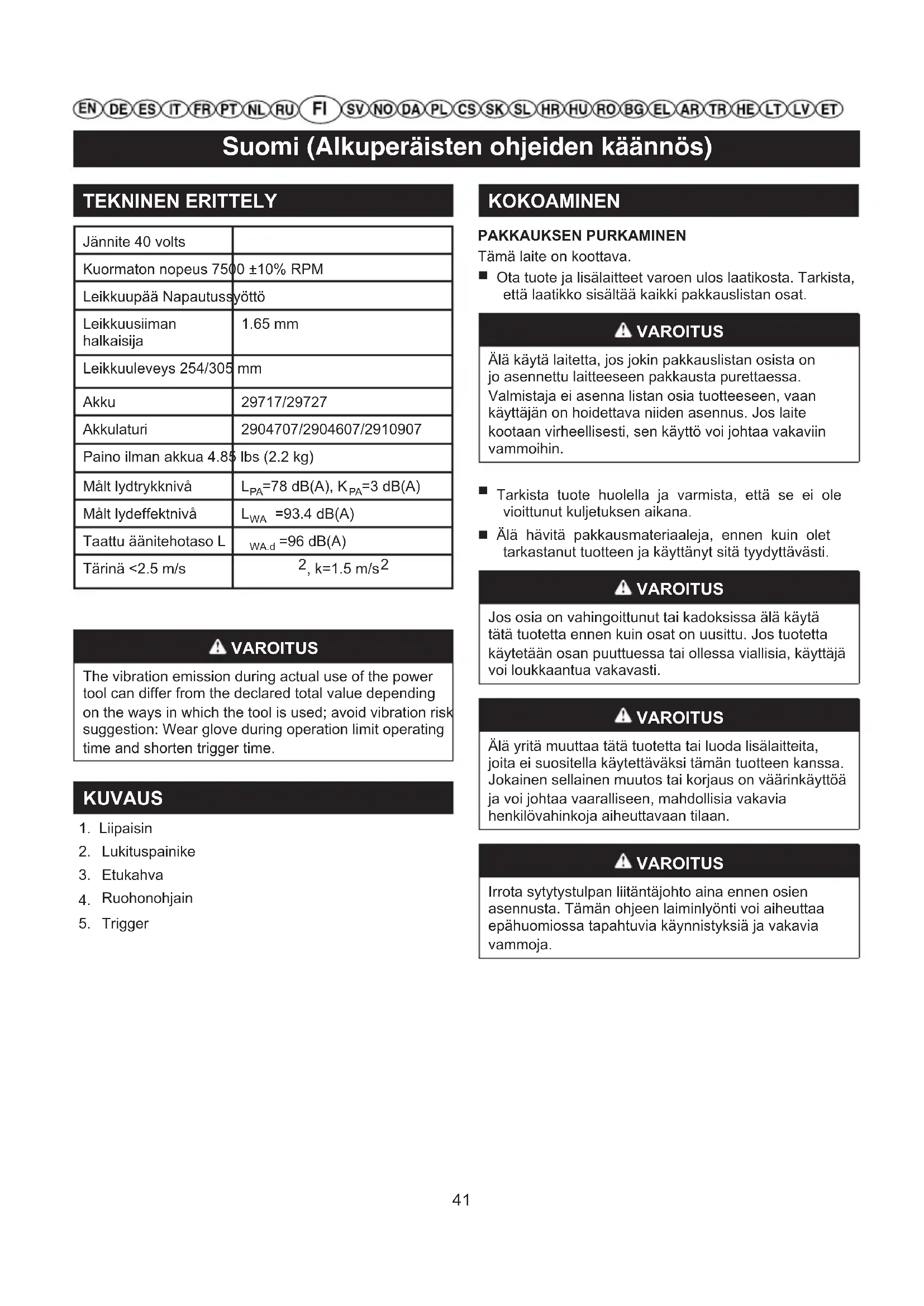 =93.4 dB(A)Suomi (Alkuperäisten ohjeiden käännös) ETUKAHVAN KIINNITTÄMINEN Katso kuva 2. ■ Reunaohjain voi rajoittaa leikkuusiiman leikkuualuetta ja vähentää riskiä, että pyörivä siima aiheuttaisi vahinkoa. ■ Reunaohjain otetaan käyttöön työntämällä se trimmeripään päälle. ETUKAHVAN KIINNITTÄMINEN Katso kuva 3. VAROITUS Älä kosketa terää. Muutoin seurauksena voi olla vakava loukkaantuminen. ■ Irrota akku. ■ Käännä ruohotrimmeri/syrjäyssaha ympäri päästäksesi käsiksi trimmeripäähän. ■ Liu’uta suojus (1) trimmeripään koloihin. ■ Kohdista suojan ruuvinreikä trimmeripään ruuvireiän kanssa. ■ Kiinnitä suoja paikoilleen ruuvaamalla ruuvi trimmeripäähän. VAROITUS Älä anna laitteen tuttuuden tehdä itsestäsi huolimatonta. Muista, että huolimaton sekunnin murto-osa riittää aiheuttamaan vakavan vamman. VAROITUS Käytä aina suojasilmälaseja tai sivusuojilla varustettuja suojalaseja käyttäessäsi moottorikäyttöisiä työkaluja. Suojalasien käyttämättä jättäminen voi johtaa esineiden sinkoutumiseen silmiisi ja mahdolliseen vakavaan vammaan. VAROITUS Älä käytä muita kuin tämän tuotteen valmistajan suosittelemia lisälaitteita. Muiden lisälaitteiden käyttäminen saattaa aiheuttaa vakavan vamman. APUKAHVAN KIINNITTÄMINEN Katso kuva 4. ■ Vedä apukahvan päitä hieman erilleen ja työnnä kahva varteen, kunnes se napsahtaa paikalleen. ■ Käännä apukahvaa nuolen suuntaan ja kiinnitä se haluttuun asentoon. ■ Työnnä ruuvi reikien läpi. ■ Kierrä nuppi ja kiristä se kunnolla. VARREN PITUUDEN SÄÄTÄMINEN (katso kuva 5.) Varren pituus voidaan säätää käyttäjän pituuteen sopivaksi. ■ Poista akku. ■ Pidä vartta tukevasti. ■ Paina lukituspainiketta (1) ja pidä sitä pohjassa. ■ Vedä tai työnnä ohjauskahva (2) haluamaasi asentoon. ■ Vapauta lukkopainike (1). ■ Siirtele ohjauskahvaa (2) edestakaisin, kunnes se kiinnittyy paikalleen. KÄYTTÖ Pidä kiinni käyttöpäästä oikea käsi takakahvalla ja vasen käsi etukahvalla. Otteen on oltava käytön aikana tukeva. Käyttöpäätä on pidettävä mukavassa asennossa takakah- va suunnilleen lantion korkeudella. Käytä käyttöpäätä aina täydellä kaasulla. Jos lisälaitteeseen kietoutuu roskaa, VA- PAUTA LIIPAISIN ja poista roskat. AKUN ASENTAMINEN Katso kuva 6. ■ Aseta akku trimmeriin. Kohdista akun harjanteet puhaltimen akkutilan uriin. ■ Varmista, että akun pohjan salpa napsahtaa paikoilleen ja että akku istuu laturissa tukevasti ennen trimmerin käytön aloittamista. AKUN IRROTTAMINEN Katso kuva 6. ■ Pysäytä trimmeri vapauttamalla kytkinliipaisin ja lukitusliipaisin. ■ Kytke trimmeri pois päältä painamalla virtapainiketta. ■ Pidä akun pohjassa oleva salpa pohjassa. ■ Irrota akku trimmeristä. TRIMMERIN KÄYNNISTÄMINEN/PYSÄYTTÄMINEN Katso kuva 6. ■ Käynnistä siimatrimmeri painamalla ja pitämällä turvalukkopainiketta (1) ja puristamalla liipaisinta (2). ■ Pysäytä trimmeri vapauttamalla liipaisin. VAROITUS 42Suomi (Alkuperäisten ohjeiden käännös) Melu. Laite aiheuttaa jonkin verran melua. Rutiininomaiseen meluisaan työhön on hankittava lupa, ja se on rajoitettava tiettyihin aikoihin. Pidä lepotaukoja, ja työtunnit voidaan joutua rajoittamaan minimiin. Käyttäjän ja lähistöllä työskentelevien on käytettävä asianmukaisia kuulosuojaimia oman terveytensä takia; Tärinä. Käytä aina tärinältä suojelevia suojakäsineitä. Liiallinen tärinä voi aiheuttaa valkosormisuutta tai karpaalitunnelisyndrooman. Jos huomaat käsissäsi epämiellyttävän tunteen tai niiden ihon väri muuttuu laitetta käytettäessä, pidä riittävän pitkiä työtaukoja. Laitetta säännöllisesti käyttävien on pidettävä tarkasti silmällä käsiensä ja sormiensa kuntoa. VAROITUS Trimmerin pyörivä leikkuupää voi aiheuttaa vakavan vamman. LEIKKUUVINKKEJÄ Katso kuva 7. Pidä trimmeri kallistettuna leikattavaa aluetta kohden;tässä asennossa se leikkaa parhaiten. Trimmeri leikkaa paremmin, kun sitä liikutetaan leikkuualueella vasemmalta oikealle; se on vähemmän tehokas liikuteltaessa oikealta vasemmalle. Leikkaa siiman kärjellä; älä pakota siimapäätä leikkaamattomaan ruohikkoon. Lanka- ja pylväsaidat saavat siiman kulumaan tavallista nopeammin tai katkeamaan. Kivet,tiiliseinät, penkereet ja puu voivat saada siiman kulumaan nopeasti. Varo puita ja pensaita. Siima voi helposti vahingoittaa kaarnaa, listoja, suojapintoja ja aidan pylväitä. Attach metal knob to the rubber hole on the rear handle when in use, unlock the metal knob when not in use.