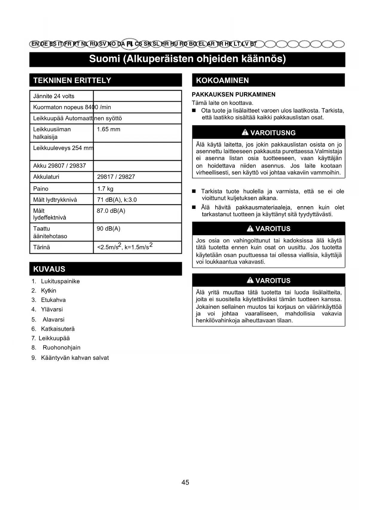EN DE ES IT FR PT NL RU SV NO DA PL CS SK SL HR HU RO BG EL AR TR HE LT LV ET TEKNINEN ERITTELY Jännite 24 volts Kuormaton nopeus 8400 /min Leikkuupää Automaattinen syöttö Leikkuusiiman halkaisija