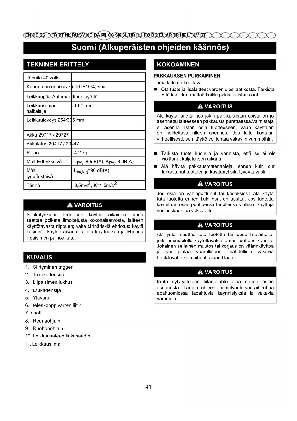 EN DE ES IT FR PT NL RU SV NO DA PL CS SK SL HR HU RO BG EL AR TR HE LT LV ET TEKNINEN ERITTELY Jännite 40 volts Kuormaton nopeus 7,500 (±10%) /min Leikkuupää Automaattinen syöttö Leikkuusiiman halkaisija