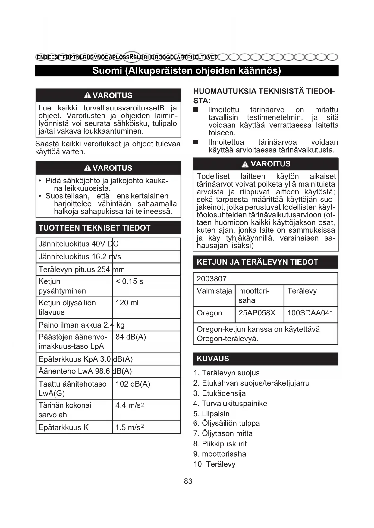 AMINEN Katso kuvaa 2 - 7 Muista irrottaa akku laitteesta. Käytä suojakäsineitä. Avaa vetopyörän suojan kiristysmutterit ja irrota vetopyörän suoja. Teräketjun tulee osoittaa sen pyörimiss-uuntaan. Jos se on takaperin, käännä se. Aseta ketjun vetolenkit terälevyn uraan. Aseta ketju siten, että se jää väljäksi terälevyn takaosassa. Pidä ketjua paikoillaan terälevyllä ja pujota ketju vetopyörän ympärille. Varmista, että asennat sen oikein. Varmista, että terälevyn reikä on samassa kohdassa sahan ketjun kiristyspultin kanssa. Asenna vetopyörän suoja ja kierrä ketjun kireyden säätöpulttia myötäpäivään, kunnes teräketjun kireys on oikea. Terälevyä tulee työntää ylöspäin. Tarkista ketjun kireys uudelleen. Älä kiristä ketjua liikaa. Kun ketju on kiristetty, kiristä mutterit uudelleen. HUOM: Teräketjun kireys on oikea, jos sitä voidaan nostaa terälevyn keskeltä 3-4 mm. Ennen kuin sahaat uudella teräketjulla, anna sen käydä 2~3 minuuttia. VAROITUS Tarkista ketjun kireys sisäänajon jälkeen ja kiristä tarvittaessa.Suomi (Alkuperäisten ohjeiden käännös)