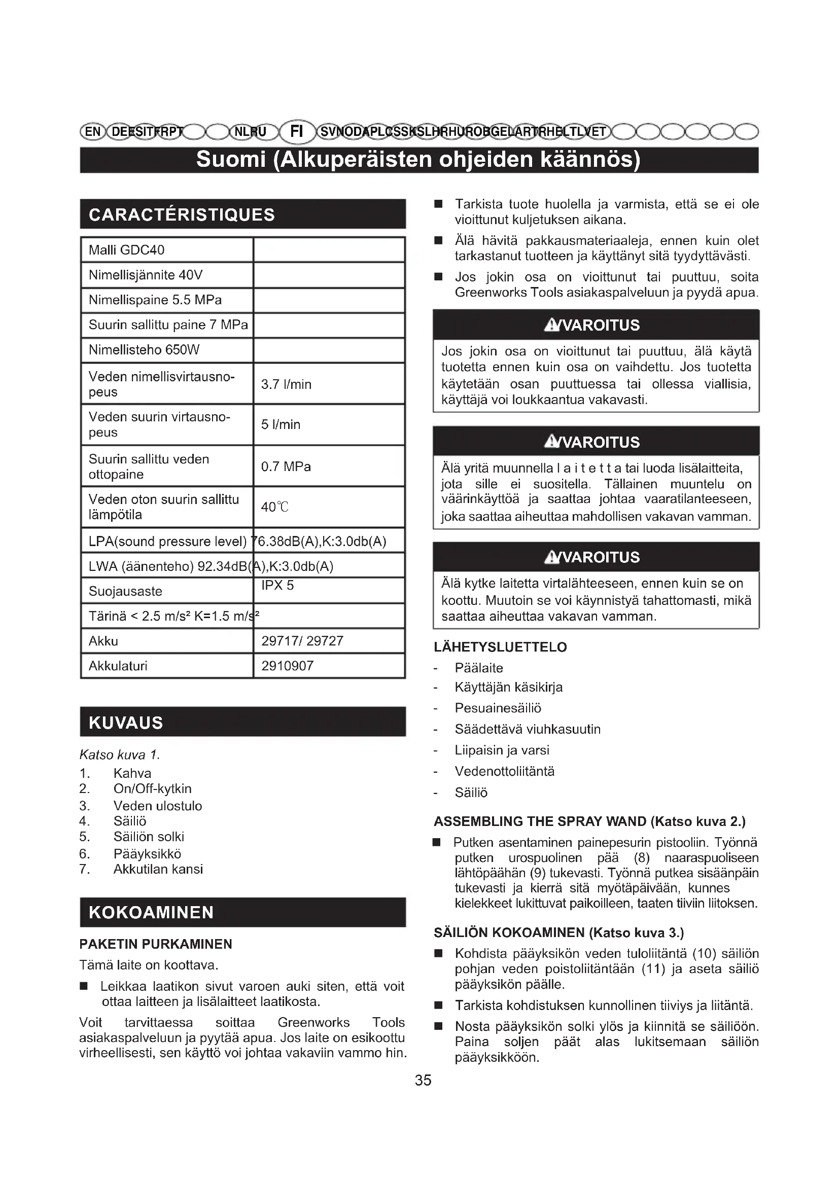 KOKOAMINEN PAKETIN PURKAMINEN Tämä laite on koottava. Leikkaa laatikon sivut varoen auki siten, että voit ottaa laitteen ja lisälaitteet laatikosta. Voit tarvittaessa soittaa Greenworks Tools asiakaspalveluun ja pyytää apua. Jos laite on esikoottu virheellisesti, sen käyttö voi johtaa vakaviin vammo hin. Tarkista tuote huolella ja varmista, että se ei ole vioittunut kuljetuksen aikana. Älä hävitä pakkausmateriaaleja, ennen kuin olet tarkastanut tuotteen ja käyttänyt sitä tyydyttävästi. Jos jokin osa on vioittunut tai puuttuu, soita Greenworks Tools asiakaspalveluun ja pyydä apua. VVAROITUS Jos jokin osa on vioittunut tai puuttuu, älä käytä tuotetta ennen kuin osa on vaihdettu. Jos tuotetta käytetään osan puuttuessa tai ollessa viallisia, käyttäjä voi loukkaantua vakavasti. VVAROITUS Älä yritä muunnella l a i t e t t a tai luoda lisälaitteita, jota sille ei suositella. Tällainen muuntelu on väärinkäyttöä ja saattaa johtaa vaaratilanteeseen, joka saattaa aiheuttaa mahdollisen vakavan vamman. VVAROITUS Älä kytke laitetta virtalähteeseen, ennen kuin se on koottu. Muutoin se voi käynnistyä tahattomasti, mikä saattaa aiheuttaa vakavan vamman. LÄHETYSLUETTELO - Päälaite - Käyttäjän käsikirja - Pesuainesäiliö - Säädettävä viuhkasuutin - Liipaisin ja varsi - Vedenottoliitäntä - Säiliö ASSEMBLING THE SPRAY WAND (Katso kuva 2.) Putken asentaminen painepesurin pistooliin. Työnnä putken urospuolinen pää (8) naaraspuoliseen lähtöpäähän (9) tukevasti. Työnnä putkea sisäänpäin tukevasti ja kierrä sitä myötäpäivään, kunnes kielekkeet lukittuvat paikoilleen, taaten tiiviin liitoksen. SÄILIÖN KOKOAMINEN (Katso kuva 3.) Kohdista pääyksikön veden tuloliitäntä (10) säiliön pohjan veden poistoliitäntään (11) ja aseta säiliö pääyksikön päälle. Tarkista kohdistuksen kunnollinen tiiviys ja liitäntä. Nosta pääyksikön solki ylös ja kiinnitä se säiliöön. Paina soljen päät alas lukitsemaan säiliön pääyksikköön.36 Suomi (Alkuperäisten ohjeiden käännös)