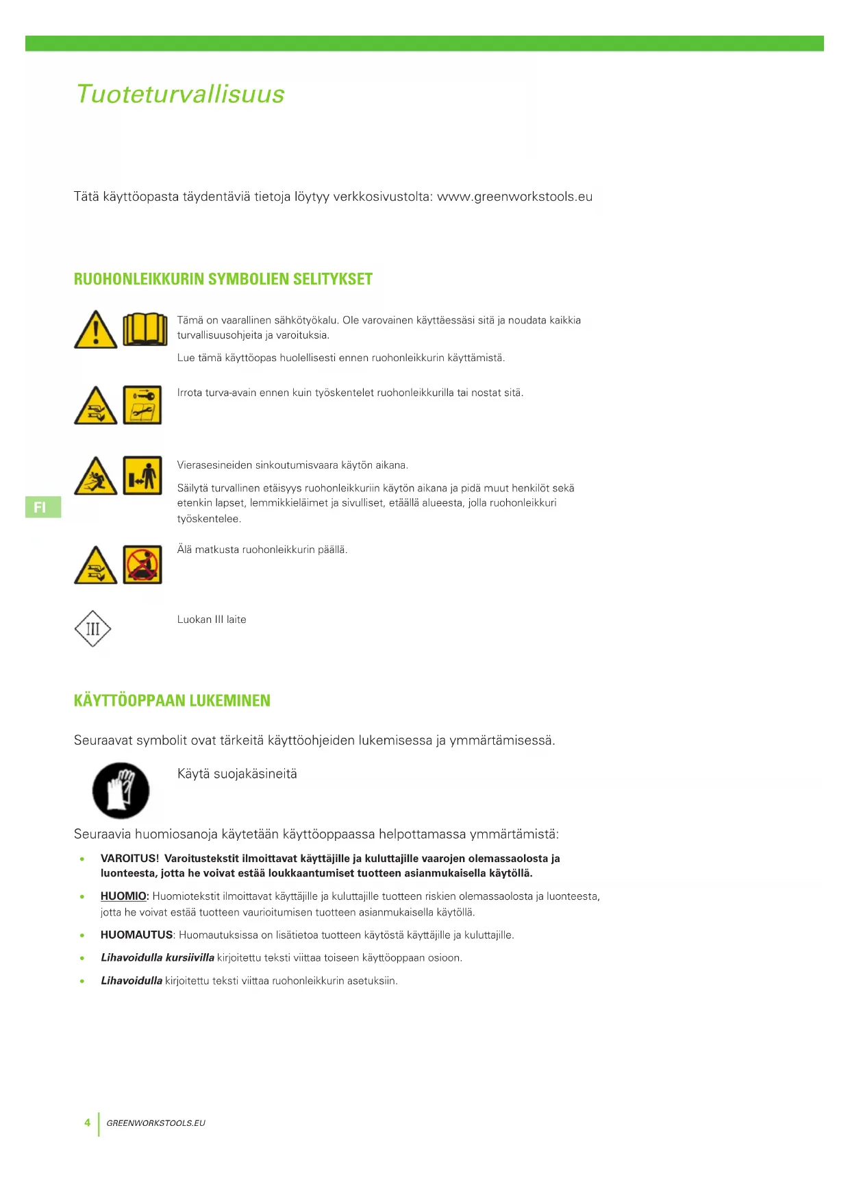 Tämä on vaarallinen sähkötyökalu. Ole varovainen käyttäessäsi sitä ja noudata kaikkia turvallisuusohjeita ja varoituksia. Lue tämä käyttöopas huolellisesti ennen ruohonleikkurin käyttämistä. Irrota turva-avain ennen kuin työskentelet ruohonleikkurilla tai nostat sitä. Vierasesineiden sinkoutumisvaara käytön aikana. Säilytä turvallinen etäisyys ruohonleikkuriin käytön aikana ja pidä muut henkilöt sekä etenkin lapset, lemmikkieläimet ja sivulliset, etäällä alueesta, jolla ruohonleikkuri työskentelee. Älä matkusta ruohonleikkurin päällä. Luokan III laite Tätä käyttöopasta täydentäviä tietoja löytyy verkkosivustolta: www.greenworkstools.eu