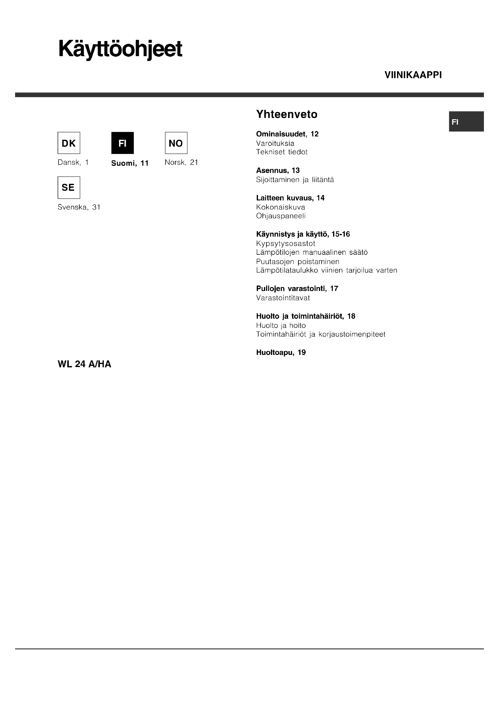 195092482.01 - B 08/2012FI UUNI WL 24 A/HA Yhteenveto Ominaisuudet, 12 Varoituksia Tekniset tiedot Asennus, 13 Sijoittaminen ja liitäntä Laitteen kuvaus, 14 Kokonaiskuva Ohjauspaneeli Käynnistys ja käyttö, 15-16 Kypsytysosastot Lämpötilojen manuaalinen säätö Puutasojen poistaminen Lämpötilataulukko viinien tarjoilua varten Pullojen varastointi, 17 Varastointitavat Huolto ja toimintahäiriöt, 18 Huolto ja hoito Toimintahäiriöt ja korjaustoimenpiteet Huoltoapu, 19 Käyttöohjeet VIINIKAAPPI Suomi, 11
