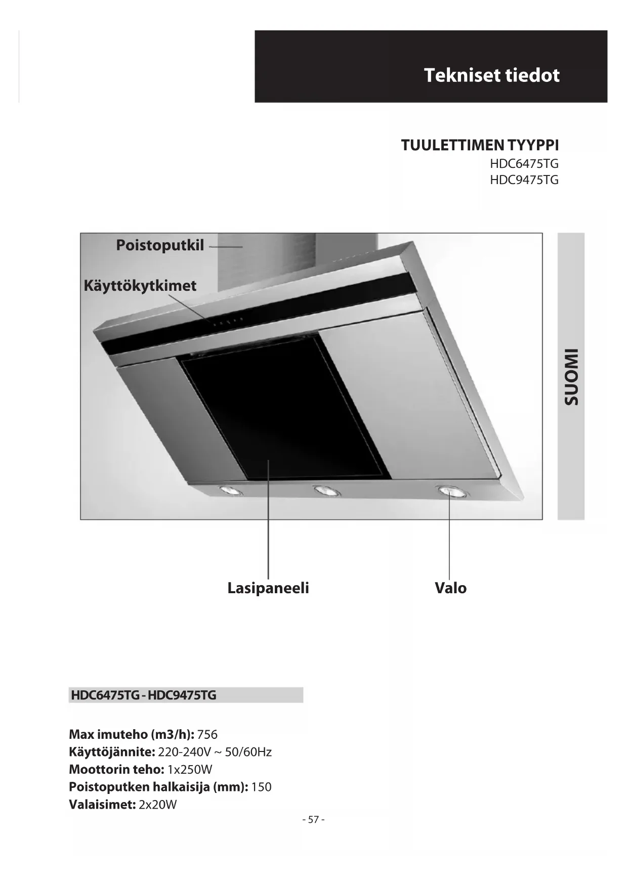 SUOMI Tekniset tiedot Teräspaneeli Poistoputkil Käyttökytkimet Lasi Valo TUULETTIMEN TYYPPI Max imuteho (m3/h): 756 Käyttöjännite: 220-240V ~ 50/60Hz Moottorin teho: 1x250W Poistoputken halkaisija (mm): 150 Valaisimet: 2x20W- 57 - HDC6475TG HDC9475TG