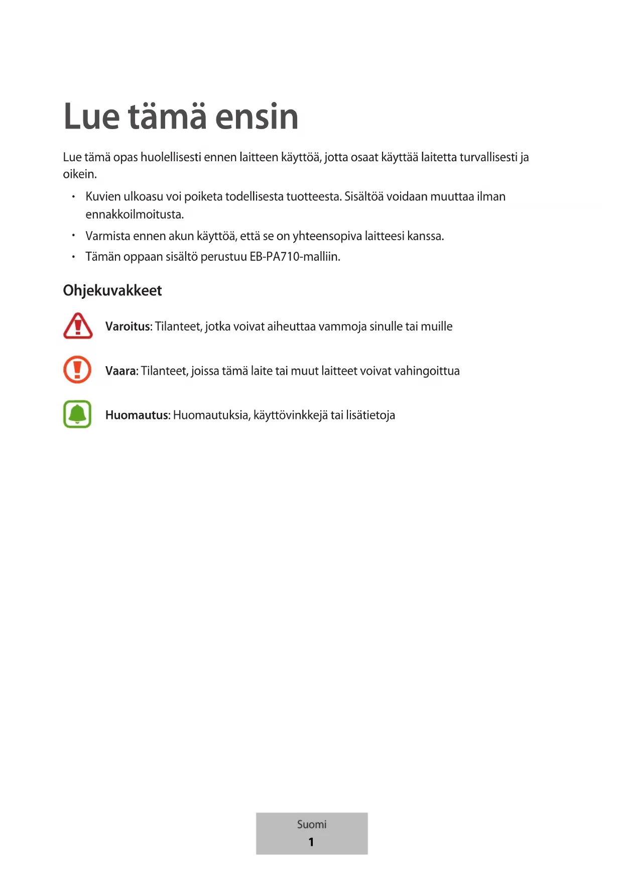 Tämän oppaan sisältö perustuu EB-PA710-malliin. Ohjekuvakkeet Varoitus: Tilanteet, jotka voivat aiheuttaa vammoja sinulle tai muille Vaara: Tilanteet, joissa tämä laite tai muut laitteet voivat vahingoittua Huomautus: Huomautuksia, käyttövinkkejä tai lisätietoja Suomi
