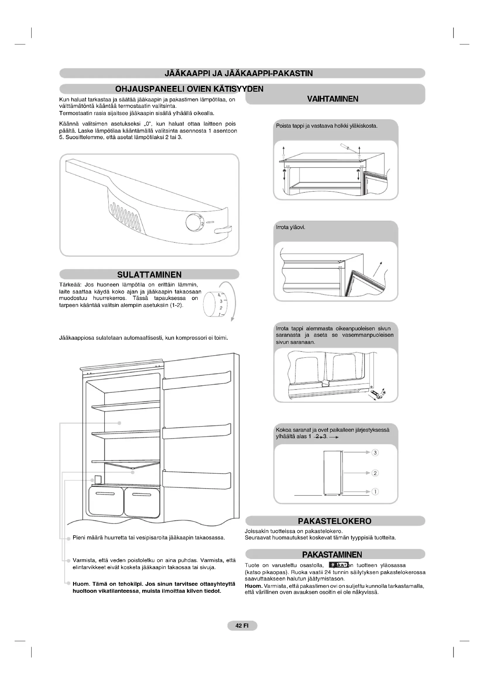 SULATTAMINEN Tärkeää: Jos huoneen lämpötila on erittäin lämmin, laite saattaa käydä koko ajan ja jääkaapin takaosaan muodostuu huurrekerros. Tässä tapauksessa on tarpeen kääntää valitsin alempiin asetuksiin (1-2). Jääkaappiosa sulatetaan automaattisesti, kun kompressori ei toimi. Pieni määrä huurretta tai vesipisaroita jääkaapin takaosassa. Varmista, että veden poistoletku on aina puhdas. Varmista, että elintarvikkeet eivät kosketa jääkaapin takaosaa tai sivuja. Huom. Tämä on tehokilpi. Jos sinun tarvitsee ottaayhteyttä huoltoon vikatilanteessa, muista ilmoittaa kilven tiedot. Poista tappi ja vastaava holkki yläkiskosta. Irrota yläovi. Irrota tappi alemmasta oikeanpuoleisen sivun saranasta ja aseta se vasemmanpuoleisen sivun saranaan. Kokoa saranat ja ovet paikalleen järjestyksessä ylhäältä alas 1 2 3. PAKASTELOKERO Joissakin tuotteissa on pakastelokero. Seuraavat huomautukset koskevat tämän tyyppisiä tuotteita. PAKASTAMINEN Tuote on varustettu osastolla, joka on tuotteen yläosassa (katso pikaopas). Ruoka vaatii 24 tunnin säilytyksen pakastelokerossa saavuttaakseen halutun jäätymistason. Huom. Varmista , ett ä pakastimen ovi on suljet tu kunnolla tarkastamalla, että värillinen oven avauksen osoitin ei ole näkyvissä.43 FI