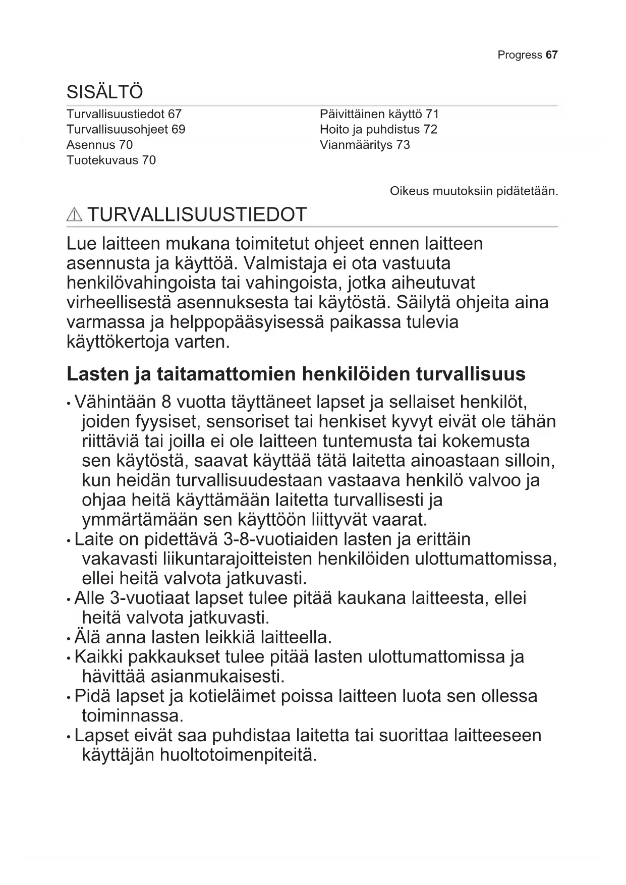 - Lapset eivät saa puhdistaa laitetta tai suorittaa laitteeseen käyttäjän huoltotoimenpiteitä. Progress 67Yleiset turvallisuusohjeet