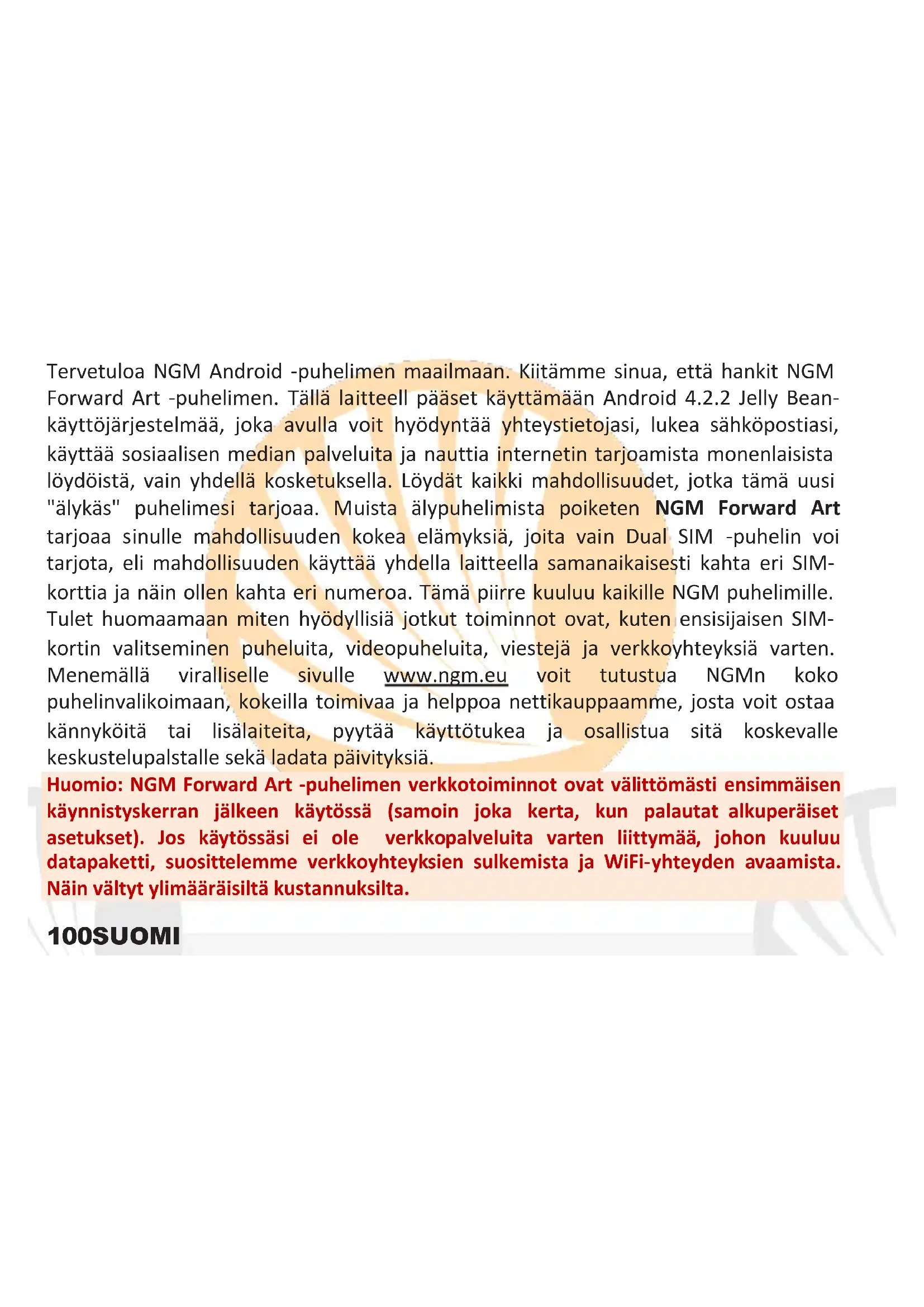 Copyright © 2014 NGM Italia Ingen del af denne manual må reproduceres, distribueres, oversættes, transmitteres i nogen form eller på nogen måde, elektronisk eller mekanisk, herunder fotokopiering, optagelse eller lagring i informationen opbevaring eller søgesystem uden forudgående skriftlig tilladelse fra NGM Italia. Bluetooth ® er et registreret varemærke i verden af Bluetooth SIG, Inc. Wi-Fi ® og Wi-Fi-logoet er registrerede varemærker tilhørende Wi-Fi Alliance.100 SUOMI Tervetuloa NGM Android -puhelimen maailmaan. Kiitämme sinua, että hankit NGM Forward Art -puhelimen. Tällä laitteell pääset käyttämään Android 4.2.2 Jelly Bean- käyttöjärjestelmää, joka avulla voit hyödyntää yhteystietojasi, lukea sähköpostiasi, käyttää sosiaalisen median palveluita ja nauttia internetin tarjoamista monenlaisista löydöistä, vain yhdellä kosketuksella. Löydät kaikki mahdollisuudet, jotka tämä uusi "älykäs" puhelimesi tarjoaa. Muista älypuhelimista poiketen NGM Forward Art tarjoaa sinulle mahdollisuuden kokea elämyksiä, joita vain Dual SIM -puhelin voi tarjota, eli mahdollisuuden käyttää yhdella laitteella samanaikaisesti kahta eri SIM- korttia ja näin ollen kahta eri numeroa. Tämä piirre kuuluu kaikille NGM puhelimille. Tulet huomaamaan miten hyödyllisiä jotkut toiminnot ovat, kuten ensisijaisen SIM- kortin valitseminen puheluita, videopuheluita, viestejä ja verkkoyhteyksiä varten. Menemällä viralliselle sivulle www.ngm.eu voit tutustua NGMn koko puhelinvalikoimaan, kokeilla toimivaa ja helppoa nettikauppaamme, josta voit ostaa kännyköitä tai lisälaiteita, pyytää käyttötukea ja osallistua sitä koskevalle keskustelupalstalle sekä ladata päivityksiä. Huomio: NGM Forward Art -puhelimen verkkotoiminnot ovat välittömästi ensimmäisen käynnistyskerran jälkeen käytössä (samoin joka kerta, kun palautat alkuperäiset asetukset). Jos käytössäsi ei ole verkkopalveluita varten liittymää, johon kuuluu datapaketti, suosittelemme verkkoyhteyksien sulkemista ja WiFi-yhteyden avaamista. Näin vältyt ylimääräisiltä kustannuksilta.101SUOMI Käytön aloitus SIM-kortin asettaminen puhelimeen: SIM-kortit sisältävät puhelinnumerot, PIN- tunnukset, verkkoyhteydet ja paljon muita tietoja. Ennen korttien paikoilleen asettamista on virta kytkettävä pois puhelimesta. Tämän jälkeen puhelimen takakannen voi avata alalosassa olevan aukon kautta. Poista sitten akku ja aseta SIM-kortit paikoilleen niin, että metalliset kontaktit ovat alaspäin. Muistikortin asettaminen puhelimeen: NGM Forward Art -puhelimen toimintaa tukemaan suosittelemme mikroSD-muistikortin käyttöä, joka asetetaan puhelimen takaosaan. Sulje ensin puhelin. Poista sitten takana oleva kuori ja akku. Aseta lopuksi SD-muistikortti paikoilleen kuvan osoittamalla tavalla, niin että metalliset kontaktit ovat alaspäin.