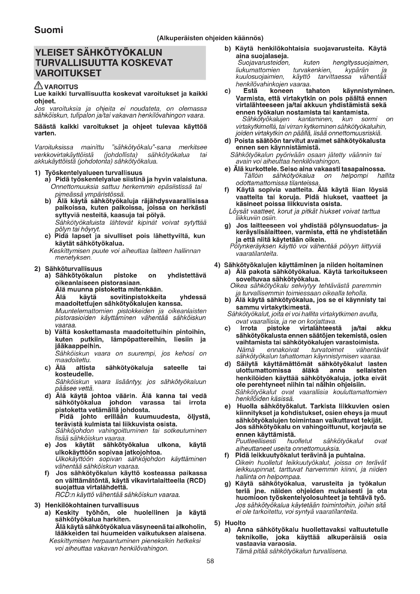 TURVALLISUUTTA KOSKEVAT VAROITUKSET VAROITUS Lue kaikki turvallisuutta koskevat varoitukset ja kaikki ohjeet. Jos varoituksia ja ohjeita ei noudateta, on olemassa sähköiskun, tulipalon ja/tai vakavan henkilövahingon vaara. Säästä kaikki varoitukset ja ohjeet tulevaa käyttöä varten. Varoituksissa mainittu ”sähkötyökalu”-sana merkitsee verkkovirtakäyttöistä (johdollista) sähkötyökalua tai akkukäyttöistä (johdotonta) sähkötyökalua.