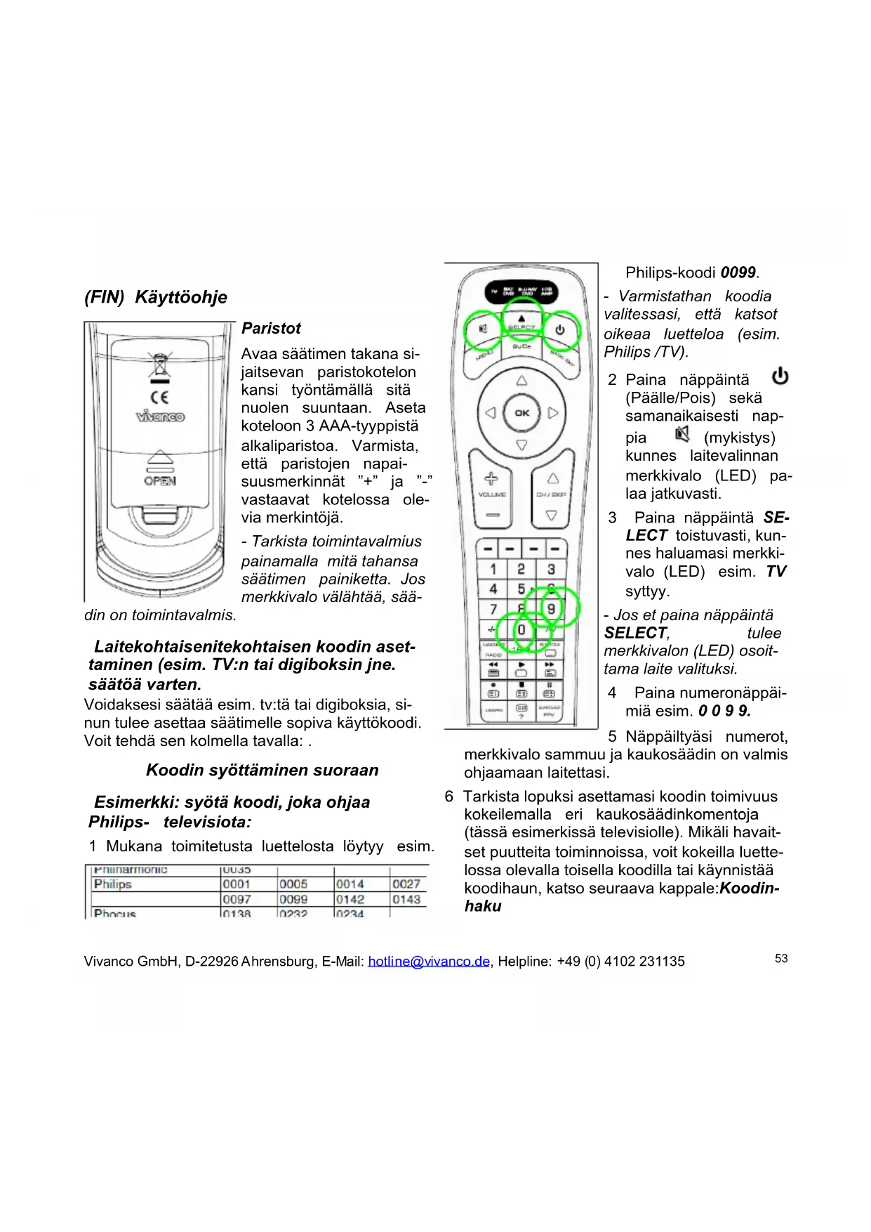 1 Tryck på knappen (På/Av) och samtidigt på knappen VOLUME tills apparatlampan (LED) lyser kontinuerligt. 2 Tryck på knappen 0 , för att upphäva inlåsnin- gen. Programmering av Makron (Hemmabio Ap- plikation) (UR 2400) Du kan programmera upp till 5 sekvenser, som kallas makron, bestående av upp till 16 kontrol kommandon, som alla aktiveras med en knapp. 1 Tryck på knappen LEARN och samtidigt på knappen (På/Av) tills en apparatlampa (LED) lyser kontinuerligt. 2 Tryck på knappen SELECT tills apparatlam- pan (LED) lyser för önskad apparat, där mak- rot ska programmeras t. ex. TV. 3 Tryck på önskad knapp t. ex. RED, där mak- rot skall programmeras. LED-lampan blinkar två gånger och lyser sedan kontinuerligt. 4 Programmera makrosekvensen, t. ex. "Alla apparater Av", med att trycka på knapparna SELECT TV, (på/av), SELECT SAT/DVB, (På/Av), SELECT BLURAY/DVD, (på/av), SELECT HTS/AMP, (på/av). - När minnet är fullt, blinkar LED-lampan två gånger och inmatningen av makrot avslutas. 5 Tryck på knappen LEARN för att spara mak- rot och för att avsluta inmatningen. 6 Testa makrot genom att trycka på vald mak- Vivanco GmbH, D-22926 Ahrensburg, E-Mail: hotline@vivanco.de, Helpline: +49 (0) 4102 231135 51roknapp t. ex. knappen RED. Härmed bör alla apparater slå från. - Du kan programmera upp till 5 makrosek- venser. Radering av makron 1 Tryck på knappen LEARN och samtidigt på knappen (på/av) tills en apparatlampa (LED) lyser kontinuerligt. 2 Tryck på knappen SELECT tills apparatlam- pan (LED) lyser för önskad apparat, där mak- rot ska raderas t. ex. TV. 3 Tryck på önskad knapp t. ex. RED, där mak- rot ska raderas ca. 3 sekunder tills LED-lam- pan blinkar två gånger. 4 Tryck på knappen LEARN för att avsluta radering av makron. Belysning av knappar 1 Tryck på knappen (På/Av) och samtidigt på knappen CH/SKIP▼ tills apparatlampan (LED) blinkar två gånger. Knappbelysningen kopplas av. 2 Tryck på knappen (På/Av) och samtidigt på knappen CH/SKIP▲ tills apparatlampan (LED) blinkar två gånger. Knappbelysningen kopplas på. Manövrering Du använder universalfjärrkontrollen praktiskt taget precis på samma sätt som originalfjärr- kontrollen. Eftersom symbolerna på universal- fjärrkontrollen kan skilja sig från symbolerna på originalfjärrkontrollen, så måste du i vissa fall prova dig fram med alla knappar för att hitta funktionerna. Tekniska data Batterier: 3 x AAA-batterier, R03, UM4 Räckvidd: max 7 m Inte för 400 kHz-utrustning 2 års fabriksgaranti Om din universalfjärrkontrol skulle upphöra att fungera inom 2 år från inköpsdatum, så får du utan kostnad en ny från Vivanco. Undantag: sak- nade koder, avsiktlig förstöring och normalt sli- tage på hölje och knappar. Vivanco GmbH, D-22926 Ahrensburg, E-Mail: hotline@vivanco.de, Helpline: +49 (0) 4102 231135 52(FIN) Käyttöohje Paristot Avaa säätimen takana si- jaitsevan paristokotelon kansi työntämällä sitä nuolen suuntaan. Aseta koteloon 3 AAA-tyyppistä alkaliparistoa. Varmista, että paristojen napai- suusmerkinnät ”+” ja ”-” vastaavat kotelossa ole- via merkintöjä. - Tarkista toimintavalmius painamalla mitä tahansa säätimen painiketta. Jos merkkivalo välähtää, sää- din on toimintavalmis. Laitekohtaisenitekohtaisen koodin aset- taminen (esim. TV:n tai digiboksin jne. säätöä varten. Voidaksesi säätää esim. tv:tä tai digiboksia, si- nun tulee asettaa säätimelle sopiva käyttökoodi. Voit tehdä sen kolmella tavalla: . Koodin syöttäminen suoraan Esimerkki: syötä koodi, joka ohjaa Philips- televisiota: 1 Mukana toimitetusta luettelosta löytyy esim. Philips-koodi 0099. - Varmistathan koodia valitessasi, että katsot oikeaa luetteloa (esim. Philips /TV). 2 Paina näppäintä (Päälle/Pois) sekä samanaikaisesti nap- pia (mykistys) kunnes laitevalinnan merkkivalo (LED) pa- laa jatkuvasti. 3 Paina näppäintä SE- LECT toistuvasti, kun- nes haluamasi merkki- valo (LED) esim. TV syttyy. - Jos et paina näppäintä SELECT, tulee merkkivalon (LED) osoit- tama laite valituksi. 4 Paina numeronäppäi- miä esim. 0 0 9 9. 5 Näppäiltyäsi numerot, merkkivalo sammuu ja kaukosäädin on valmis ohjaamaan laitettasi. 6 Tarkista lopuksi asettamasi koodin toimivuus kokeilemalla eri kaukosäädinkomentoja (tässä esimerkissä televisiolle). Mikäli havait- set puutteita toiminnoissa, voit kokeilla luette- lossa olevalla toisella koodilla tai käynnistää koodihaun, katso seuraava kappale:Koodin- haku Vivanco GmbH, D-22926 Ahrensburg, E-Mail: hotline@vivanco.de, Helpline: +49 (0) 4102 231135 537 Aseta käyttökoodi muille laitteille samalla tavalla. Painat vain TV-painikkeen sijasta jotakin toista näppäintä esim. SAT/DVB (Di- giboksi) tai DVD/BLU RAY tai HTS/AMP(ko- skee ainoastaan mallia UR 2400). - Voit poistua koodien ohjelmointitilasta paina- malla näppäintä tai keskeyttämällä koodien näppäilemisen yli 10 sekunnin ajaksi. - Jos merkkivalo välähtää kahdesti, koodia ei hyväksytä ja koodin syöttäminen voidaan aloit- taa uudelleen. Koodinhaku Jos et löydä laitteesi merkkiä koodiluettelosta, tai mikään siinä olevista koodeista ei toimi, voit käyttää koodinhakua. Manuaalinen ja automaattinen koodinhaku 1 Kytke virta päälle lait- teeseen, jota haluat ohjata. Varmista, että laite on ohjelmatilassa (ei valmiustilassa). 2 Paina näppäintä (Päälle/Pois) ja samanaikaisesti näp- päintä (mykistys) kunnes laitevalinnan merkkivalo (LED) pa- laa jatkuvasti. 3 Paina näppäintä SE- LECT kunnes halua- masi merkkivalo (LED) esim. TV syttyy. 4 Suuntaa kaukosäädin kohti laitetta, jota ha- luat ohjata.. 5 Paina näppäintä CH/SKIP▲ tai CH/SKIP▼ toistuvasti noin sekunnin välein, kunnes laite reagoi sammuttamalla virran. - Voit vaihtaa hakusuuntaa milloin tahansa pain- amalla näppäintä ▲ tai ▼. – Jos laitteesta on ehtinyt sammua virta, on se kytkettävä uudelleen päälle haun jatkamiseksi. – Kun laite reagoi, v