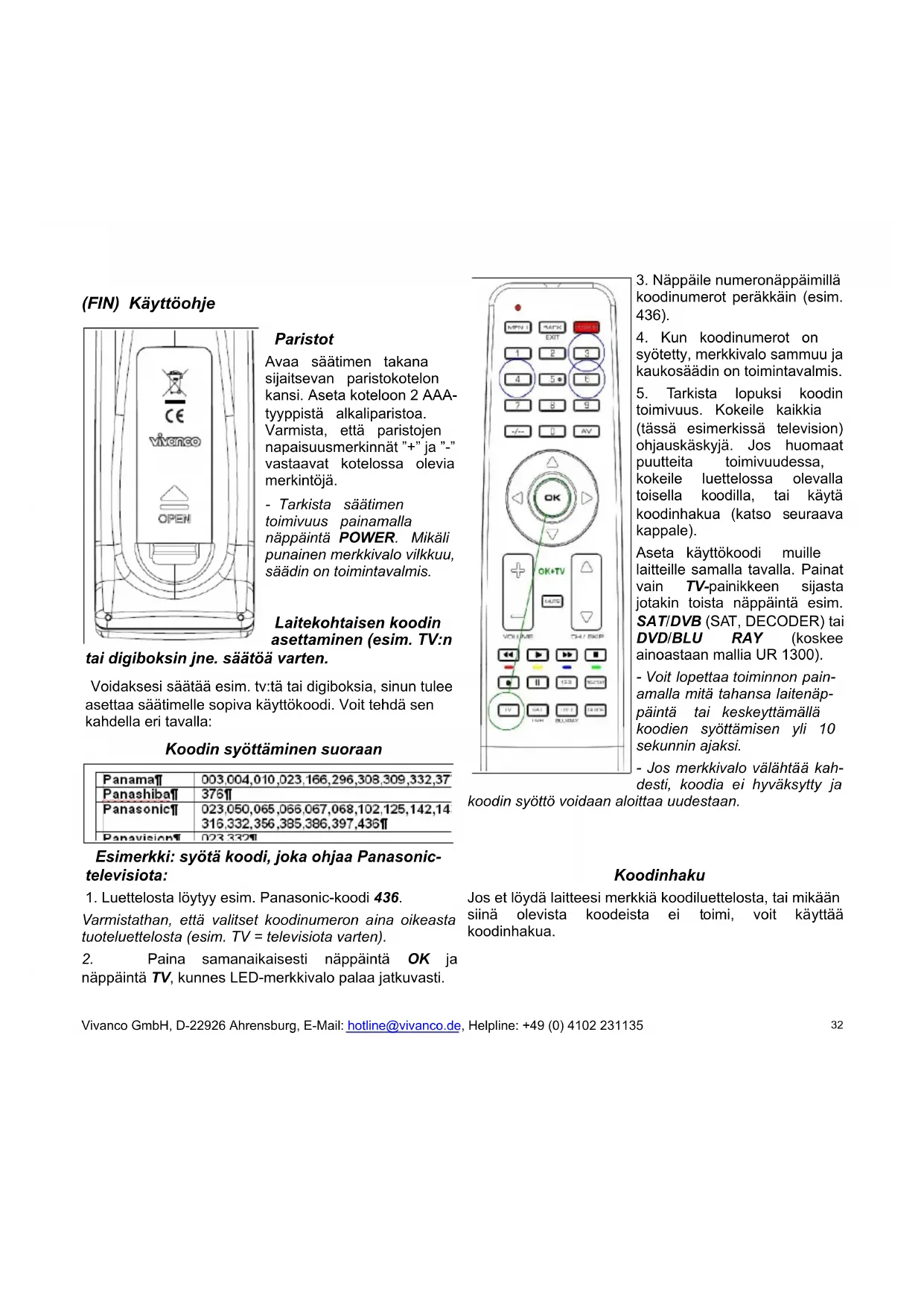 toimivuus. Kokeile kaikkia (tässä esimerkissä television) ohjauskäskyjä. Jos huomaat puutteita toimivuudessa, kokeile luettelossa olevalla toisella koodilla, tai käytä koodinhakua (katso seuraava kappale). Aseta käyttökoodi muille laitteille samalla tavalla. Painat vain TV-painikkeen sijasta jotakin toista näppäintä esim. SAT/DVB (SAT, DECODER) tai DVD/BLU RAY (koskee ainoastaan mallia UR 1300). - Voit lopettaa toiminnon pain- amalla mitä tahansa laitenäp- päintä tai keskeyttämällä koodien syöttämisen yli 10 sekunnin ajaksi. - Jos merkkivalo välähtää kah- desti, koodia ei hyväksytty ja koodin syöttö voidaan aloittaa uudestaan. Koodinhaku Jos et löydä laitteesi merkkiä koodiluettelosta, tai mikään siinä olevista koodeista ei toimi, voit käyttää koodinhakua. Vivanco GmbH, D-22926 Ahrensburg, E-Mail: hotline@vivanco.de, Helpline: +49 (0) 4102 231135 32Manuaalinen koodinhaku