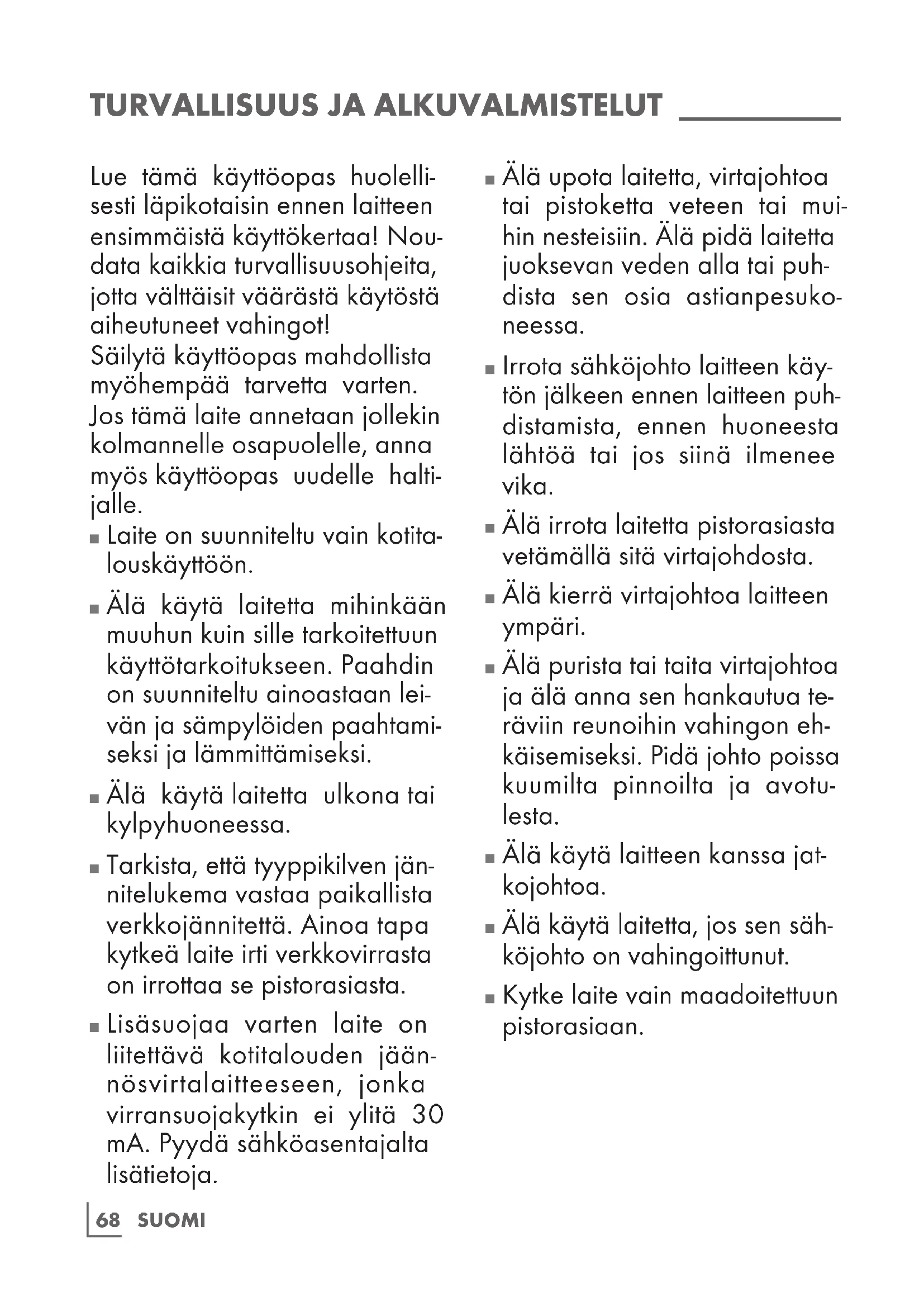 Lue tämä käyttöopas huolelli- sesti läpikotaisin ennen laitteen ensimmäistä käyttökertaa! Nou- data kaikkia turvallisuusohjeita, jotta välttäisit väärästä käytöstä aiheutuneet vahingot! Säilytä käyttöopas mahdollista myöhempää tarvetta varten. Jos tämä laite annetaan jollekin kolmannelle osapuolelle, anna myös käyttöopas uudelle halti- jalle.