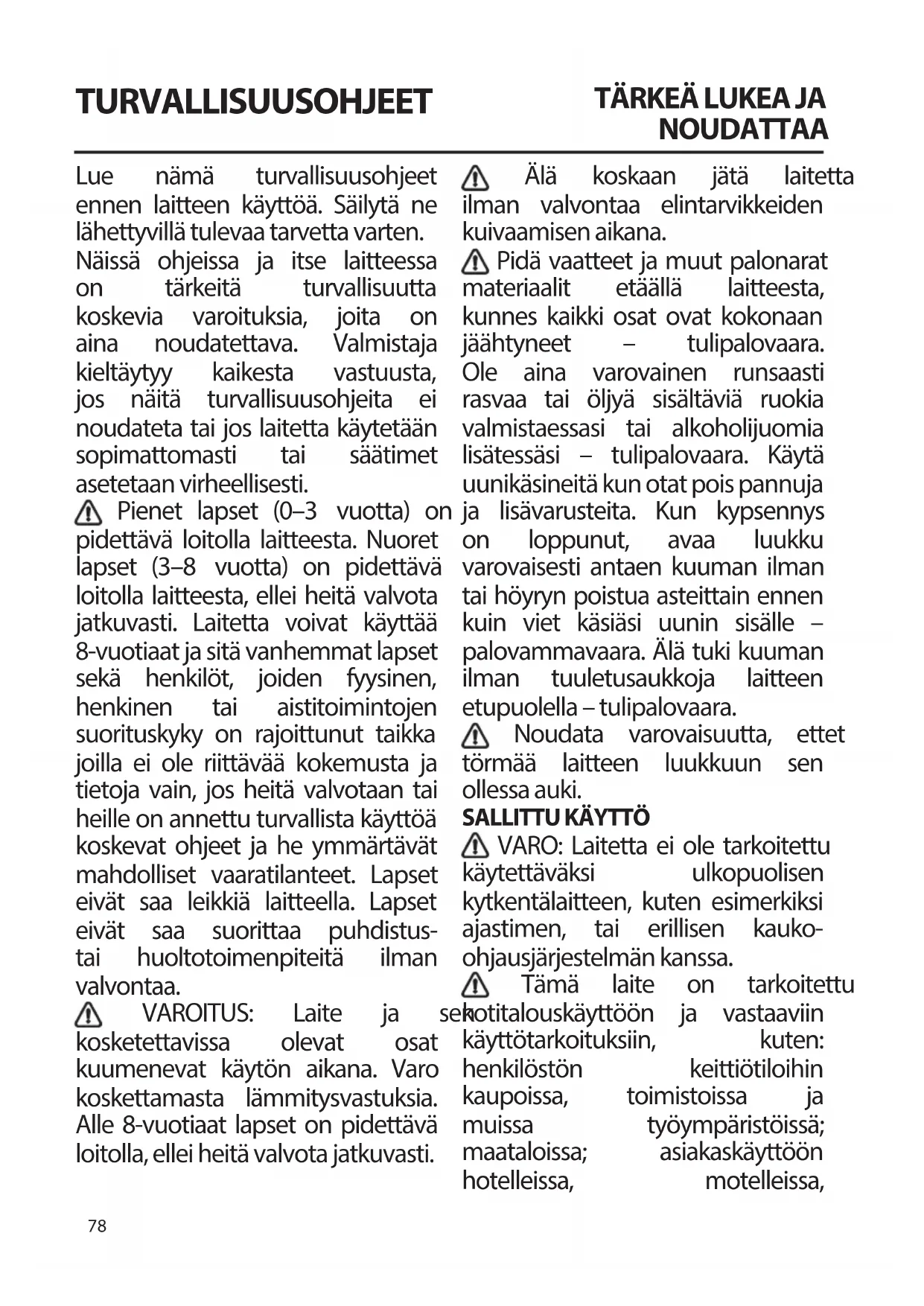 NOUDATTAA Lue nämä turvallisuusohjeet ennen laitteen käyttöä. Säilytä ne lähettyvillä tulevaa tarvetta varten. Näissä ohjeissa ja itse laitteessa on tärkeitä turvallisuutta koskevia varoituksia, joita on aina noudatettava. Valmistaja kieltäytyy kaikesta vastuusta, jos näitä turvallisuusohjeita ei noudateta tai jos laitetta käytetään sopimattomasti tai säätimet asetetaan virheellisesti. Pienet lapset (0–3 vuotta) on pidettävä loitolla laitteesta. Nuoret lapset (3–8 vuotta) on pidettävä loitolla laitteesta, ellei heitä valvota jatkuvasti. Laitetta voivat käyttää 8-vuotiaat ja sitä vanhemmat lapset sekä henkilöt, joiden fyysinen, henkinen tai aistitoimintojen suorituskyky on rajoittunut taikka joilla ei ole riittävää kokemusta ja tietoja vain, jos heitä valvotaan tai heille on annettu turvallista käyttöä koskevat ohjeet ja he ymmärtävät mahdolliset vaaratilanteet. Lapset eivät saa leikkiä laitteella. Lapset eivät saa suorittaa puhdistus- tai huoltotoimenpiteitä ilman valvontaa. VAROITUS: Laite ja sen kosketettavissa olevat osat kuumenevat käytön aikana. Varo koskettamasta lämmitysvastuksia. Alle 8-vuotiaat lapset on pidettävä loitolla, ellei heitä valvota jatkuvasti. Älä koskaan jätä laitetta ilman valvontaa elintarvikkeiden kuivaamisen aikana. Pidä vaatteet ja muut palonarat materiaalit etäällä laitteesta, kunnes kaikki osat ovat kokonaan jäähtyneet – tulipalovaara. Ole aina varovainen runsaasti rasvaa tai öljyä sisältäviä ruokia valmistaessasi tai alkoholijuomia lisätessäsi – tulipalovaara. Käytä uunikäsineitä kun otat pois pannuja ja lisävarusteita. Kun kypsennys on loppunut, avaa luukku varovaisesti antaen kuuman ilman tai höyryn poistua asteittain ennen kuin viet käsiäsi uunin sisälle – palovammavaara. Älä tuki kuuman ilman tuuletusaukkoja laitteen etupuolella – tulipalovaara. Noudata varovaisuutta, ettet törmää laitteen luukkuun sen ollessa auki.