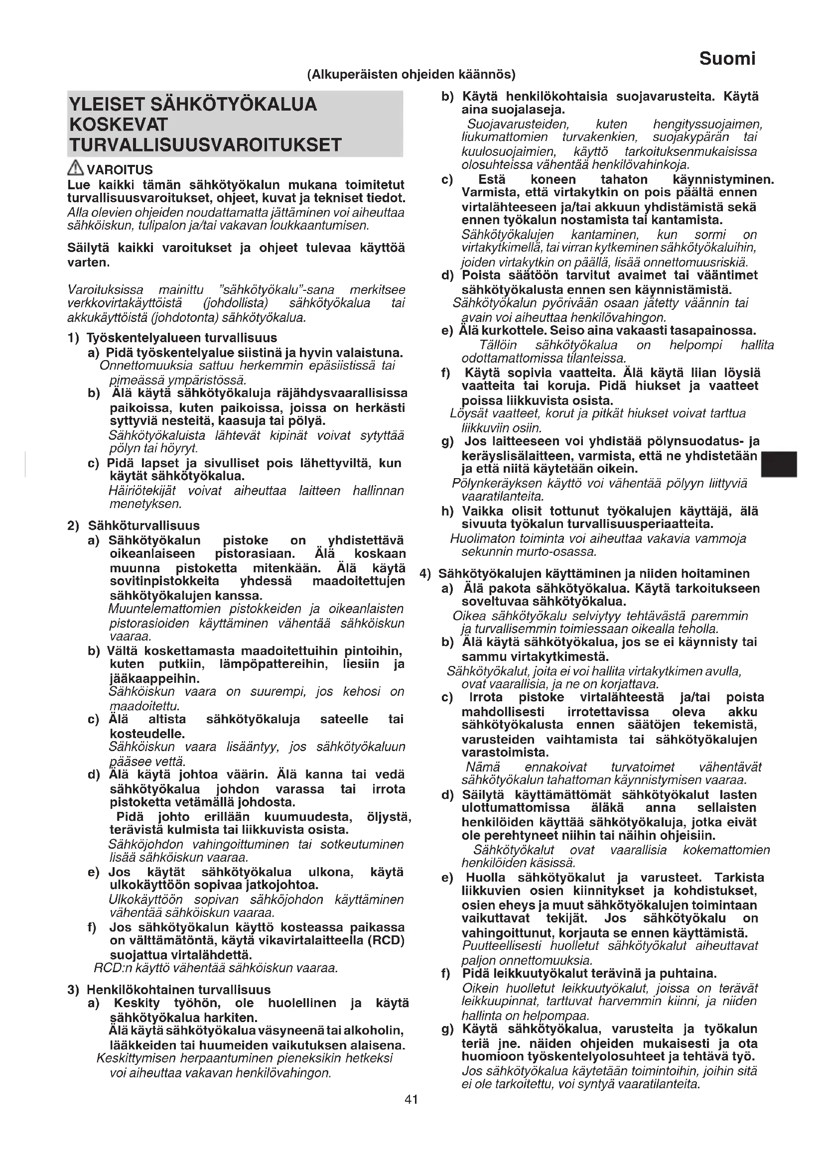 KOSKEVAT TURVALLISUUSVAROITUKSET VAROITUS Lue kaikki tämän sähkötyökalun mukana toimitetut turvallisuusvaroitukset, ohjeet, kuvat ja tekniset tiedot. Alla olevien ohjeiden noudattamatta jättäminen voi aiheuttaa sähköiskun, tulipalon ja/tai vakavan loukkaantumisen. Säilytä kaikki varoitukset ja ohjeet tulevaa käyttöä varten. Varoituksissa mainittu ”sähkötyökalu”-sana merkitsee verkkovirtakäyttöistä (johdollista) sähkötyökalua tai akkukäyttöistä (johdotonta) sähkötyökalua.