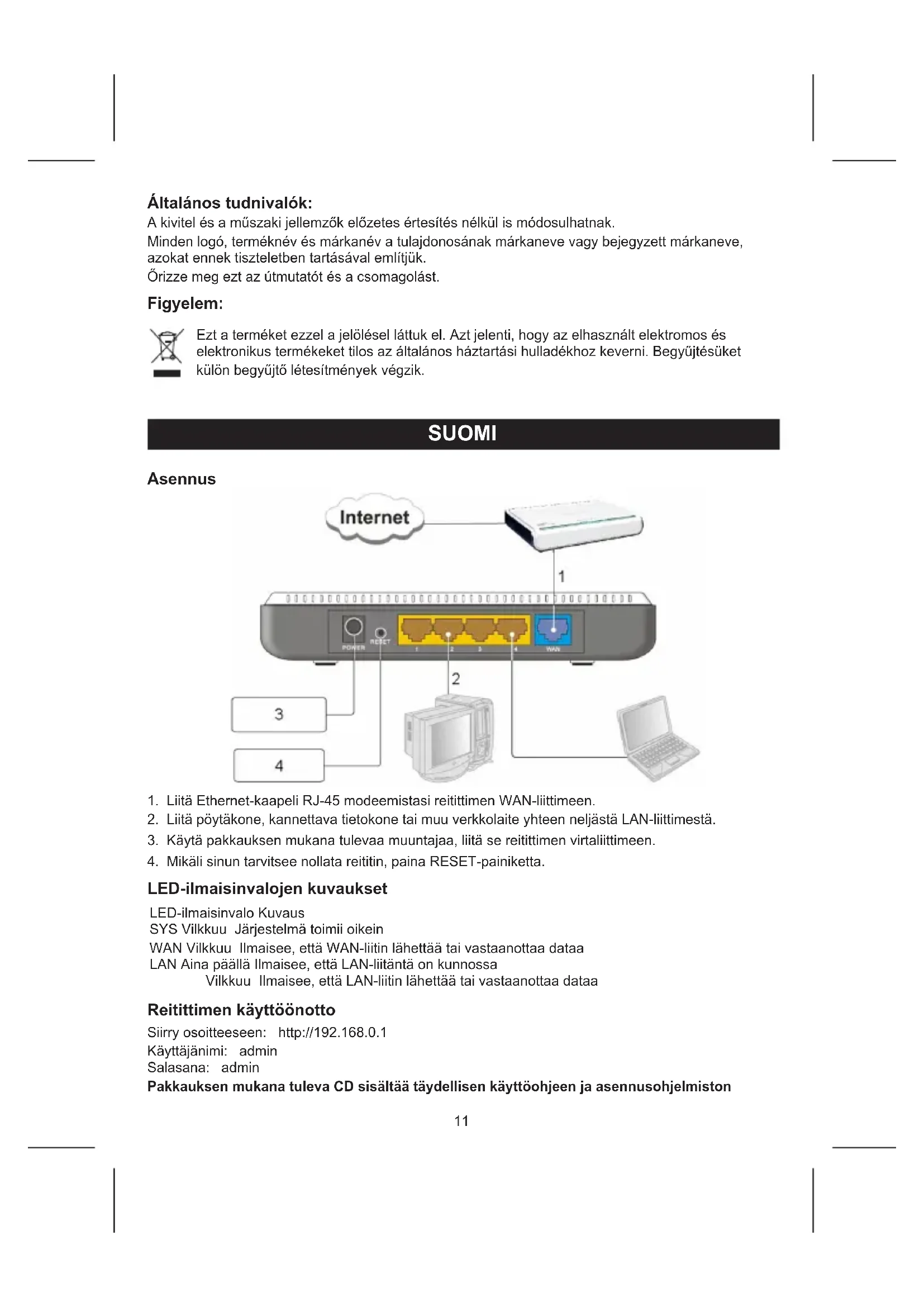 LED-ilmaisinvalojen kuvaukset LED-ilmaisinvalo Kuvaus SYS Vilkkuu Järjestelmä toimii oikein WAN Vilkkuu Ilmaisee, että WAN-liitin lähettää tai vastaanottaa dataa LAN Aina päällä Ilmaisee, että LAN-liitäntä on kunnossa Vilkkuu Ilmaisee, että LAN-liitin lähettää tai vastaanottaa dataa Reitittimen käyttöönotto Siirry osoitteeseen: http://192.168.0.1 Käyttäjänimi: admin Salasana: admin Pakkauksen mukana tuleva CD sisältää täydellisen käyttöohjeen ja asennusohjelmiston12 Turvallisuuteen liittyvät varoitukset: Sähköiskun riskin pienentämiseksi, AINOASTAAN valtuutettu huoltohenkilö saa avata tämän laitteen huoltoa varten. Jos ongelmia ilmenee, irrota laite verkkovirrasta ja muista laitteista. Älä altista laitetta vedelle äläkä kosteudelle. Huolto: Puhdista ainoastaan kuivalla kankaalla. Älä käytä liuottimia tai hankausaineita. Takuu: Takuu ja vastuuvelvollisuus mitätöityvät, jos tuote vaurioituu siihen tehtyjen muutoksien tai sen väärinkäytön takia. Yleistä: Muutoksia malliin ja teknisiin ominaisuuksiin voidaan tehdä ilmoituksetta. Kaikki logot, merkit ja tuotenimet ovat niiden vastaavien omistajien tuotemerkkejä tai rekisteröityjä tuotemerkkejä ja niitä on käsiteltävä sellaisina. Säilytä käyttöohjeet ja pakkaus myöhempää käyttötarvetta varten. Huomio: Tuote on varustettu tällä merkillä. Se merkitsee, ettei käytettyjä sähkö- tai elektronisia tuotteita saa hävittää kotitalousjätteen mukana. Kyseisille tuotteille on olemassa erillinen keräysjärjestelmä. SVENSKA Installation
