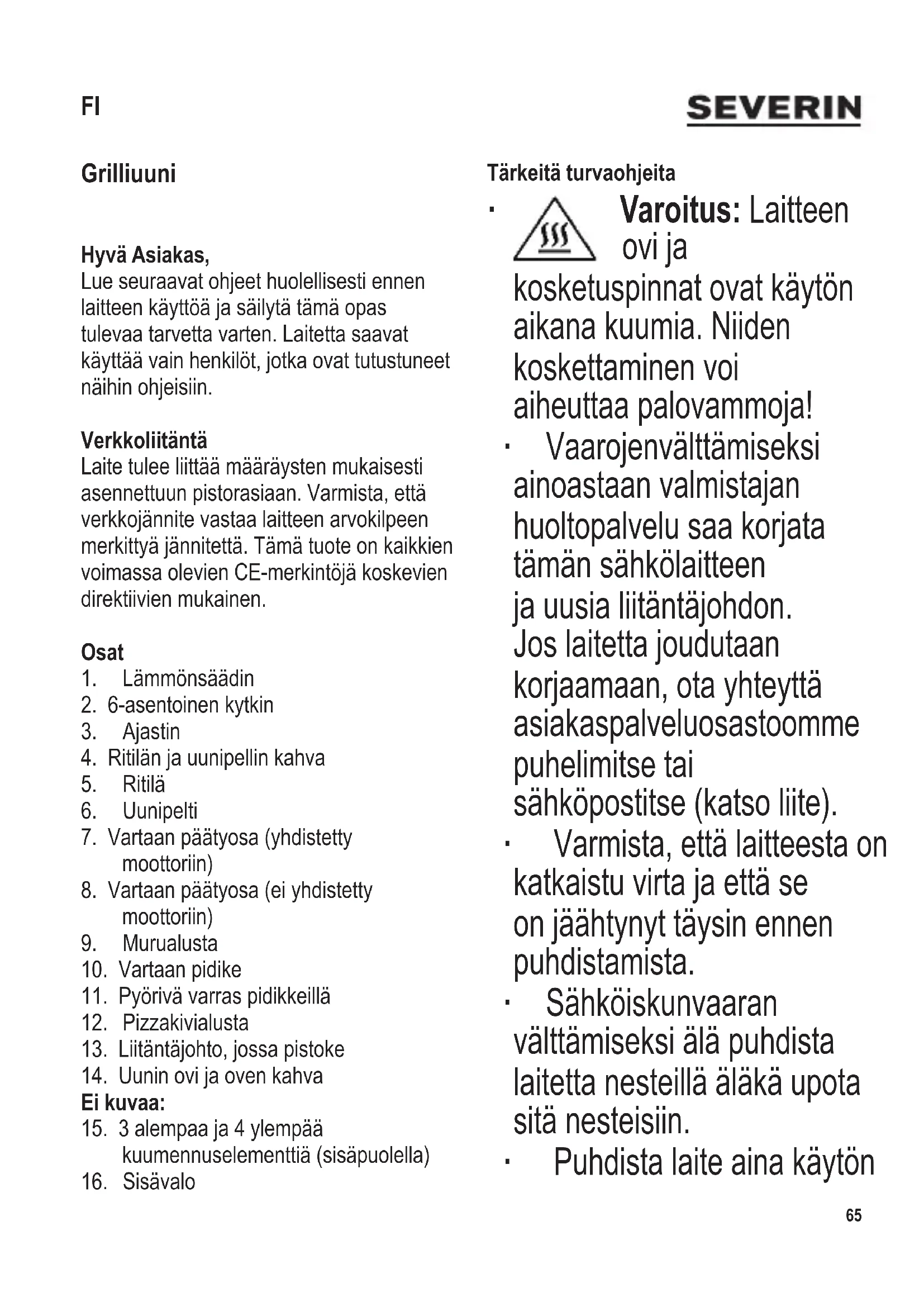 Tärkeitä turvaohjeita ∙ Varoitus: Laitteen ovi ja kosketuspinnat ovat käytön aikana kuumia. Niiden koskettaminen voi aiheuttaa palovammoja! ∙ Vaarojen välttämiseksi ainoastaan valmistajan huoltopalvelu saa korjata tämän sähkölaitteen ja uusia liitäntäjohdon. Jos laitetta joudutaan korjaamaan, ota yhteyttä asiakaspalveluosastoomme puhelimitse tai sähköpostitse (katso liite). ∙ Varmista, että laitteesta on katkaistu virta ja että se on jäähtynyt täysin ennen puhdistamista. ∙ Sähköiskun vaaran välttämiseksi älä puhdista laitetta nesteillä äläkä upota sitä nesteisiin. ∙ Puhdista laite aina käytön FI66 104 x 142 mm jälkeen. ∙ Paistopelti, uuniritilä, kääntövarras ja kiinnittimet voidaan puhdistaa miedolla, kaupoissa myytävällä pesuaineella. Puhdista pizzakivi puukaapimella. ∙ Katso puhdistusohjeet kappaleesta ”Puhdistus ja hoito”. ∙ Tätä laitetta ei ole tarkoitettu käytettäväksi erillisen ajastimen tai kaukosäätimen kanssa. ∙ Tämä laite on tarkoitettu kotitalouskäyttöön tai vastaavaan, kuten - ruokalat, toimistot ja muut kaupalliset ympäristöt, - maatalousyritykset, - hotellien, motellien jne. ja vastaavien yritysten asiakkaat, - aamiaisen ja majoituksen tarjoavat majatalot. ∙ Tätä laitetta saavat käyttää lapset (vähintään 8-vuotiaat) sekä henkilöt, joilla on fyysisesti, aistillisesti tai henkisesti rajoittunut toimintakyky tai joilla on puuttuvat tai vajavaiset tiedot laitteen toiminnasta, mikäli heitä valvotaan tai ohjataan laitteen käytössä ja he ymmärtävät täysin kaikki käyttöön liittyvät vaarat ja turvatoimenpiteet. ∙ Lasten ei saa antaa leikkiä laitteella. ∙ Lasten ei saa antaa tehdä laitteen puhdistus- tai huoltotoimenpiteitä, elleivät he ole aikuisen valvonnassa sekä vähintään 8 vuotta vanhoja. ∙ Laite ja sen liitäntäjohto täytyy aina pitää alle 8-vuotiaiden ulottumattomissa.104 x 142 mm