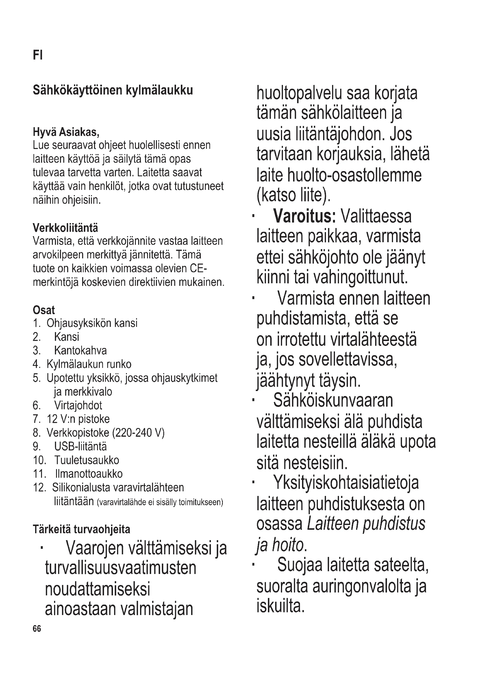Totalvolym (i l) 25 EEI 100 Energieffektivitetsklass E Årlig energiförbrukning (i kWh/a)* 76 Utsläppsklass för luftburet akustiskt buller D Luftburet akustiskt buller (i dB(A) re 1 pW) 49 Klimatklass N Omgivningstemperatur (i °C) 16-32 Lagringstid vid störningar (i h) - Vikt (i kg) 4,7 Vinterkoppling nej Kyl-/frysparametrar: Typ Volym (i l) Rekommenderad temperatur (i °C) Frysningskapacitet (kg/24h) Avfrosta A=automatisk M=manuell Snabbfrysning Skafferifack 25 17 - - - Parametrar för ljuskälla: Typ av ljuskälla - Energieffektivitetsklass - Elektriska data Se typskylt *) Den faktiska elförbrukningen beror på hur apparaten används och hur den är placerad66 104 x 142 mm Sähkökäyttöinen kylmälaukku Hyvä Asiakas, Lue seuraavat ohjeet huolellisesti ennen laitteen käyttöä ja säilytä tämä opas tulevaa tarvetta varten. Laitetta saavat käyttää vain henkilöt, jotka ovat tutustuneet näihin ohjeisiin. Verkkoliitäntä Varmista, että verkkojännite vastaa laitteen arvokilpeen merkittyä jännitettä. Tämä tuote on kaikkien voimassa olevien CE- merkintöjä koskevien direktiivien mukainen. Osat