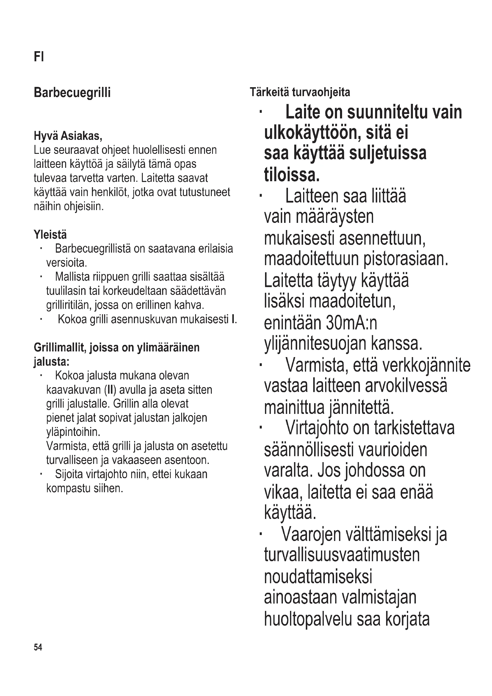 tämän sähkölaitteen ja uusia liitäntäjohdon. Jos vaakaa joudutaan korjaamaan, ota yhteyttä asiakaspalveluosastoomme puhelimitse tai sähköpostitse (katso liite). ∙ Varmista ennen puhdistusta, että grilli on irrotettu virtalähteestä ja että se on kunnolla jäähtynyt. ∙ Sähköiskun välttämiseksi älä upota laitetta veteen äläkä anna sen joutua kosketuksiin veden kanssa. ∙ Pese ritilä kuumassa saippuavedessä tai astianpesukoneessa. Yksityiskohtaisia tietoja laitteen puhdistuksesta on osassa Laitteen puhdistus ja hoito. ∙ Tätä laitetta ei ole tarkoitettu käytettäväksi erillisen ajastimen tai kaukosäätimen kanssa. ∙ Älä koskaan käytä grillissä hiiliä tai muita kiinteitä tai nestemäisiä polttoaineita. ∙ Varoitus: Älä peitä ritilää alumiinikalvolla, grillausastioilla tai muilla esineillä, sillä siitä aiheutuva kuumuus voi vahingoittaa vakavasti grilliä. ∙ Kuvasta näkyy, paljonko grillipannuun saa laittaa vettä. ∙ Tätä laitetta saavat käyttää lapset (vähintään 8-vuotiaat) sekä henkilöt, joilla on fyysisesti, aistillisesti tai henkisesti rajoittunut toimintakyky tai joilla on puuttuvat tai vajavaiset tiedot laitteen toiminnasta, mikäli heitä valvotaan tai ohjataan laitteen käytössä ja he ymmärtävät täysin kaikki56 104 x 142 mm käyttöön liittyvät vaarat ja turvatoimenpiteet. ∙ Lasten ei saa antaa leikkiä laitteella. ∙ Lasten ei saa antaa tehdä laitteen puhdistus- tai huoltotoimenpiteitä, elleivät he ole aikuisen valvonnassa sekä vähintään 8 vuotta vanhoja. ∙ Laite ja sen liitäntäjohto täytyy aina pitää alle 8-vuotiaiden ulottumattomissa. ∙ Varoitus: Pidä lapset poissa pakkausmateriaalien luota potentiaalisen vaaratilanteen esim. tukehtumisvaaran vuoksi. ∙ Ennen käyttöä laite ja mahdolliset lisäosat tulee tarkistaa vaurioiden varalta. Jos laite putoaa kovalle alustalle, sitä ei saa enää käyttää: näkymättömätkin vauriot voivat aiheuttaa vaaratilanteita laitetta käytettäessä. ∙ Käytön aikana parilan on oltava tulenkestävällä, roiskeet ja tahrautumisen kestävällä työtasolla. Rasvaista tai nestepitoista ruokaa valmistettaessa ei aina ole mahdollista välttää roiskumista. ∙ Älä aseta grilliä seinän viereen tai nurkkaan ja varmista, ettei sen lähellä ole tulenarkoja materiaaleja. ∙ Muista, että varsinkin rasvainen ja nestepitoinen ruoka voi syttyä palamaan; täytä sen takia grillipannu aina vedellä ennen käyttöä. Älä kytke grilliä sähköverkkoon ennen kuin olet täyttänyt säiliön vedellä. ∙ Vesi jäähdyttää säiliötä, vähentää savunmuodostusta ja helpottaa puhdistamista. ∙ Varmista, että grillipannun vesimäärä on ”Min”- ja ”Max”-merkintöjen välillä koko käytön ajan. – Veden maksimimäärän merkki – Veden minimimäärän merkki Varmista, että veden pinta on aina “Min”-merkinnän yläpuolella. Lisää vettä hyvissä ajoin ja varmista, ettei se joudu kosketuksiin lämpövastuksen kanssa. Varoitus: Kytke grillin liitäntäjohto irti verkkovirrasta ennen kuin lisäät vettä. ∙ Varmista aina ennen grillin käyttöä, että lämpövastus on asennettuna oikein grillipannuun ja koteloon. Turvakytkin aktivoituu automaattisesti, kun lämpövastus on oikein paikoillaan. Jos lämpövastus on kiinnitetty väärin, laitetta ei voi käynnistää. ∙ Barbecuegrilliä ei saa jättää toimintaan ilman valvontaa. ∙ Muista, että laitteen ulkopinta, lämpövastus ja ritilä ovat käytön aikana erittäin kuumia. Vakavien palovammojen välttämiseksi odota lämpövastuksen sammuttamisen jälkeen, että laite on kunnolla jäähtynyt, ennen kuin kosket siihen.104 x 142 mm