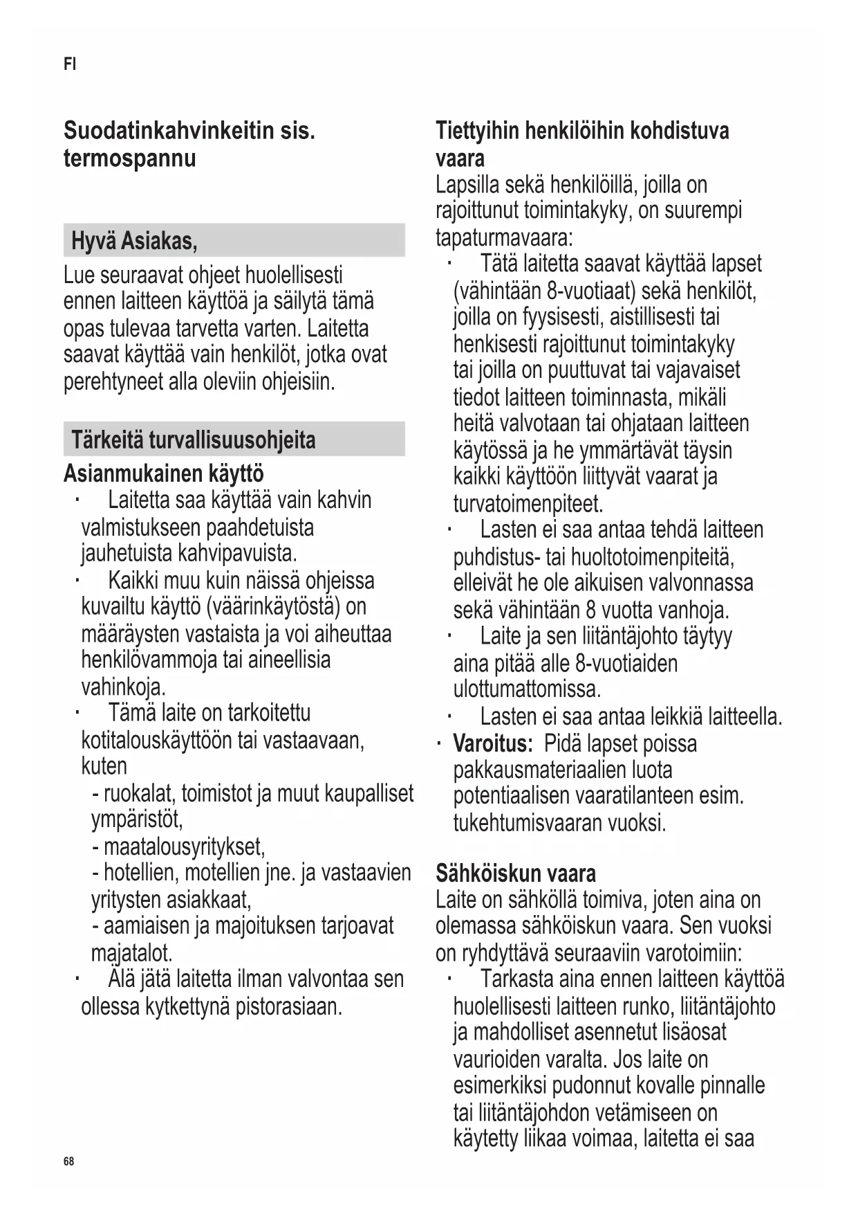 ∙ Sijoita laite aina kuivalle, tasaiselle, veden- ja kuumuudenkestävälle pinnalle, joka kestää kumijalkojen kosketuksen. ∙ Älä käytä laitetta seinään kiinnitetyn kaapin tai vastaavan esineen alla: on olemassa vaara, että poistuva höyry jämähtää sen alapuolelle. ∙ Älä jätä liitäntäjohtoa riippumaan vapaana. ∙ Virtajohtoa ei saa taittaa eikä puristaa. Pidä sekä johto että itse laite etäällä lämmönlähteistä (esim. keittolevyistä, kaasuliekeistä). ∙ Lisää säiliöön vain kylmää hanavettä.70 142 x 208 mm Jos laitteeseen tulee vika Viallinen laite voi aiheuttaa aineellisia vahinkoja ja vammoja