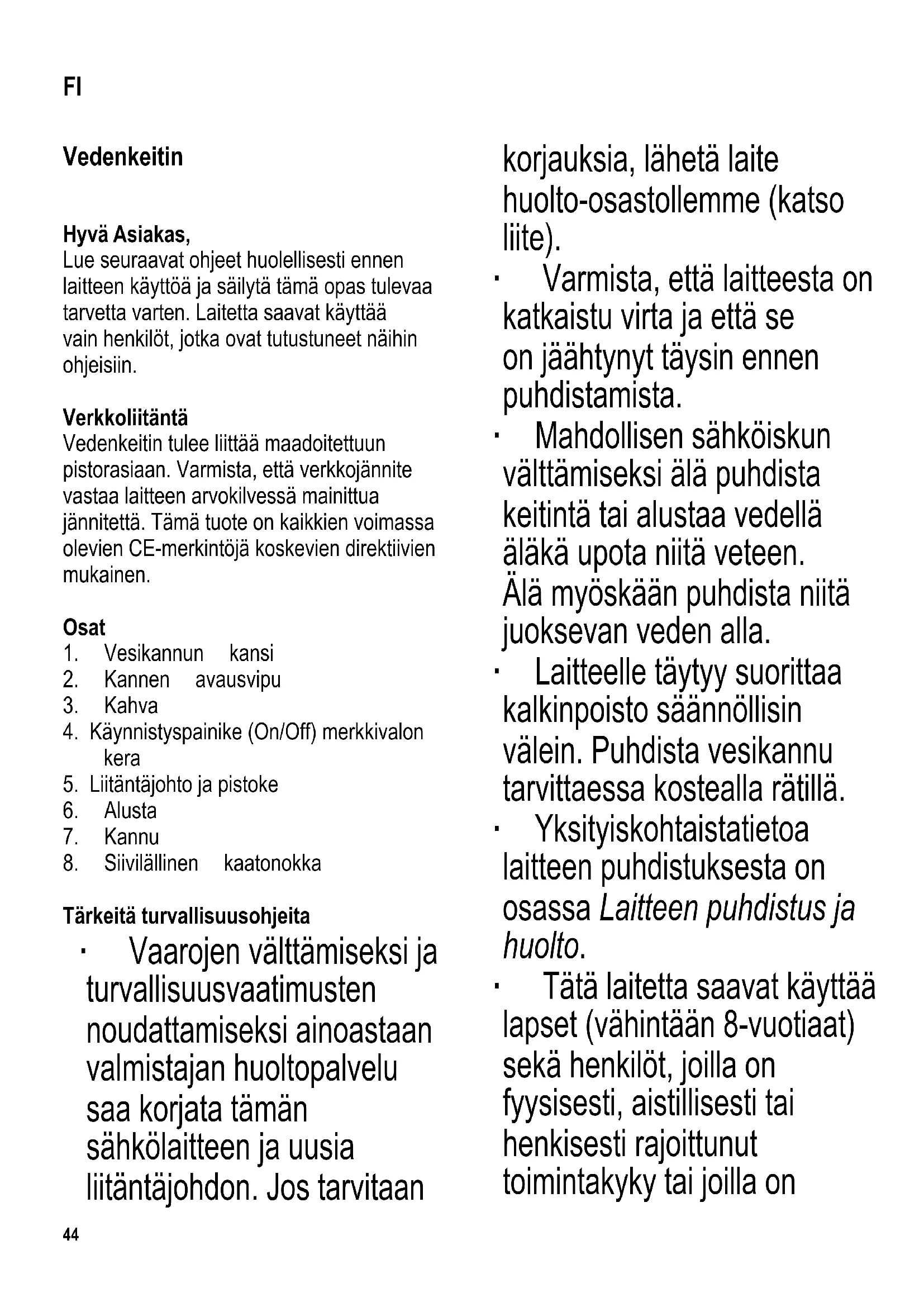 Tärkeitä turvallisuusohjeita ∙ Vaarojen välttämiseksi ja turvallisuusvaatimusten noudattamiseksi ainoastaan valmistajan huoltopalvelu saa korjata tämän sähkölaitteen ja uusia liitäntäjohdon. Jos tarvitaan korjauksia, lähetä laite huolto-osastollemme (katso liite). ∙ Varmista, että laitteesta on katkaistu virta ja että se on jäähtynyt täysin ennen puhdistamista. ∙ Mahdollisen sähköiskun välttämiseksi älä puhdista keitintä tai alustaa vedellä äläkä upota niitä veteen. Älä myöskään puhdista niitä juoksevan veden alla. ∙ Laitteelle täytyy suorittaa kalkinpoisto säännöllisin välein. Puhdista vesikannu tarvittaessa kostealla rätillä. ∙ Yksityiskohtaista tietoa laitteen puhdistuksesta on osassa Laitteen puhdistus ja huolto. ∙ Tätä laitetta saavat käyttää lapset (vähintään 8-vuotiaat) sekä henkilöt, joilla on fyysisesti, aistillisesti tai henkisesti rajoittunut toimintakyky tai joilla on FI45 puuttuvat tai vajavaiset tiedot laitteen toiminnasta, mikäli heitä valvotaan tai ohjataan laitteen käytössä ja he ymmärtävät täysin kaikki käyttöön liittyvät vaarat ja turvatoimenpiteet. ∙ Lasten ei saa antaa leikkiä laitteella. ∙ Lasten ei saa antaa tehdä laitteen puhdistus- tai huoltotoimenpiteitä, elleivät he ole aikuisen valvonnassa sekä vähintään 8 vuotta vanhoja. ∙ Laite ja sen liitäntäjohto täytyy aina pitää alle 8-vuotiaiden ulottumattomissa. ∙ Tämä laite on tarkoitettu kotitalouskäyttöön tai vastaavaan, kuten - ruokalat, toimistot ja muut kaupalliset ympäristöt - maatalousyritykset - hotellien, motellien jne. ja vastaavien yritysten asiakkaat - aamiaisen ja majoituksen tarjoavat majatalot. ∙ Ulkopinnat kuumenevat käytön aikana ja ne pysyvät kuumina jonkin aikaa käytön jälkeen. ∙ Älä jätä vedenkeitintä ilman valvontaa sen ollessa toiminnassa. Käytä vain puhdasta vettä ja huomioi aina minimi- ja maksimitäytön (0,5 l / 1,0 l) merkit kannua täyttäessäsi. Kannun täyttämimen liialla vedellä saattaa aiheuttaa kiehuvan veden valumisen ulos. ∙ Varo myös laitteesta tulevaa kuumaa höyryä. Älä kosketa laitetta käytön aikana kahvaa lukuunottamatta. ∙ Huomaa: Keittämisen aikana ja kuumaa vettä kaadettaessa kansi on aina pidettävä suljettuna. ∙ Keitintä saa käyttää46 ainoastaan mukana toimitetun alustan kanssa. ∙ Älä ota vesikannua koskaan pois alustalta (tai laita sitä takaisin alustalle) virran ollessa kytkettynä laitteeseen. ∙ Alustassa olevat sähköliitännät täytyy aina suojata niin, etteivät niihin pääse vettä. ∙ Varoitus: Väärinkäytöstä saattaa seurata vakavia henkilövammoja. ∙ Varoitus: Pidä lapset poissa pakkausmateriaalien luota potentiaalisen vaaratilanteen esim. tukehtumisvaaran vuoksi. ∙ Tarkasta aina ennen laitteen käyttöä huolellisesti laitteen runko, liitäntäjohto ja mahdolliset asennetut lisäosat vaurioiden varalta. Jos laite on esimerkiksi pudonnut kovalle pinnalle tai liitäntäjohdon vetämiseen on käytetty liikaa voimaa, laitetta ei saa enää käyttää: näkymättömätkin vauriot voivat aiheuttaa laitetta käytettäessä vaaratilanteita. ∙ Laitetta saa käyttää vain tasaisella, kuumuutta kestävällä pinnalla. ∙ Älä käytä laitetta seinään kiinnitetyn kaapin tai vastaavan esineen alla: on olemassa vaara, että poistuva höyry jämähtää sen alapuolelle. ∙ Varo, ettei liitäntäjohto tai kannu kosketa avoliekkiä tai kuumia pintoja (esim. lieden keittolevyjä). ∙ Älä jätä liitäntäjohtoa roikkumaan äläkä anna sen koskettaa kannun kuumia osia. ∙ Irrota pistotulppa pistorasiasta aina - käytön jälkeen - jos laitteessa on käyttöhäiriö - ennen laitteen puhdistamista ∙ Jos laite vahingoittuu väärinkäytön seurauksena tai siksi, että annettuja ohjeita ei ole noudatettu, valmistaja ei vastaa aiheutuneista vahingoista. Automaattinen virrankatkaisu Esiasetettu automaattinen turvakytkin suojaa lämpövastusta ylikuumenemiselta, jos laitteeseen kytketään vahingossa virta sen ollessa ilman vettä tai jos kuumalevyyn on kerääntynyt kalkkia. Kun turvakytkin on katkaissut keittimestä virran, laitteen on annettava jäähtyä riittävästi tai siitä on poistettava kalkkisaostuma ennen verkkoon kytkemistä. Ennen käyttöä Täydellisen puhtauden varmistamiseksi kaada pois ensimmäinen kannullinen keitettyä vettä. Veden keittäminen ∙ Ota kannu pois alustalta. ∙ Paina kannen avausvipua kahvasta, avaa kansi ja lisää kannuun haluamasi määrä vettä. Huomioi tuolloin minimi- (Min) (0,5 l) ja maksimitäytön merkit (Max) (1,0 l). ∙ Sulje kansi ja sijoita vesikannu takaisin sen alustalle. ∙ Työnnä pistotulppa sopivaan pistorasiaan ja paina käynnistyspainiketta (On/Off). Merkkivalo syttyy.47 ∙ Vedenkeitto alkaa. Kun vesi saavuttaa kiehumispisteen, sisäänrakennettu kytkin katkaisee keittimestä virran automaattisesti. Merkkivalo sammuu. ∙ Jos haluat keskeyttää vedenkeiton, aseta käynnistyskytkin Off-asentoon. ∙ Kun haluat kaataa kuumaa vettä, ota kannu pois alustalta. ∙ Kuuman höyryn ulostulon estämiseksi varmista, että kansi pysyy kiinni vettä kaadettaessa. ∙ Irrota pistotulppa pistorasiasta käytön jälkeen. ∙ Älä jätä yhtään vettä kannuun. Kelattavan liitäntäjohdon säilytystila Alustan pohjassa oleva kelattavan liitäntäjohdon säilytystila helpottaa laitteen varastoimista sekä johdon pituuden säätelyä käytön aikana. Kalkinpoisto ∙ Paikallisen veden laadusta riippuen vastukseen saattaa kertyä kalkkia, joka tulee poistaa säännöllisin väliajoin. ∙ Kaikki takuuvaatimukset mitätöityvät, jos laitteen vika johtuu riittämättömästä kalkinpoistosta. ∙ Tarkoitukseen sopii seos, jossa on 0,5 litraa vettä ja 40 ml väkevää etikkaa. ∙ Kaada kannuun seos kalkin poistamiseksi. ∙ Kytke laitteeseen virta ja keitä kiehumispisteeseen. ∙ Anna seoksen vaikuttaa lyhyen aikaa. ∙ Puhdista kannu kalkin poiston jälkeen hu
