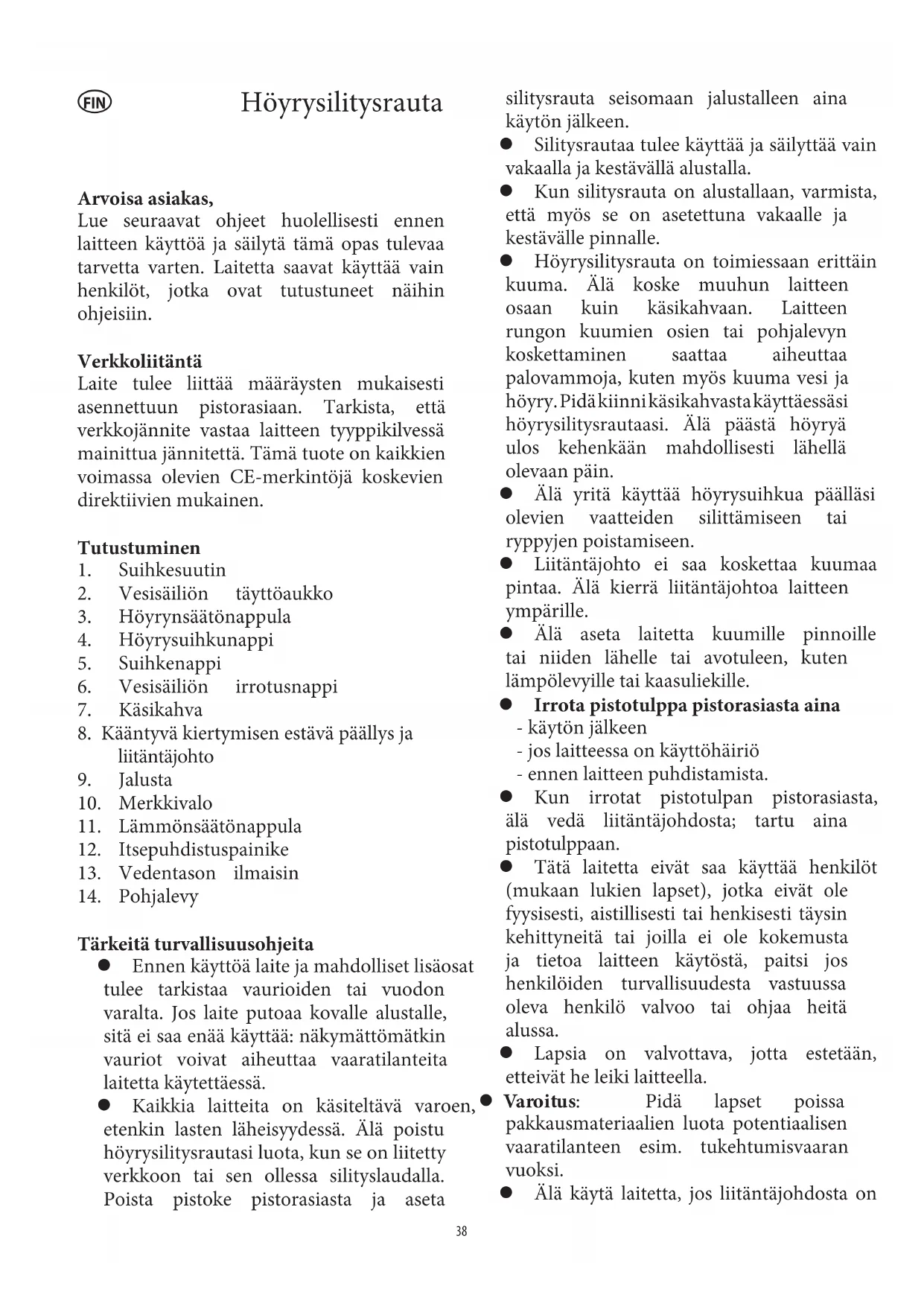 Tärkeitä turvallisuusohjeita Ennen käyttöä laite ja mahdolliset lisäosat tulee tarkistaa vaurioiden tai vuodon varalta. Jos laite putoaa kovalle alustalle, sitä ei saa enää käyttää: näkymättömätkin vauriot voivat aiheuttaa vaaratilanteita laitetta käytettäessä. Kaikkia laitteita on käsiteltävä varoen, etenkin lasten läheisyydessä. Älä poistu höyrysilitysrautasi luota, kun se on liitetty verkkoon tai sen ollessa silityslaudalla. Poista pistoke pistorasiasta ja aseta silitysrauta seisomaan jalustalleen aina käytön jälkeen. Silitysrautaa tulee käyttää ja säilyttää vain vakaalla ja kestävällä alustalla. Kun silitysrauta on alustallaan, varmista, että myös se on asetettuna vakaalle ja kestävälle pinnalle. Höyrysilitysrauta on toimiessaan erittäin kuuma. Älä koske muuhun laitteen osaan kuin käsikahvaan. Laitteen rungon kuumien osien tai pohjalevyn koskettaminen saattaa aiheuttaa palovammoja, kuten myös kuuma vesi ja höyry. Pidä kiinni käsikahvasta käyttäessäsi höyrysilitysrautaasi. Älä päästä höyryä ulos kehenkään mahdollisesti lähellä olevaan päin. Älä yritä käyttää höyrysuihkua päälläsi olevien vaatteiden silittämiseen tai ryppyjen poistamiseen. Liitäntäjohto ei saa koskettaa kuumaa pintaa. Älä kierrä liitäntäjohtoa laitteen ympärille. Älä aseta laitetta kuumille pinnoille tai niiden lähelle tai avotuleen, kuten lämpölevyille tai kaasuliekille. Irrota pistotulppa pistorasiasta aina - käytön jälkeen - jos laitteessa on käyttöhäiriö - ennen laitteen puhdistamista. Kun irrotat pistotulpan pistorasiasta, älä vedä liitäntäjohdosta; tartu aina pistotulppaan. Tätä laitetta eivät saa käyttää henkilöt (mukaan lukien lapset), jotka eivät ole fyysisesti, aistillisesti tai henkisesti täysin kehittyneitä tai joilla ei ole kokemusta ja tietoa laitteen käytöstä, paitsi jos henkilöiden turvallisuudesta vastuussa oleva henkilö valvoo tai ohjaa heitä alussa. Lapsia on valvottava, jotta estetään, etteivät he leiki laitteella. Va ro i tu s: Pidä lapset poissa pakkausmateriaalien luota potentiaalisen vaaratilanteen esim. tukehtumisvaaran vuoksi. Älä käytä laitetta, jos liitäntäjohdosta on