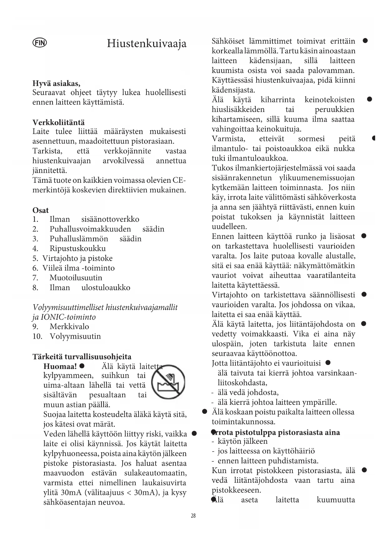 Tärkeitä turvallisuusohjeita Huomaa! z Älä käytä laitetta kylpyammeen, suihkun tai uima-altaan lähellä tai vettä sisältävän pesualtaan tai muun astian päällä. Suojaa laitetta kosteudelta äläkä käytä sitä, jos kätesi ovat märät. Veden lähellä käyttöön liittyy riski, vaikka z laite ei olisi käynnissä. Jos käytät laitetta kylpyhuoneessa, poista aina käytön jälkeen pistoke pistorasiasta. Jos haluat asentaa maavuodon estävän sulakeautomaatin, varmista ettei nimellinen laukaisuvirta ylitä 30mA (välitaajuus < 30mA), ja kysy sähköasentajan neuvoa. Sähköiset lämmittimet toimivat erittäin z korkealla lämmöllä. Tartu käsin ainoastaan laitteen kädensijaan, sillä laitteen kuumista osista voi saada palovamman. Käyttäessäsi hiustenkuivaajaa, pidä kiinni kädensijasta. Älä käytä kiharrinta keinotekoisten z hiuslisäkkeiden tai peruukkien kihartamiseen, sillä kuuma ilma saattaa vahingoittaa keinokuituja. Varmista, etteivät sormesi peitä z ilmantulo- tai poistoaukkoa eikä nukka tuki ilmantuloaukkoa. Tukos ilmankiertojärjestelmässä voi saada sisäänrakennetun ylikuumenemissuojan kytkemään laitteen toiminnasta. Jos niin käy, irrota laite välittömästi sähköverkosta ja anna sen jäähtyä riittävästi, ennen kuin poistat tukoksen ja käynnistät laitteen uudelleen. Ennen laitteen käyttöä runko ja lisäosat z on tarkastettava huolellisesti vaurioiden varalta. Jos laite putoaa kovalle alustalle, sitä ei saa enää käyttää: näkymättömätkin vauriot voivat aiheuttaa vaaratilanteita laitetta käytettäessä. Virtajohto on tarkistettava säännöllisesti z vaurioiden varalta. Jos johdossa on vikaa, laitetta ei saa enää käyttää. Älä käytä laitetta, jos liitäntäjohdosta on z vedetty voimakkaasti. Vika ei aina näy ulospäin, joten tarkistuta laite ennen seuraavaa käyttöönottoa. Jotta liitäntäjohto ei vaurioituisi z älä taivuta tai kierrä johtoa varsinkaan - liitoskohdasta, älä vedä johdosta, - älä kierrä johtoa laitteen ympärille. - Älä koskaan poistu paikalta laitteen ollessa z toimintakunnossa. Irrota pistotulppa pistorasiasta aina z käytön jälkeen - jos laitteessa on käyttöhäiriö - ennen laitteen puhdistamista. - Kun irrotat pistokkeen pistorasiasta, älä z vedä liitäntäjohdosta vaan tartu aina pistokkeeseen. Älä aseta laitetta kuumuutta z