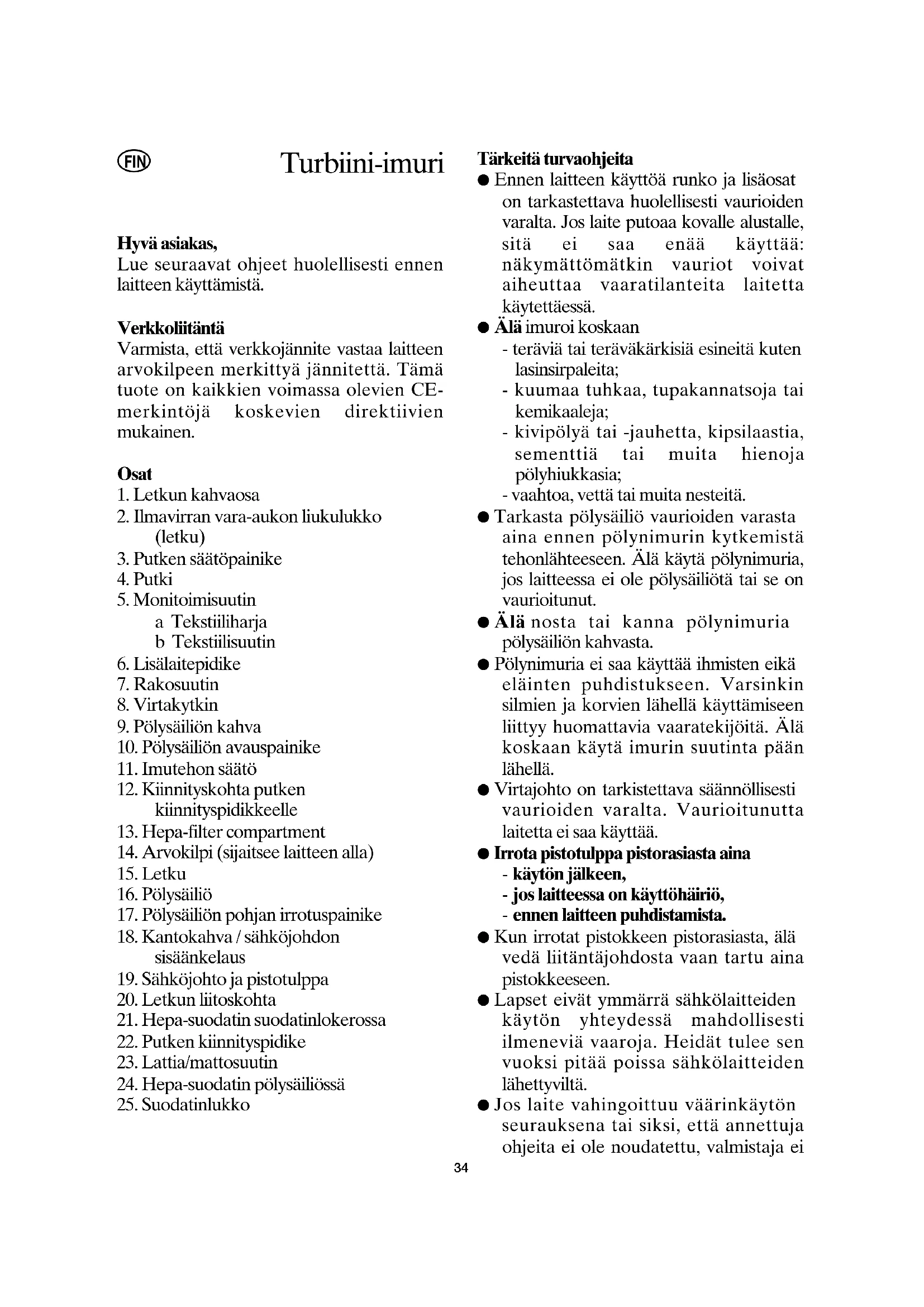 Tärkeitä turvaohjeita ● Ennen laitteen käyttöä runko ja lisäosat on tarkastettava huolellisesti vaurioiden varalta. Jos laite putoaa kovalle alustalle, sitä ei saa enää käyttää: näkymättömätkin vauriot voivat aiheuttaa vaaratilanteita laitetta käytettäessä. ● Älä imuroi koskaan - teräviä tai teräväkärkisiä esineitä kuten lasinsirpaleita; - kuumaa tuhkaa, tupakannatsoja tai kemikaaleja; - kivipölyä tai -jauhetta, kipsilaastia, sementtiä tai muita hienoja pölyhiukkasia; - vaahtoa, vettä tai muita nesteitä. ● Tarkasta pölysäiliö vaurioiden varasta aina ennen pölynimurin kytkemistä tehonlähteeseen. Älä käytä pölynimuria, jos laitteessa ei ole pölysäiliötä tai se on vaurioitunut. ● Älä nosta tai kanna pölynimuria pölysäiliön kahvasta. ● Pölynimuria ei saa käyttää ihmisten eikä eläinten puhdistukseen. Varsinkin silmien ja korvien lähellä käyttämiseen liittyy huomattavia vaaratekijöitä. Älä koskaan käytä imurin suutinta pään lähellä. ● Virtajohto on tarkistettava säännöllisesti vaurioiden varalta. Vaurioitunutta laitetta ei saa käyttää. ● Irrota pistotulppa pistorasiasta aina - käytön jälkeen, - jos laitteessa on käyttöhäiriö, - ennen laitteen puhdistamista. ● Kun irrotat pistokkeen pistorasiasta, älä vedä liitäntäjohdosta vaan tartu aina pistokkeeseen. ● Lapset eivät ymmärrä sähkölaitteiden käytön yhteydessä mahdollisesti ilmeneviä vaaroja. Heidät tulee sen vuoksi pitää poissa sähkölaitteiden lähettyviltä. ● Jos laite vahingoittuu väärinkäytön seurauksena tai siksi, että annettuja ohjeita ei ole noudatettu, valmistaja ei