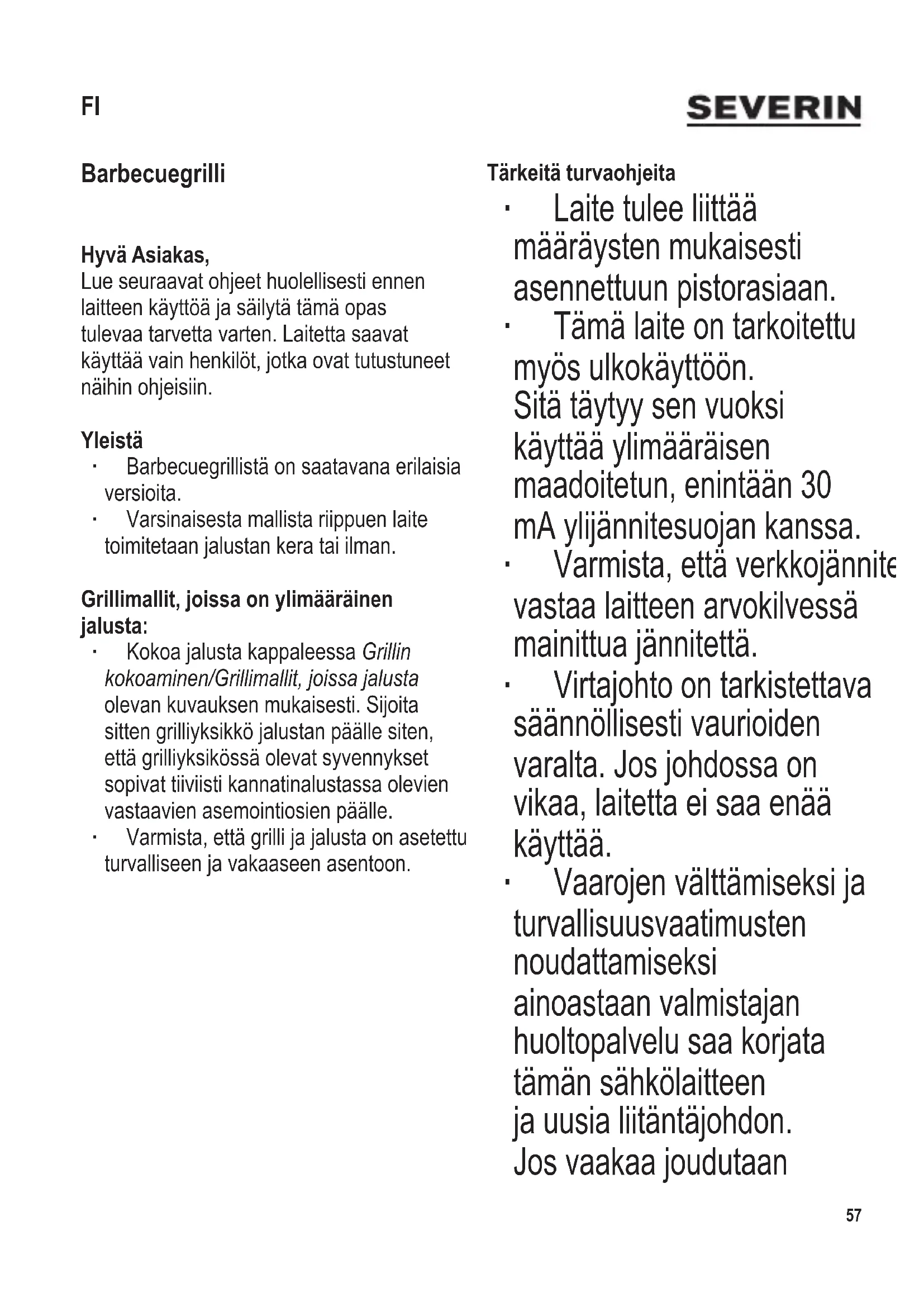 Barbecuegrilli Hyvä Asiakas, Lue seuraavat ohjeet huolellisesti ennen laitteen käyttöä ja säilytä tämä opas tulevaa tarvetta varten. Laitetta saavat käyttää vain henkilöt, jotka ovat tutustuneet näihin ohjeisiin. Yleistä ∙ Barbecuegrillistä on saatavana erilaisia versioita. ∙ Varsinaisesta mallista riippuen laite toimitetaan jalustan kera tai ilman. Grillimallit, joissa on ylimääräinen jalusta: ∙ Kokoa jalusta kappaleessa Grillin kokoaminen/Grillimallit, joissa jalusta olevan kuvauksen mukaisesti. Sijoita sitten grilliyksikkö jalustan päälle siten, että grilliyksikössä olevat syvennykset sopivat tiiviisti kannatinalustassa olevien vastaavien asemointiosien päälle. ∙ Varmista, että grilli ja jalusta on asetettu turvalliseen ja vakaaseen asentoon. Tärkeitä turvaohjeita ∙ Laite tulee liittää määräysten mukaisesti asennettuun pistorasiaan. ∙ Tämä laite on tarkoitettu myös ulkokäyttöön. Sitä täytyy sen vuoksi käyttää ylimääräisen maadoitetun, enintään 30 mA ylijännitesuojan kanssa. ∙ Varmista, että verkkojännite vastaa laitteen arvokilvessä mainittua jännitettä. ∙ Virtajohto on tarkistettava säännöllisesti vaurioiden varalta. Jos johdossa on vikaa, laitetta ei saa enää käyttää. ∙ Vaarojen välttämiseksi ja turvallisuusvaatimusten noudattamiseksi ainoastaan valmistajan huoltopalvelu saa korjata tämän sähkölaitteen ja uusia liitäntäjohdon. Jos vaakaa joudutaan FI58 104 x 142 mm korjaamaan, ota yhteyttä asiakaspalveluosastoomme puhelimitse tai sähköpostitse (katso liite). ∙ Tätä laitetta ei ole tarkoitettu käytettäväksi erillisen ajastimen tai kaukosäätimen kanssa. ∙ Varoitus: Älä koskaan käytä grillissä hiiliä tai muita kiinteitä tai nestemäisiä polttoaineita. ∙ Älä laita grilliin nesteitä.