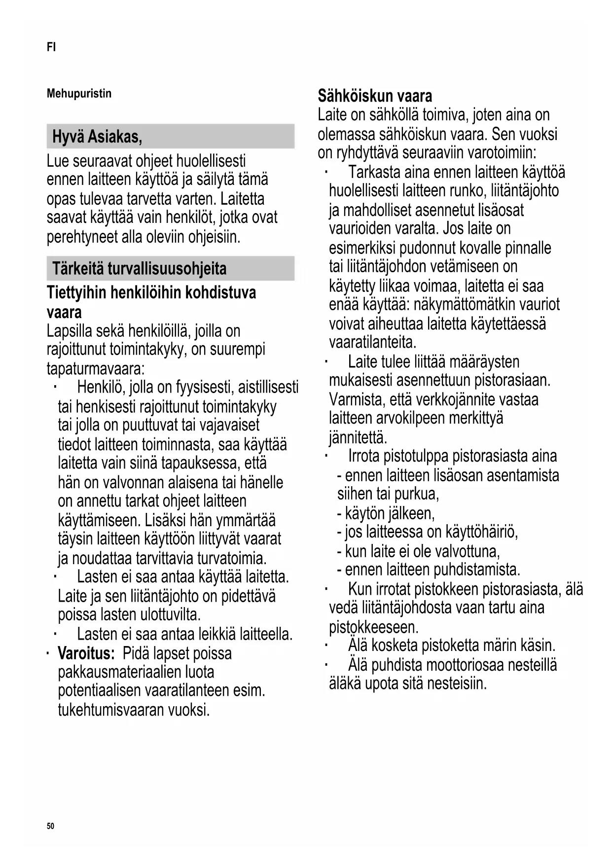 ∙ Odota, kunnes kaikki osat ovat täysin pysähtyneitä ennen syöttösuppilon poistamista paikaltaan. Hygienian puute Hygienian puute voi aiheuttaa bakteerien muodostumista laitteen sisälle
