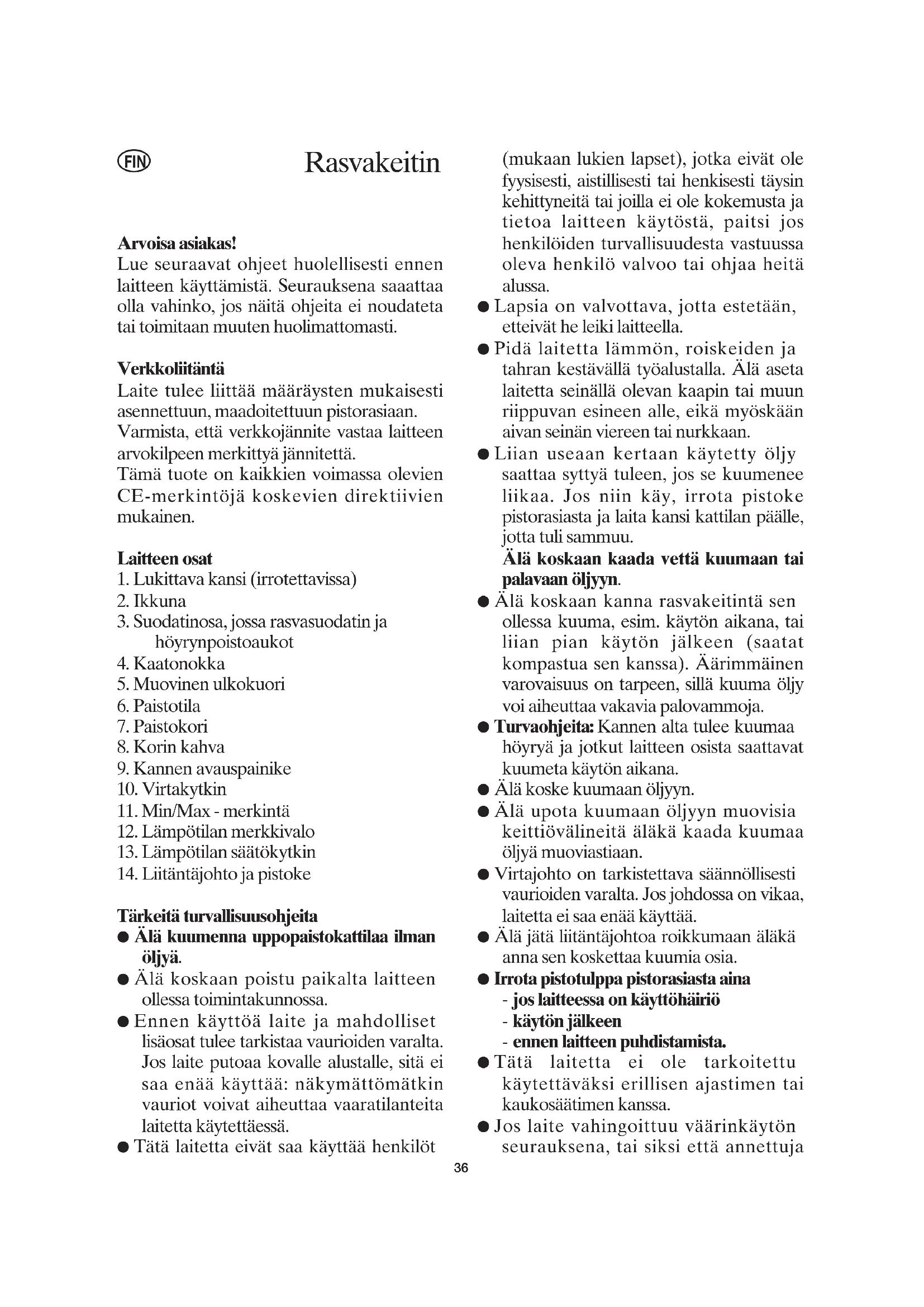 FINohjeita ei ole noudatettu, valmistaja ei vastaa aiheutuneista vahingoista. ● Tämä rasvakeitin on tarkoitettu tavalliseen kotikäyttöön, eikä se näin ollen sovellu ammattimaiseen käyttöön. ● Turvallisuusmääräykset vaativat, että sähkölaitteen saa korjata ja liitäntäjohdon uusia ainoastaan alan ammattilainen. Näin vältytään vaarallisilta tilanteilta. Laitteen toiminta Kansi (1) Avaa kansi painamalla avauspainiketta. Kannessa on jousitoiminto ja se nousee automaattisesti ylös painiketta painettaessa. Sulje kansi painamalla sitä alaspäin, kunnes se lukkiutuu paikoilleen. Kun avonainen kansi on pystysuorassa asennossa, voit poistaa sen puhdistusta varten ylöspäin vetämällä. Ikkuna (2) Ikkunan kautta voit valvoa kypsennysprosessia. Lisäämällä hieman öljyä ikkunan sisäpuolelle estät höyryn muodostumisen sen pintaan. Paistotila (6) Kuumennettaessa öljyn on ulotuttava paistotilan sisäpuolella olevien minimi- ja maksimi-merkkien välille. Astian suurin tilavuus on noin 1,5 litraa. Ennen kuin säiliö täytetään tarvittavalla öljymäärällä, ota pois paistokori. Paistokori (7) Öljyssä keitettävät ruoka-aineet tulee asettaa paistokoriin. Kun olet asettanut korin paistotilaan ja sulkenut kannen, voit laskea korin kuumaan öljyyn käyttämällä ulkopuolella olevaa kahvaa. Laske paistokori painamalla kahvassa olevaa painiketta ja siirrä kahvaa alaspäin. Nosta kori kuumasta öljystä siirtämällä kahvaa ylöspäin kunnes se lukkiutuu paikoilleen vaakasuoraan asentoon. Lämpötilan merkkivalo (12) Lämpötilan merkkivalo sammuu, kun valittu lämpötila on saavutettu. Heti kun lämpötila laskee tietyn rajan alle, valo syttyy uudestaan ja öljy alkaa jälleen kuumeta. Lämpötilan säätökytkin (13) Lämpötilan säätökytkintä käytetään halutun lämpötilan valitsemiseen. Ennen ensikäyttöä Ennen kuin käytät laitetta ensimmäisen kerran, puhdista paistotila ja kannen sisäpuoli kostealla kankaalla. Varmista, että pistoke on irrotettu pistorasiasta. Poista paistokori ja puhdista se huolellisesti kuumalla vedellä. Estääksesi veden sekoittumisen öljyyn, varmista että kaikki osat ovat kunnolla kuivuneet ennen kuin täytät säiliön noin 1,5 litralla kasvisöljyä. Käyttö