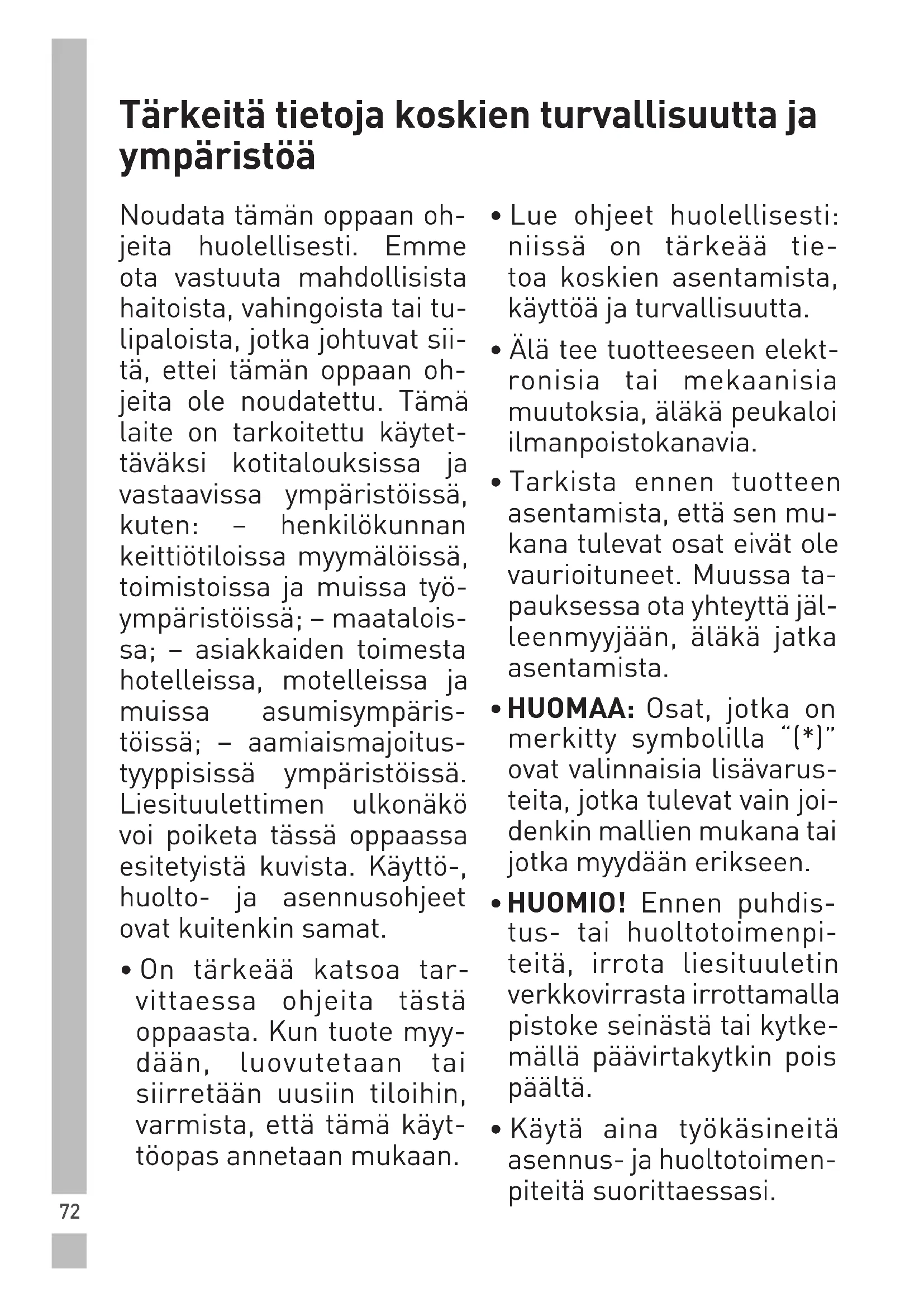 PL72 Tärkeitä tietoja koskien turvallisuutta ja ympäristöä Noudata tämän oppaan oh- jeita huolellisesti. Emme ota vastuuta mahdollisista haitoista, vahingoista tai tu- lipaloista, jotka johtuvat sii- tä, ettei tämän oppaan oh- jeita ole noudatettu. Tämä laite on tarkoitettu käytet- täväksi kotitalouksissa ja vastaavissa ympäristöissä, kuten: – henkilökunnan keittiötiloissa myymälöissä, toimistoissa ja muissa työ- ympäristöissä; – maatalois- sa; – asiakkaiden toimesta hotelleissa, motelleissa ja muissa asumisympäris- töissä; – aamiaismajoitus- tyyppisissä ympäristöissä. Liesituulettimen ulkonäkö voi poiketa tässä oppaassa esitetyistä kuvista. Käyttö-, huolto- ja asennusohjeet ovat kuitenkin samat.