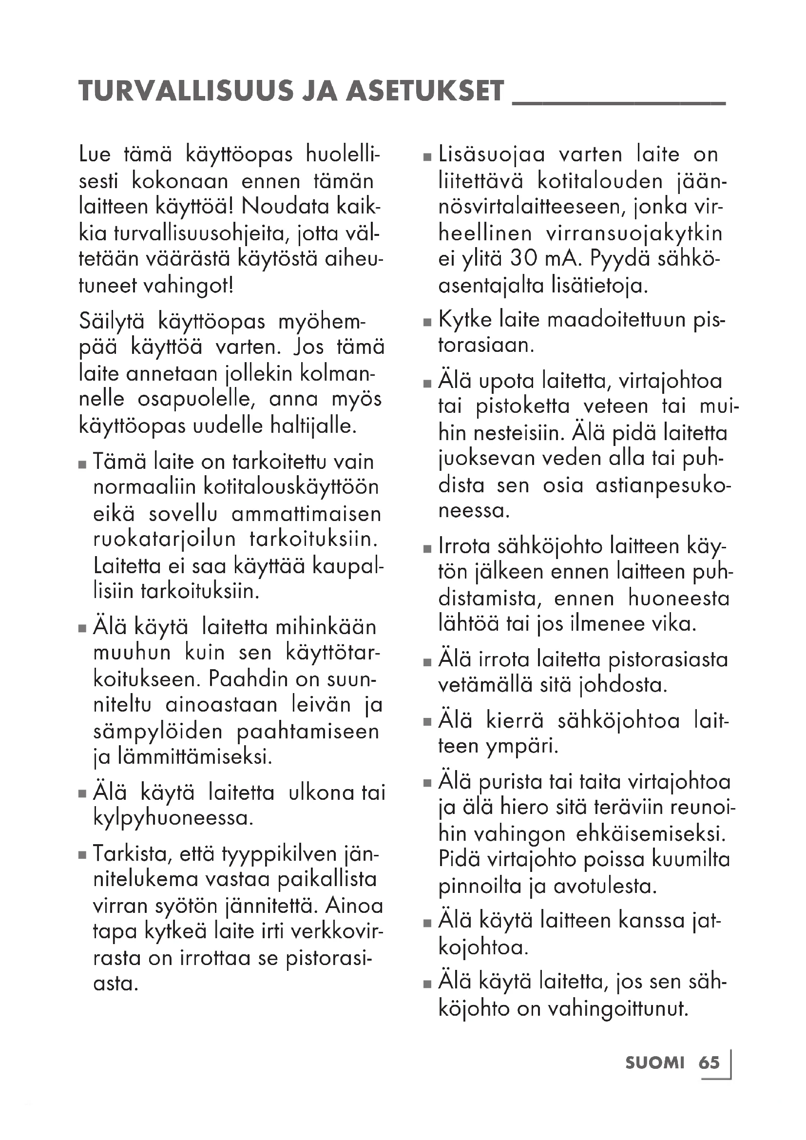 Lisäsuojaa varten laite on liitettävä kotitalouden jään- nösvirtalaitteeseen, jonka vir- heellinen virransuojakytkin ei ylitä 30 mA. Pyydä sähkö- asentajalta lisätietoja.